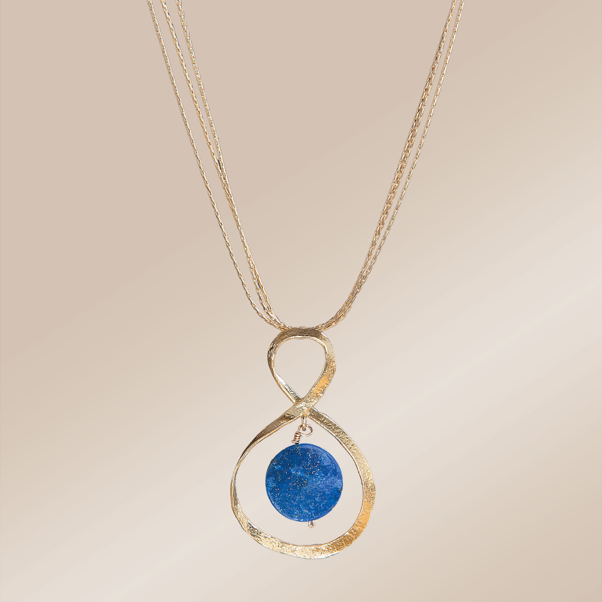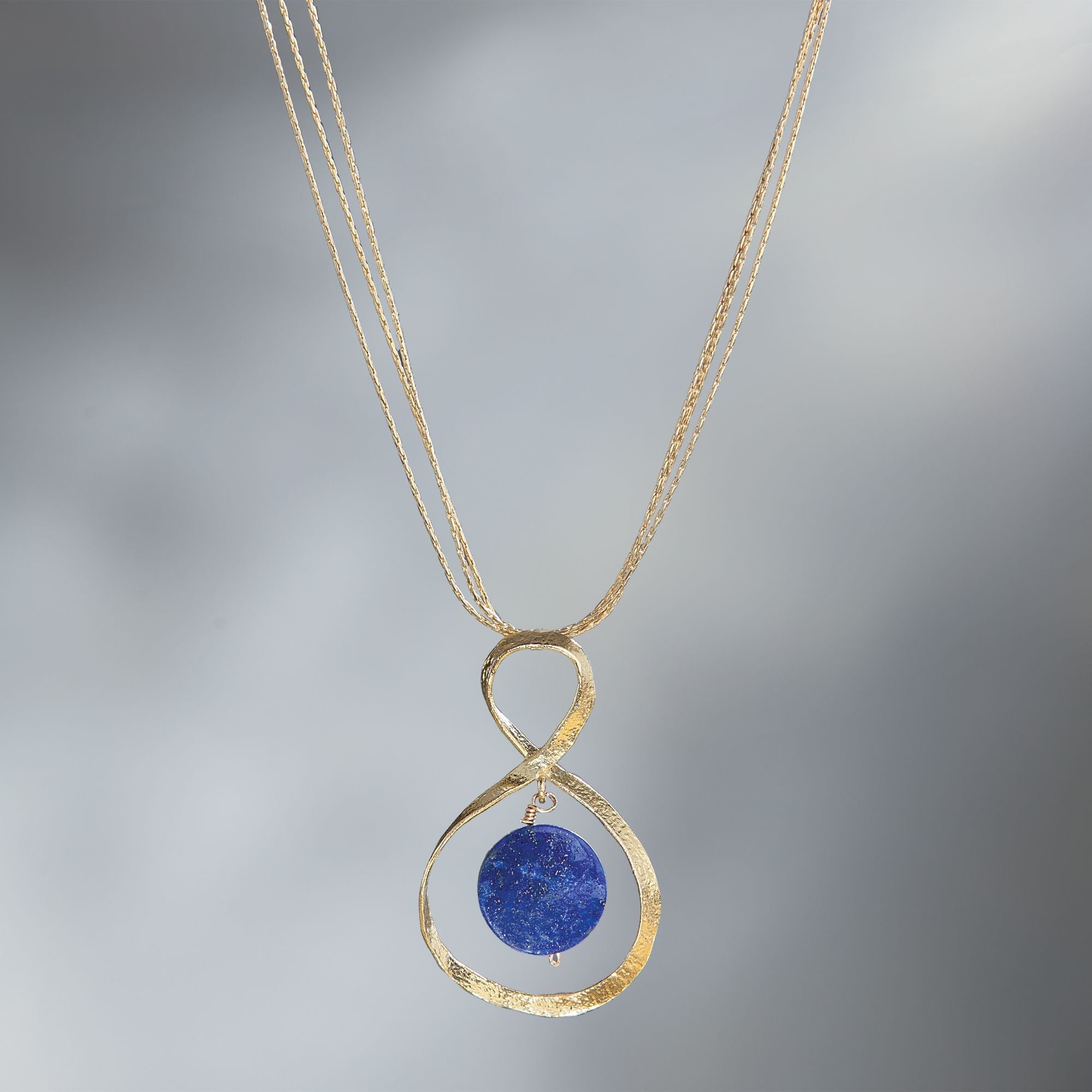 This unique necklace is handcrafted by Avi, our Israeli jeweler. Featuring striking blue lapis stones and sterling silver overlaid with 14k gold, Avi takes materials with sharp contrast and joins them in a sophisticated and organic form. Handcrafted exclusively for Uno Alla Volta, from the heart and hands of the artisan. Dimensions - 17 inches long, 2 inch extender, 2 inch pendant, lobster clasp.