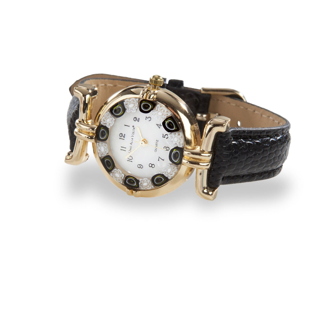 The techniques of Murano glassmaking are renowned across the world. This Murano glass millefiori watch, with a mother-of-pearl face, black genuine leather band, and gold-plated findings, bears a ''timeless'' Italian charm! From the Latin saying for ''thousand flowers,'' millefiori designs are intricate floral mosaics. Handcrafted exclusively for Uno Alla Volta, from the hearts and hands of the artisans. Handcrafted exclusively for Uno Alla Volta, from the hearts and hands of the artisans. Dimensions - Approximately 9.5 inches long, 1 inch diameter face.