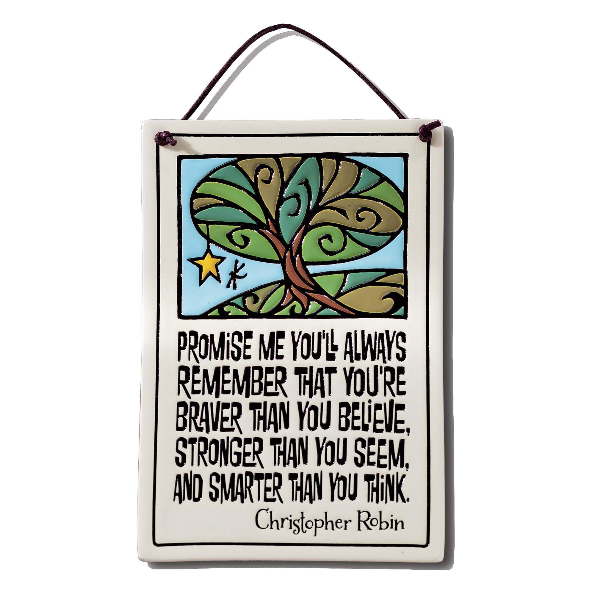 In his Wisconsin studio, Michael works with his sons and son in law to hand-etch inspirational messages into wall plaques, such as this ''Promise Me'' plaque. It reads: ''Promise me you'll always remember that you're braver than you believe, stronger than you seem, and smarter than you think.'' Together, they hand-carve the message onto each ceramic plaque before firing at nearly 2000 degrees Fahrenheit. Each ''Promise Me'' inspirational ceramic wall plaque comes with cord for hanging, measures 5 inches by 7.25 inches. No two are exactly alike.