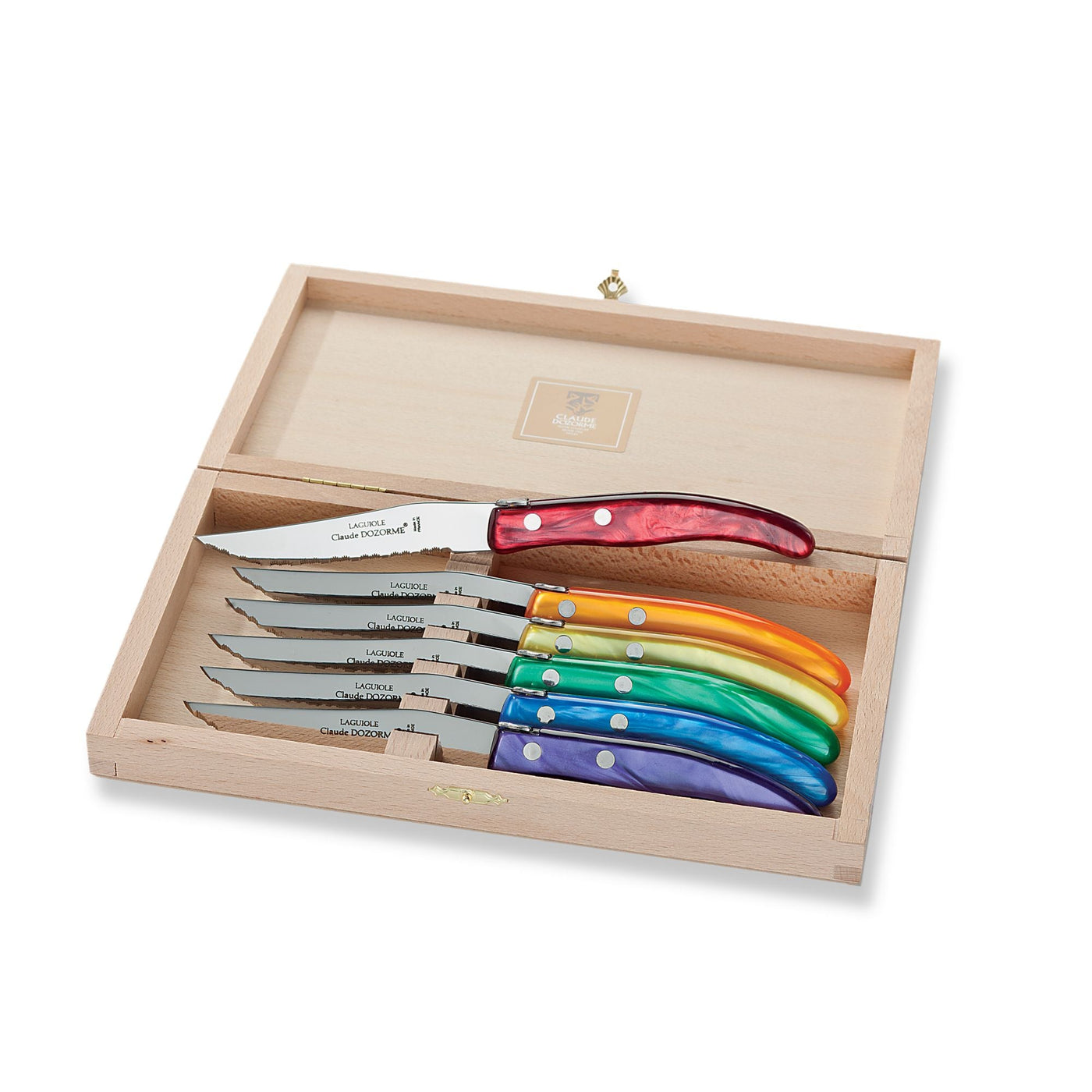 In Thiers, France, Claudine carries on the knife making tradition of her grandfather with this rainbow French Dozorme knife set. Her sleek knife designs have been customer favorites for many years. Stainless steel blades, acrylic handles. Dishwasher safe. Set of six. Handcrafted exclusively for Uno Alla Volta, from the heart and hands of the artisan. Dimensions - Each knife has a 4 inch long blade and a 4.25 inch long handle. Box measures 3.5 inches by 10 inches.