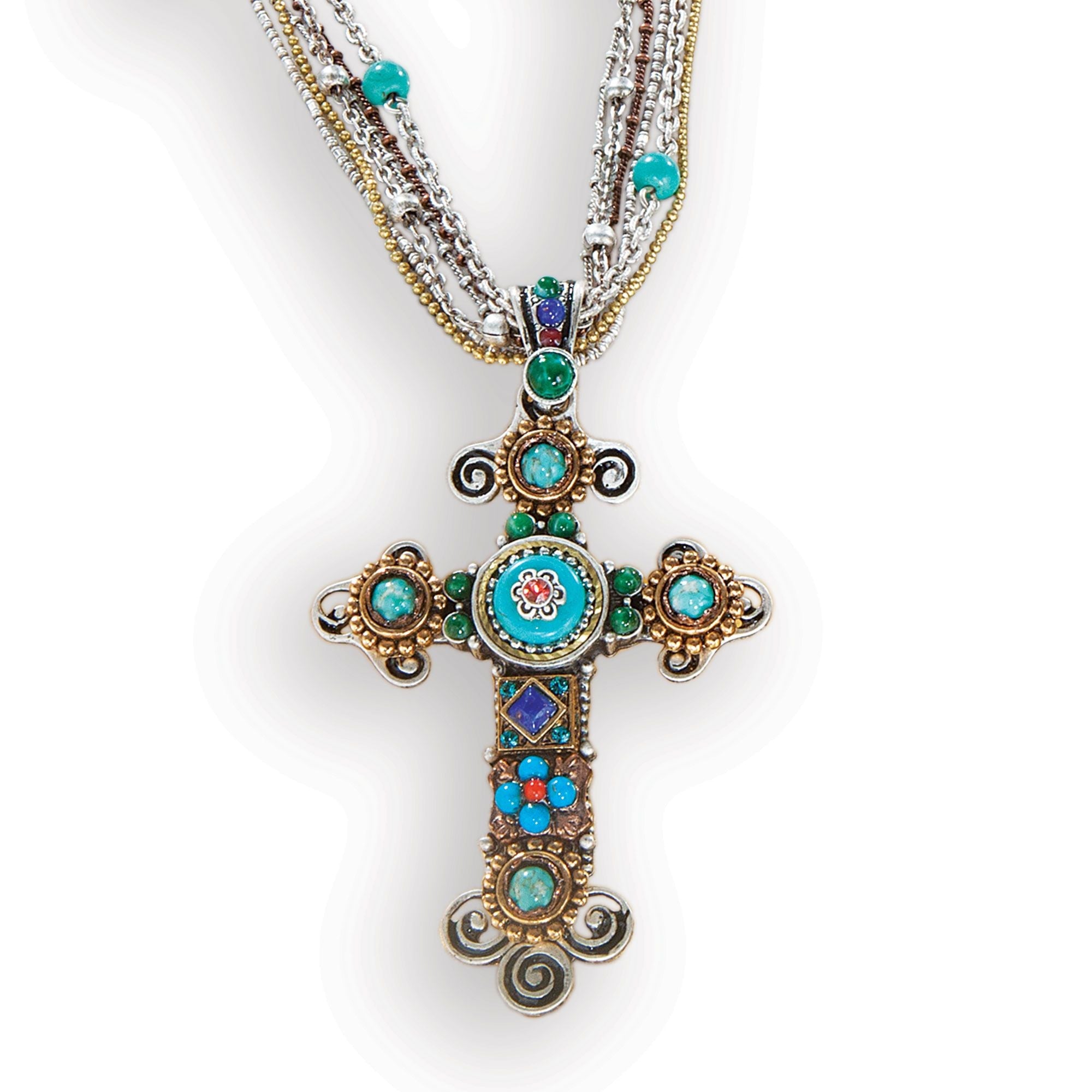 Shelley takes to her Los Angeles studio to design stunning works of wearable art. Her designs are inspired by the style and spirit of times passed, creating an unmistakable sense of nostalgia as she interprets fashion trends of today. Drawing inspiration from the dramatic style of the Baroque era, Shelley spares no detail as she handcrafts this multi-strand cross necklace from silver, pewter, and gold, and then embellishes it with hand-set turquoise, magnesite, coral, and lapis. Handcrafted for Uno Alla Volta, from the heart and hands of the artisan. Dimensions - 24 inches long, 3 inch extender, 3.5 inch cross, lobster clasp.