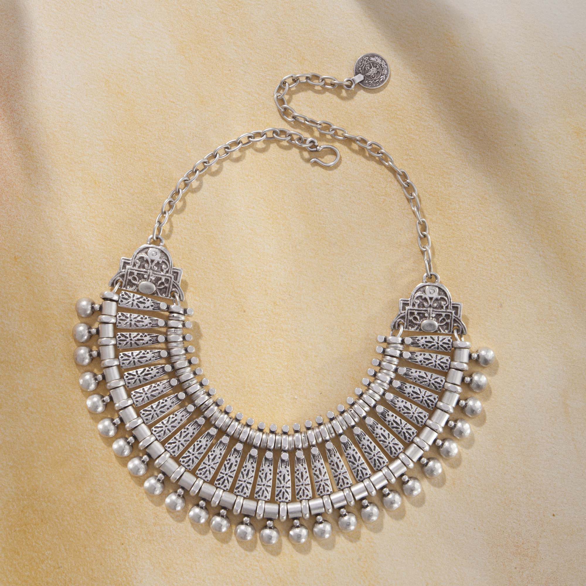 Our Turkish jewelers bring a modern sensibility to this richly textured pewter bib necklace based on centuries-old Ottoman designs. Each contemporary Turkish textured pewter bib necklace is handcrafted uno alla volta in Istanbul, measures 16.25 inches long with a 2 inch bib, hook clasp.