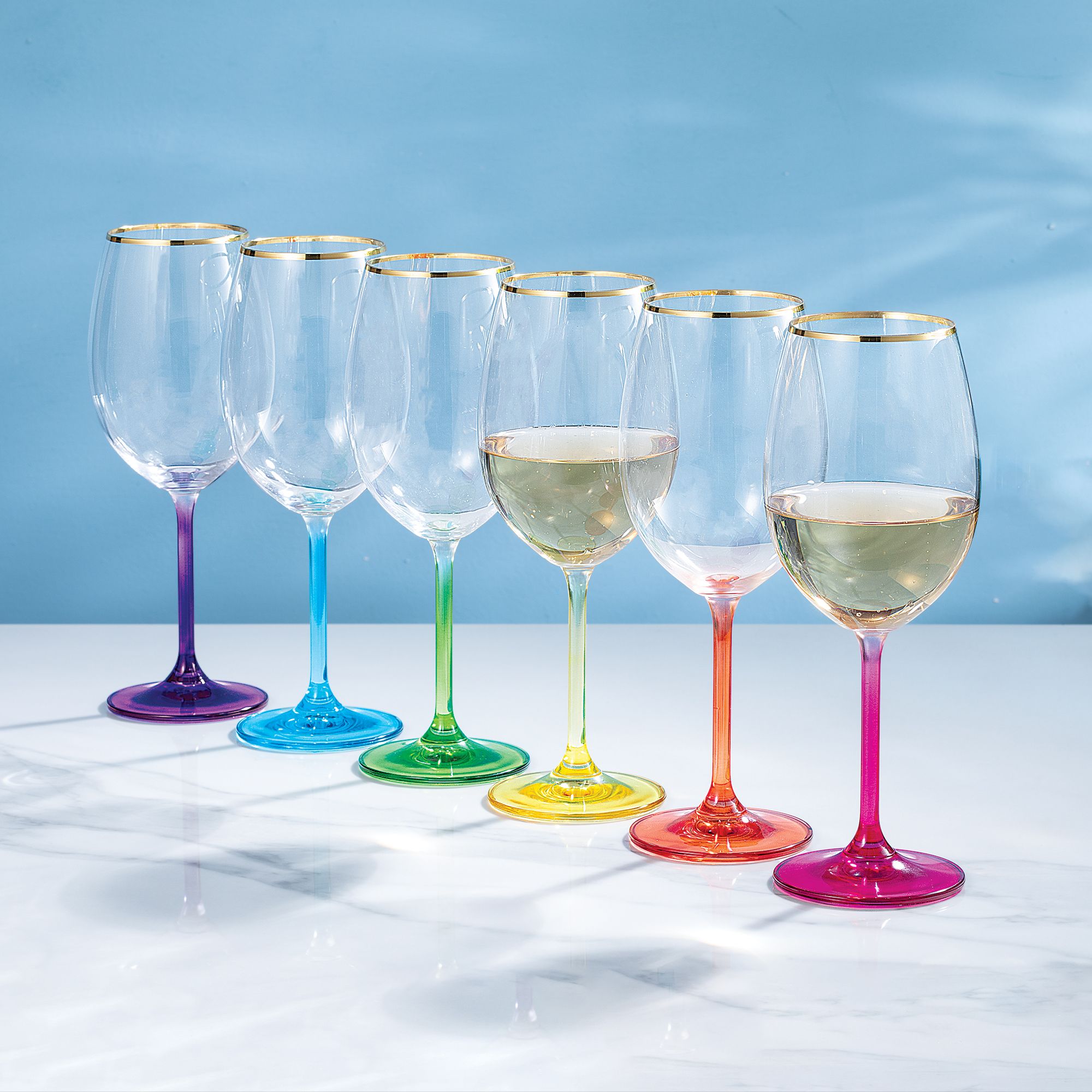 I love the fact that the stems are different colors. Now instead of having to use "charms" to identify whose glass is whose each person will know which glass is his or hers because of the different colors. I wish the glass were not so tall though. They hold a bit more wine than my regular glasses. Also I had quite a time removing the stickers on the glasses. Perhaps you could do without them??