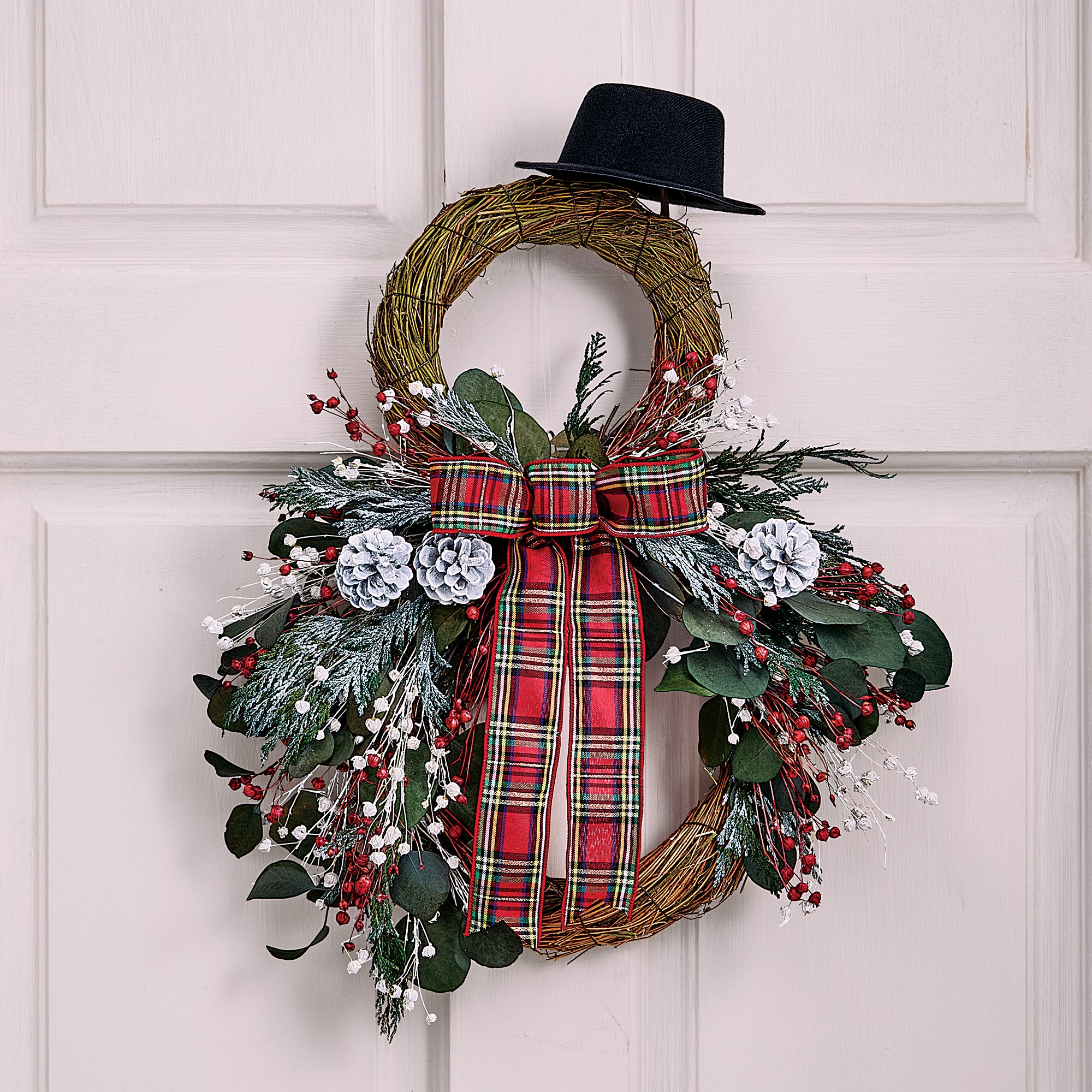 Artisan Debbie of Baja California, Mexico, and her team, hand-assemble this unique snowman wreath. It is made with rolled vine and decorated with preserved green silver dollar leaves, red and snowy white flax pods, dusted pinecones, a plaid ribbon scarf and topped with a black hat. Handcrafted exclusively for Uno Alla Volta, from the heart and hands of artisans. Approx. 20'' x 14''x 5''.