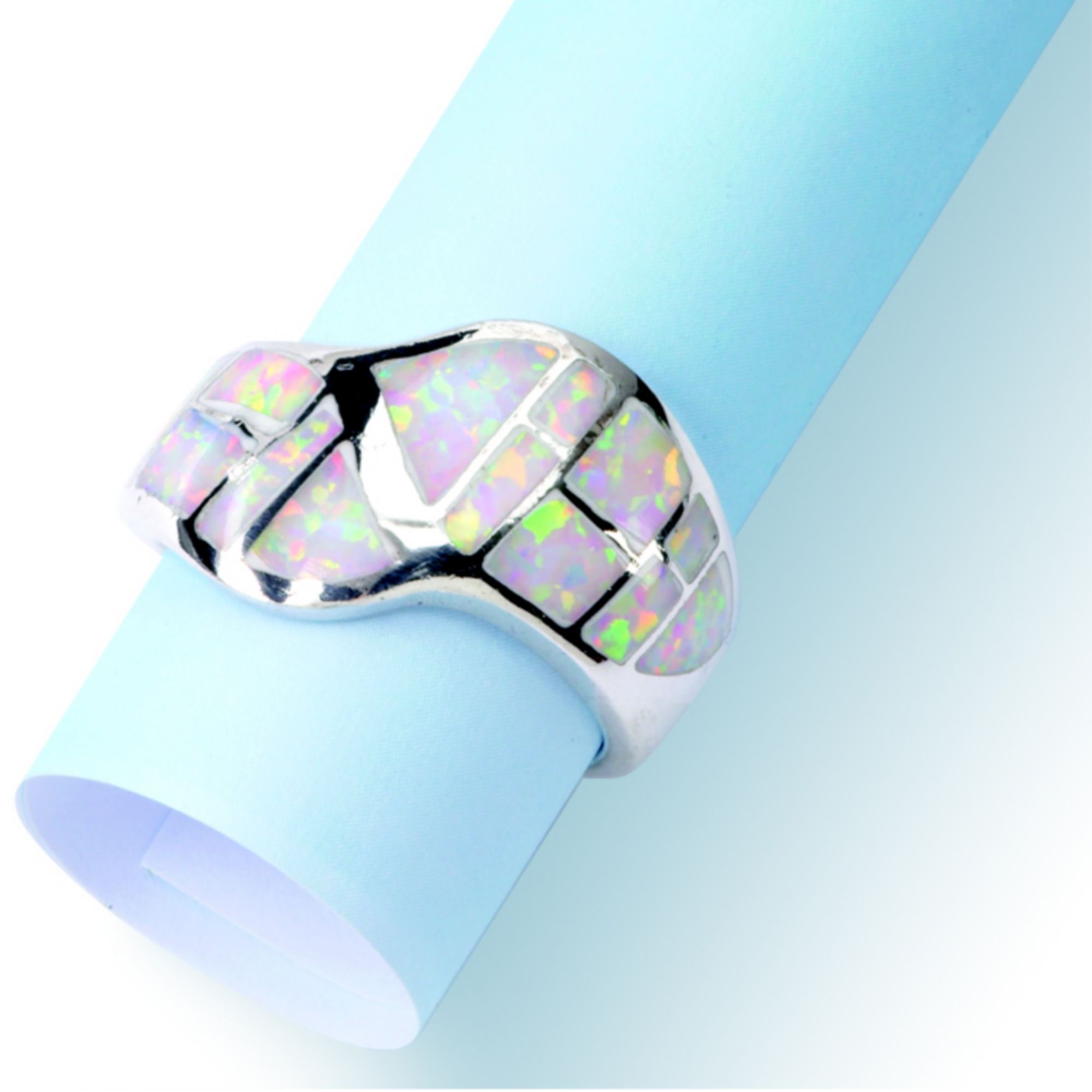 Opal, considered the ''queen of gems,'' can flash patterns of color representing every hue of the rainbow. Believed by ancient peoples to actually contain fire, opal has long been ascribed many mystical and healing properties. The rainbow of fire is produced by the diffraction of white light through a micro-structure of silica spheres. Each size sphere reflects light of a different wavelength. This sterling silver ring is set with an inlay of a matrix of iridescent white opal. Handcrafted by Leon Nussbaum, our London silversmith, of pure British sterling silver, it will appear to flicker and change with every movement of the wearer. Available in sizes 6-10.