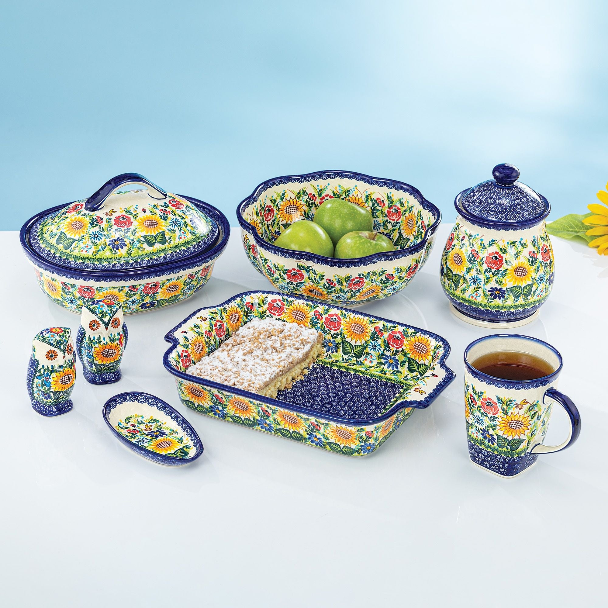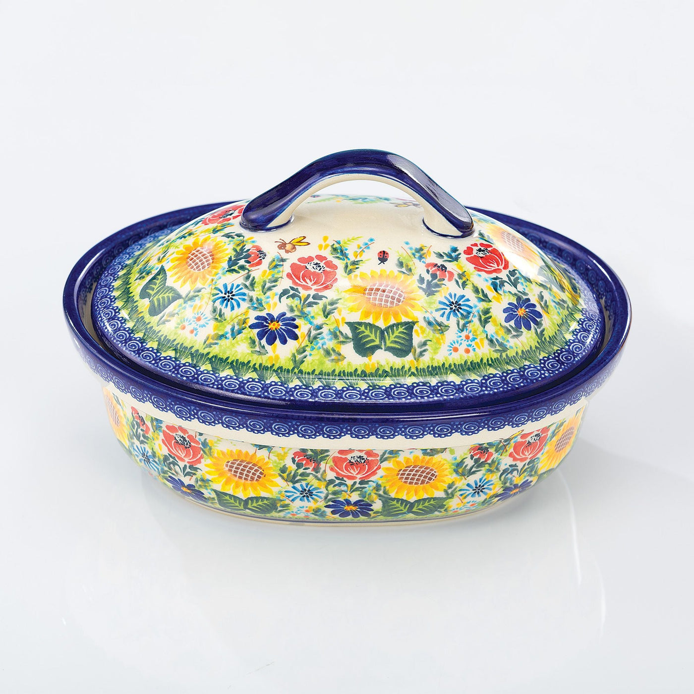 This covered baking dish is shaped from native clay. Weronika of Boleslawiec, and her team of artisans, use carved sponges to stamp on the floral motifs and details are finessed with fine brushwork. Glazed and high-fired for everlasting beauty. No two are exactly alike. Microwave, oven, dishwasher, and freezer safe. Handcrafted exclusively for Uno Alla Volta, from the hearts and hands of the artisans. Approx. 10.25'' x 8.25'' x 5.75''.