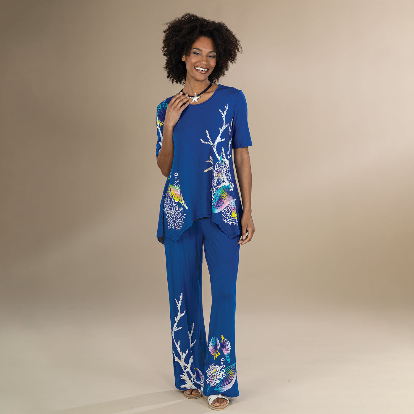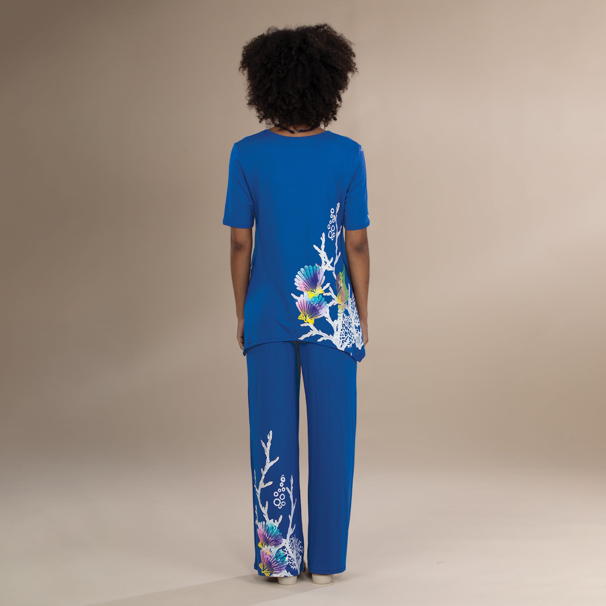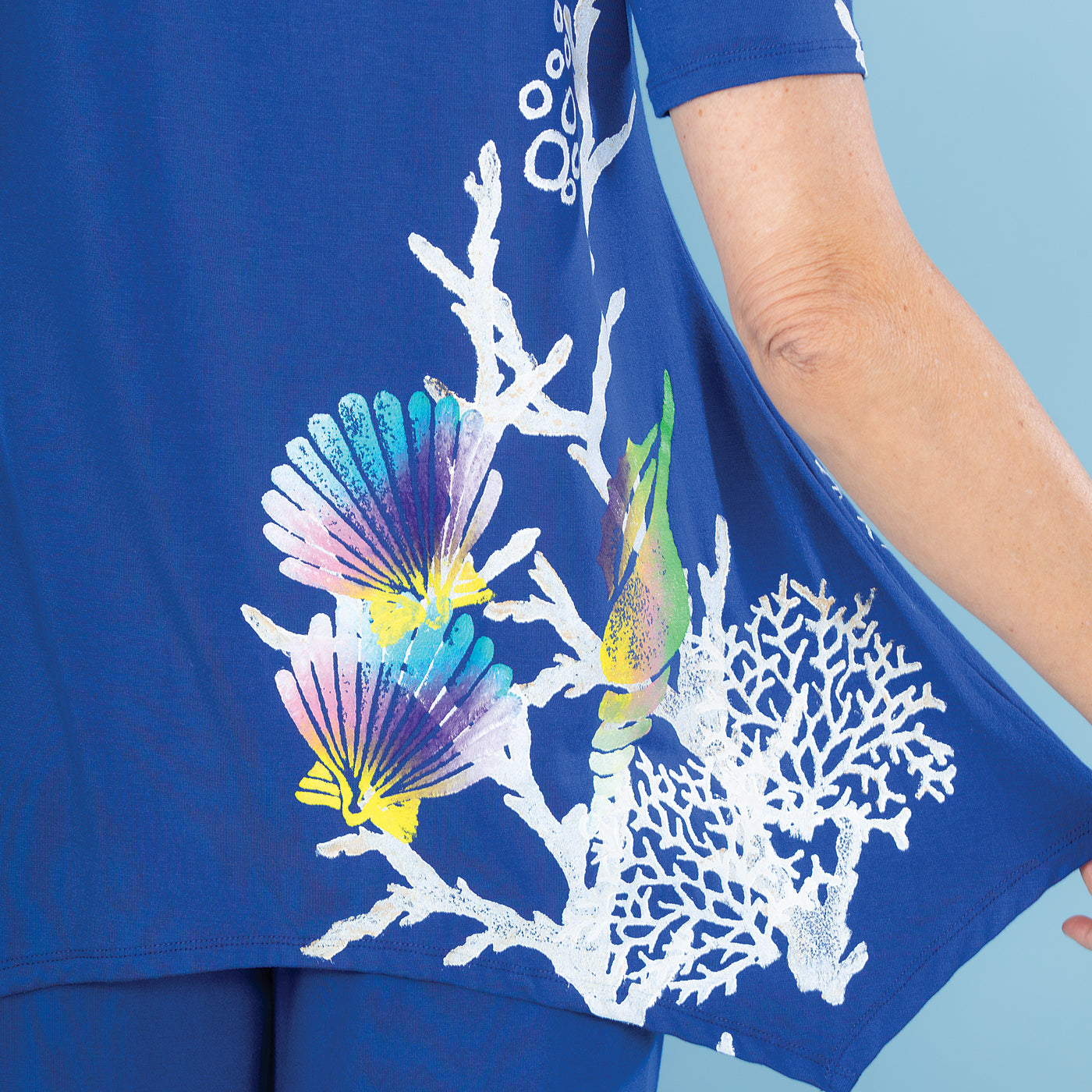 This ocean-inspired blouse, created by artisan Raffi of Los Angeles, is deep blue, with hand-painted coral and rainbow-colored shells. Pairs perfectly with the Coastal Chic Pants. Short sleeves, knit rayon spandex mix. Handcrafted exclusively for Uno Alla Volta, from the hearts and hands of artisans. Matching pants available. Available in: S 6-8, M 10-12, L 14-16, XL-18, 1X-20, 2X 22-24, 3X 26-28.