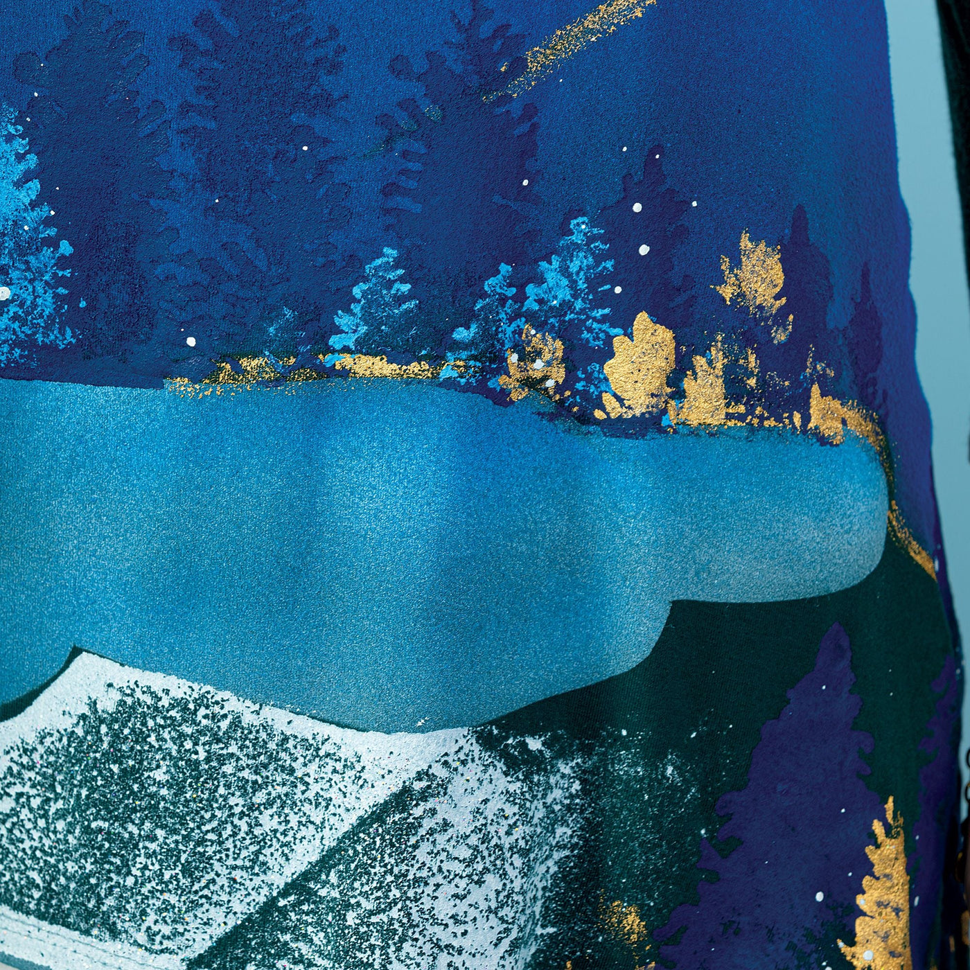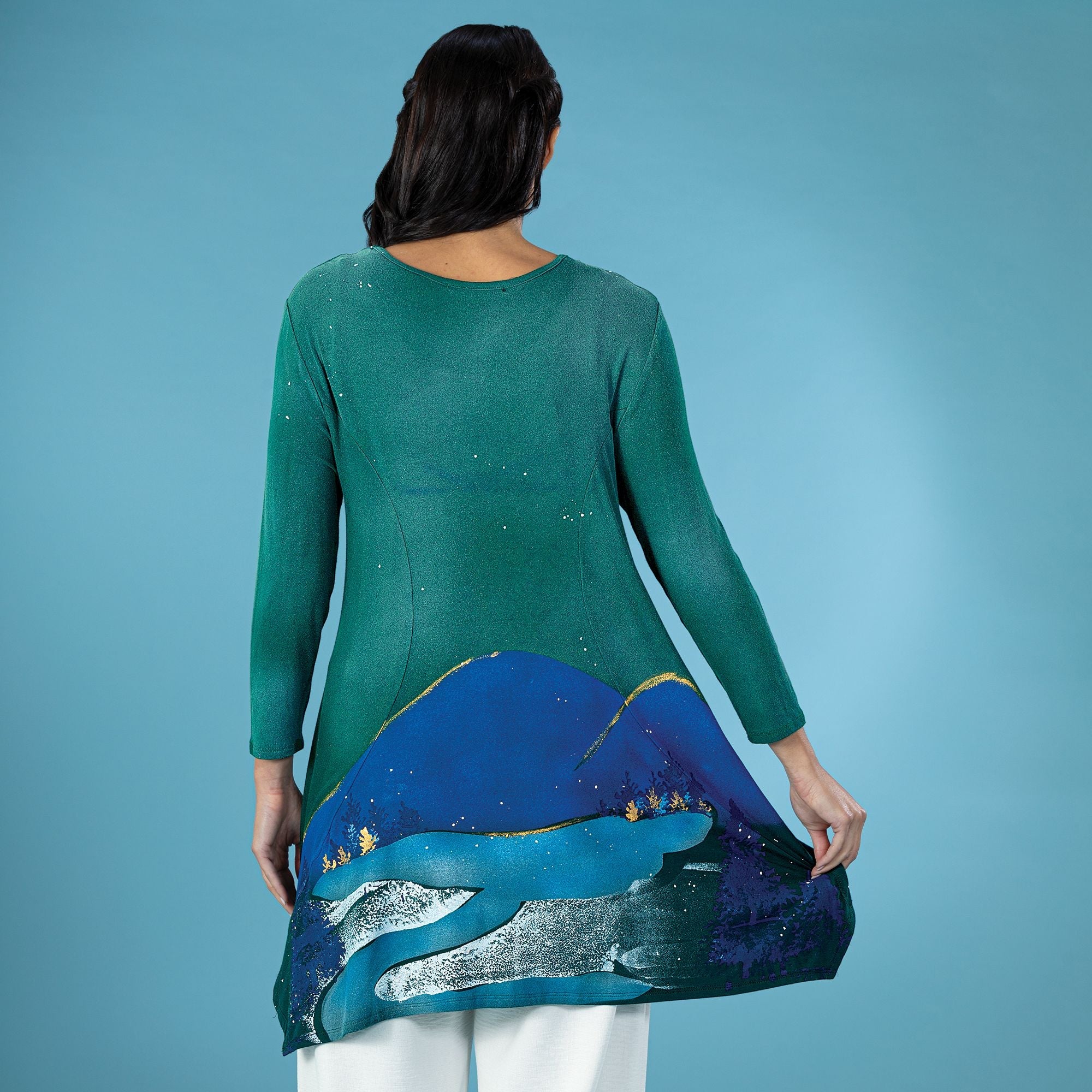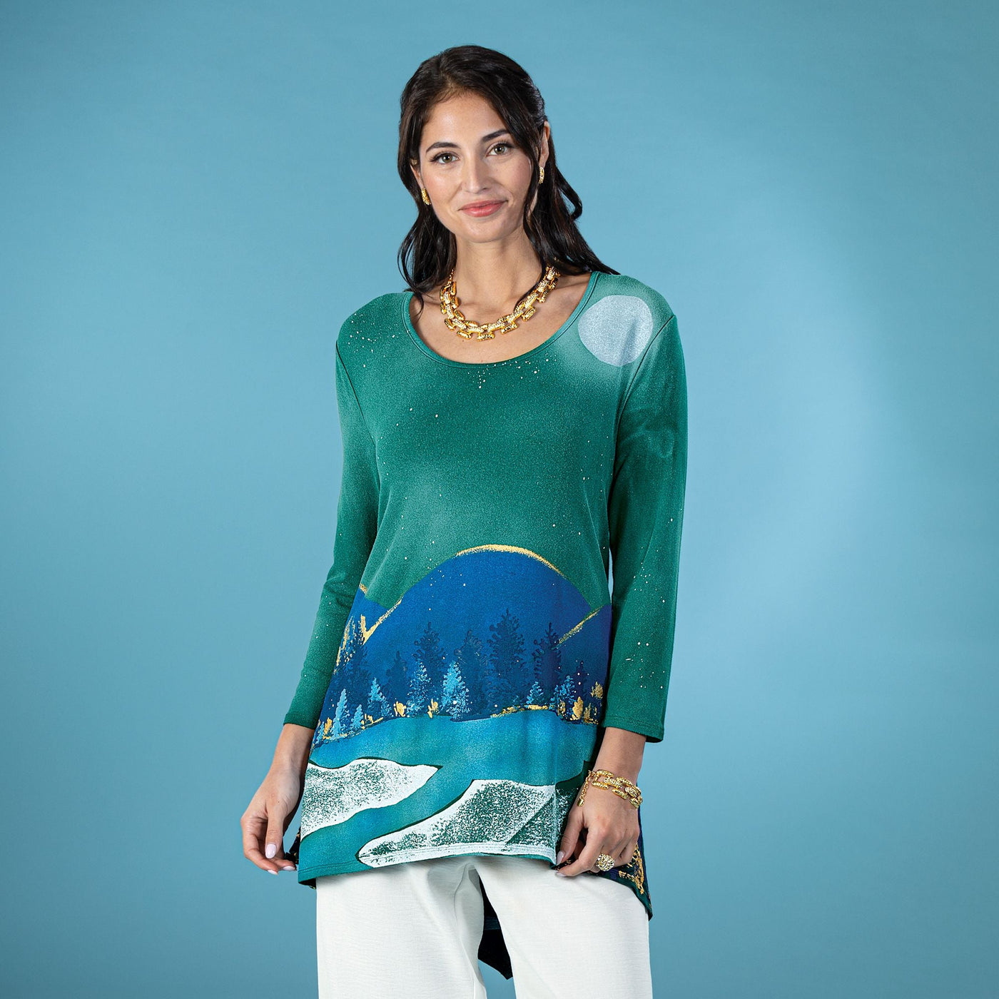 Apparel artisan Raffi of Los Angeles handcrafts this blouse, an original masterpiece created with intricate shapes that transform into a wintry moonlit scene. Features a scoop neck, knit rayon and spandex blend. Handcrafted exclusively for Uno Alla Volta, from the hearts and hands of artisans. Available in: S 6-8, M 10-12, L 14-16, XL-18, 1X-20, 2X 22-24, 3X 26-28.