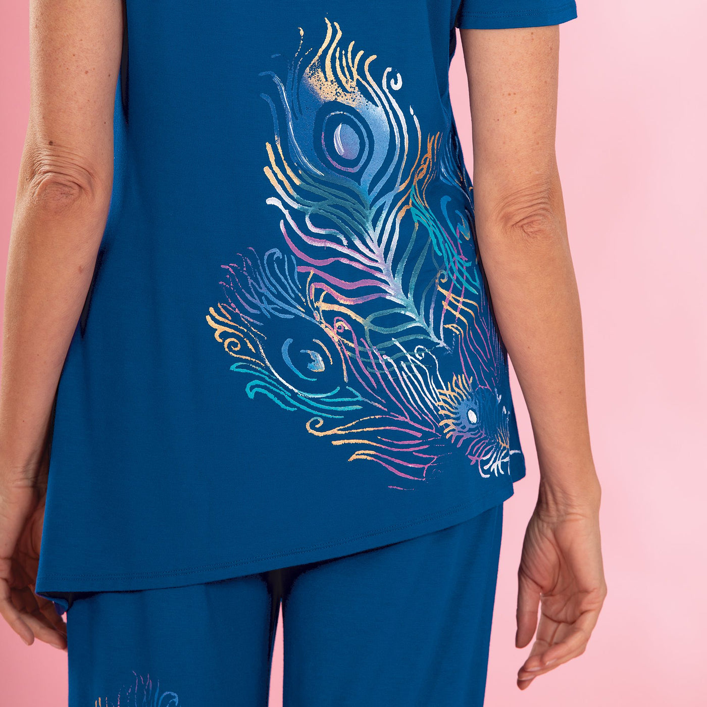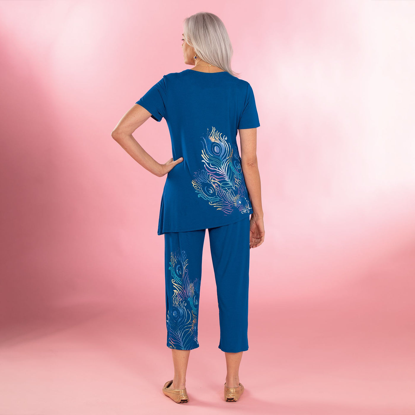 Our artisan Raffi of Los Angeles works with colorful metallics to make detailed peacock feathers pop on this fun blouse. Handcrafted exclusively for Uno Alla Volta, from the hearts and hands of artisans. Knit rayon and spandex. Asymmetrical hem. Matches perfectly with Precious Peacock Capri Pants. Available in: S 6-8, M 10-12, L 14-16, XL-18, 1X-20, 2X 22-24, 3X 26-28.