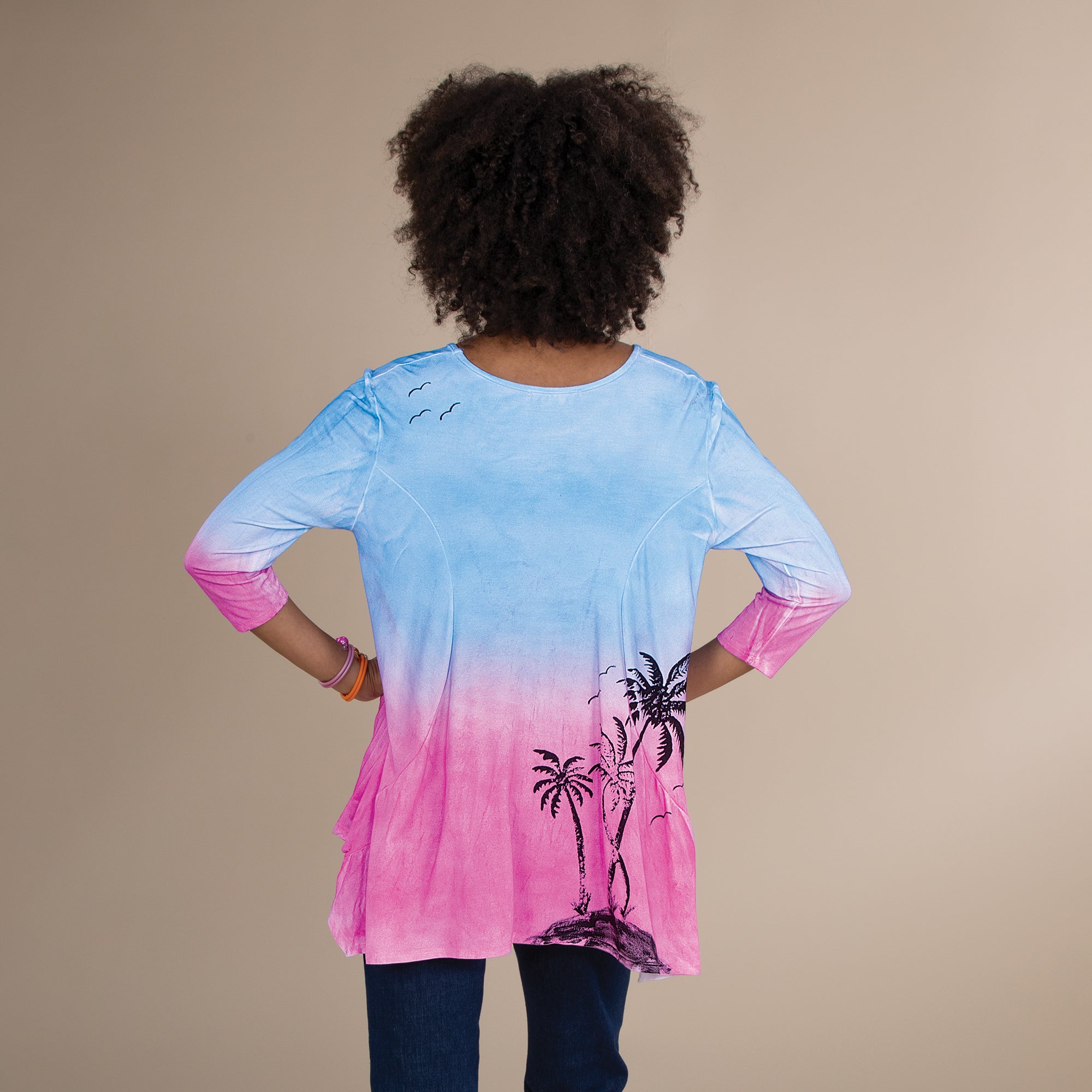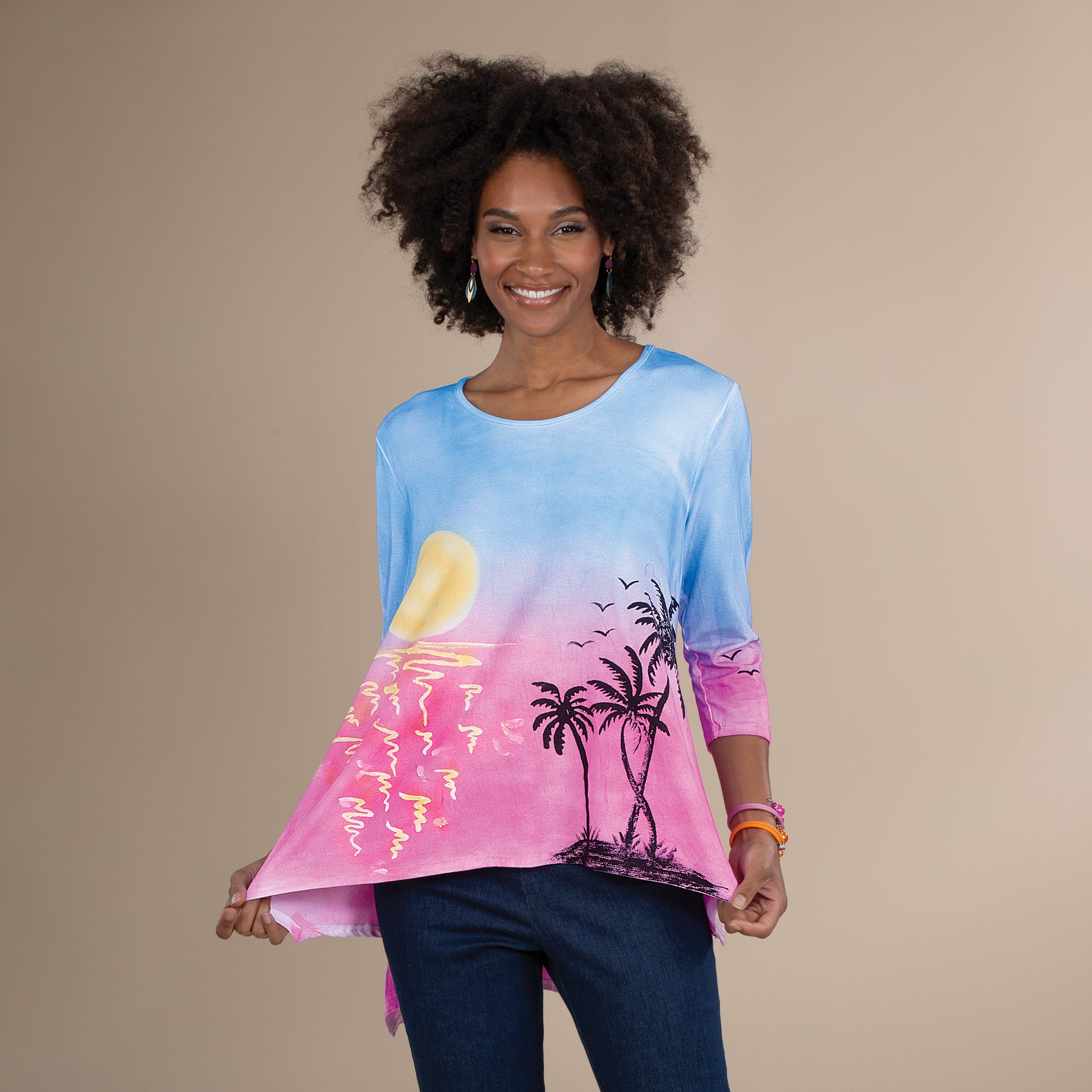 Designed by Raffi in Los Angeles, each blouse is an original masterpiece created through a multi-step process, taking over three days to complete, exclusively for Uno Allo Volta. An asymmetrical hem adds a contrasting detail to the idyllic design, featuring a sunset and island. Composed of knit rayon and spandex for a perfect fit which you can enjoy, get ready to wear after every wash. Machine wash and dry. Available in: S 6-8, M 10-12, L 14-16, XL-18, 1X-20, 2X 22-24, 3X 26-28.