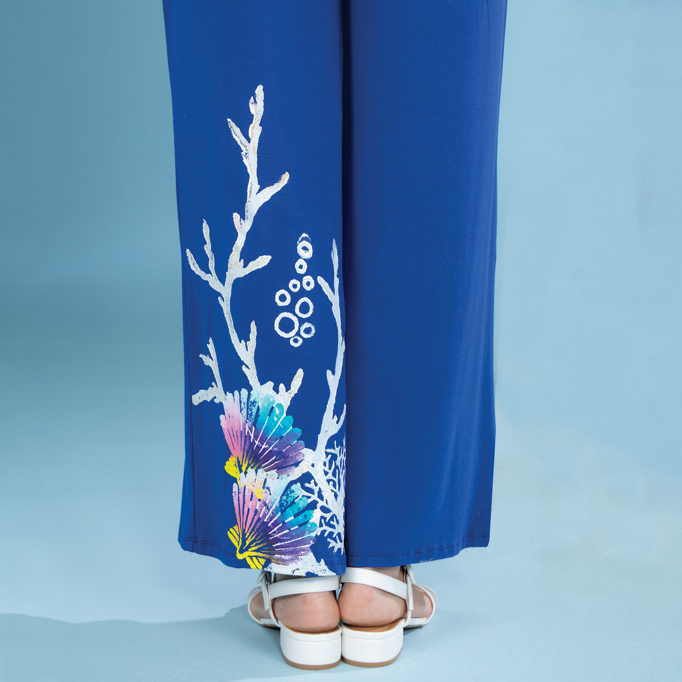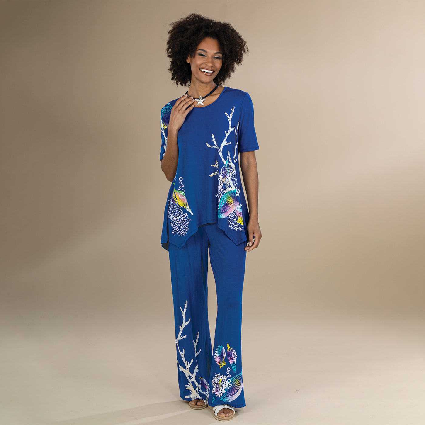 These ocean-inspired pants, created by artisan Raffi of Los Angeles, are deep blue, with hand-painted coral and rainbow-colored shells. Pairs perfectly with the Coastal Chic Blouse. Knit rayon spandex mix. Handcrafted exclusively for Uno Alla Volta, from the hearts and hands of artisans. Available in: S 6-8, M 10-12, L 14-16, XL-18, 1X-20, 2X 22-24, 3X 26-28.
