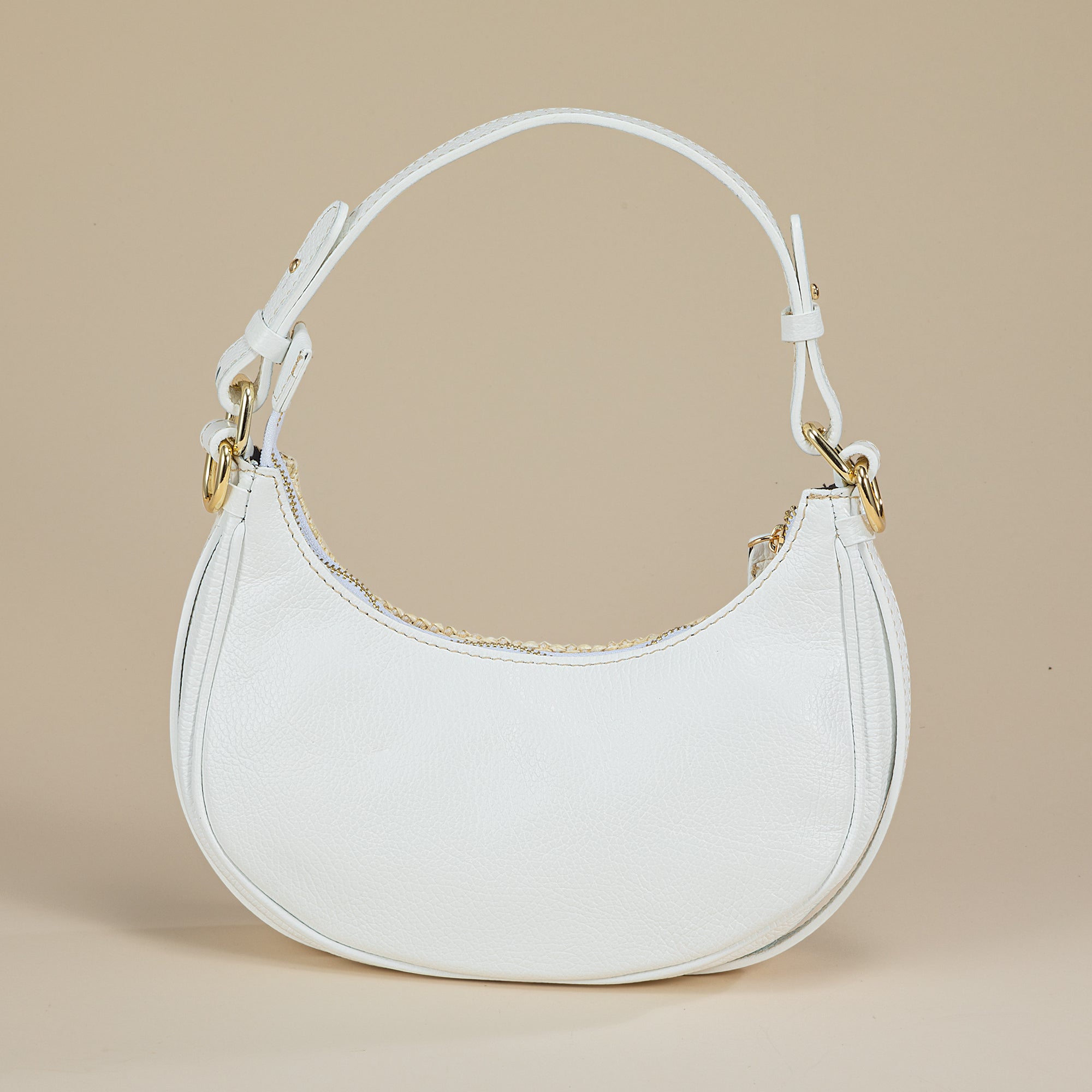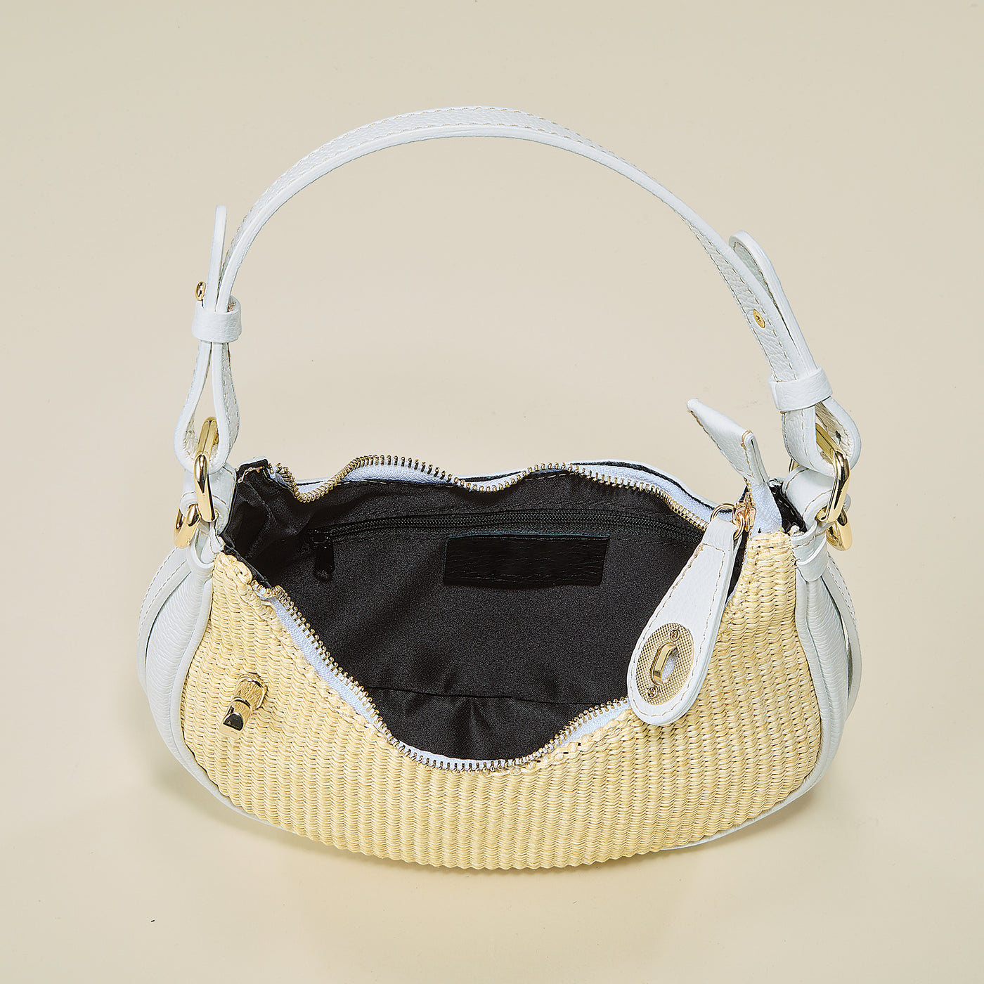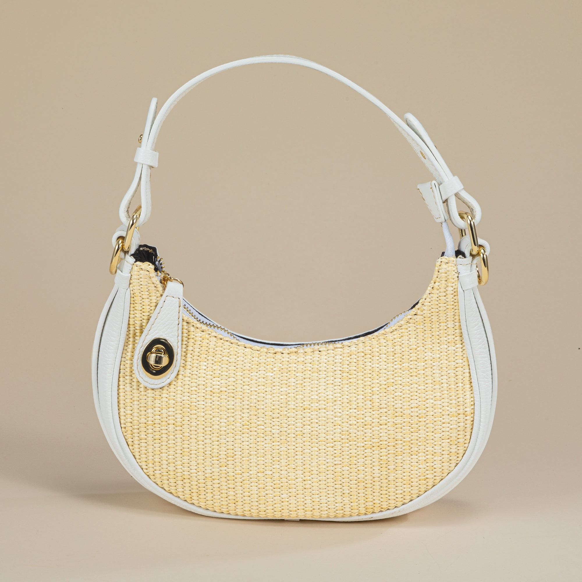 Artisan Marco of Florence designs this crescent-shaped hobo bag in natural raffia with white Italian leather accenting. Approx. 11'' x 3'' x 5'', it features an 8'' handle, a 21'' removable adjustable shoulder strap, one interior zipper pocket, is cloth lined, and has a zipper and toggle closure.