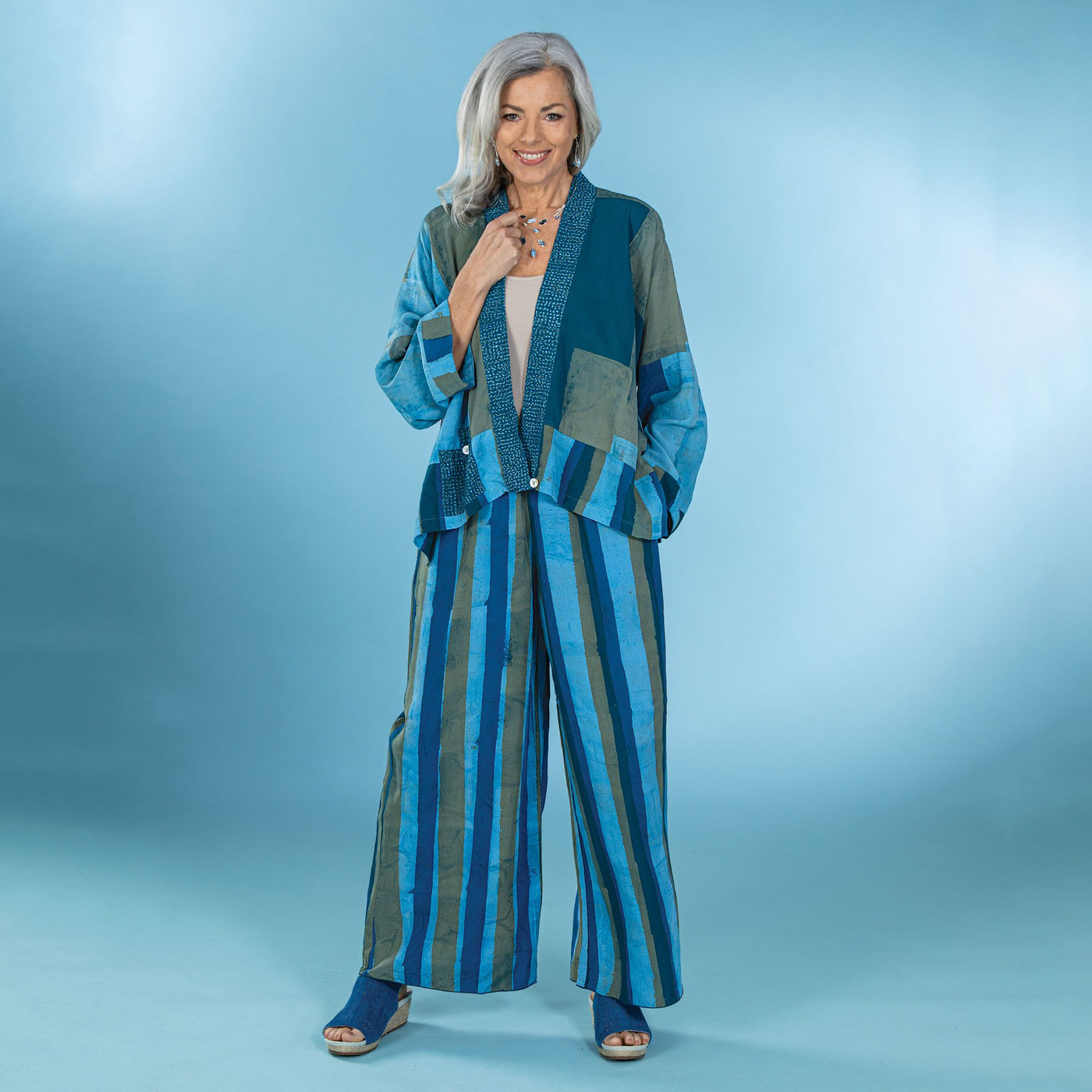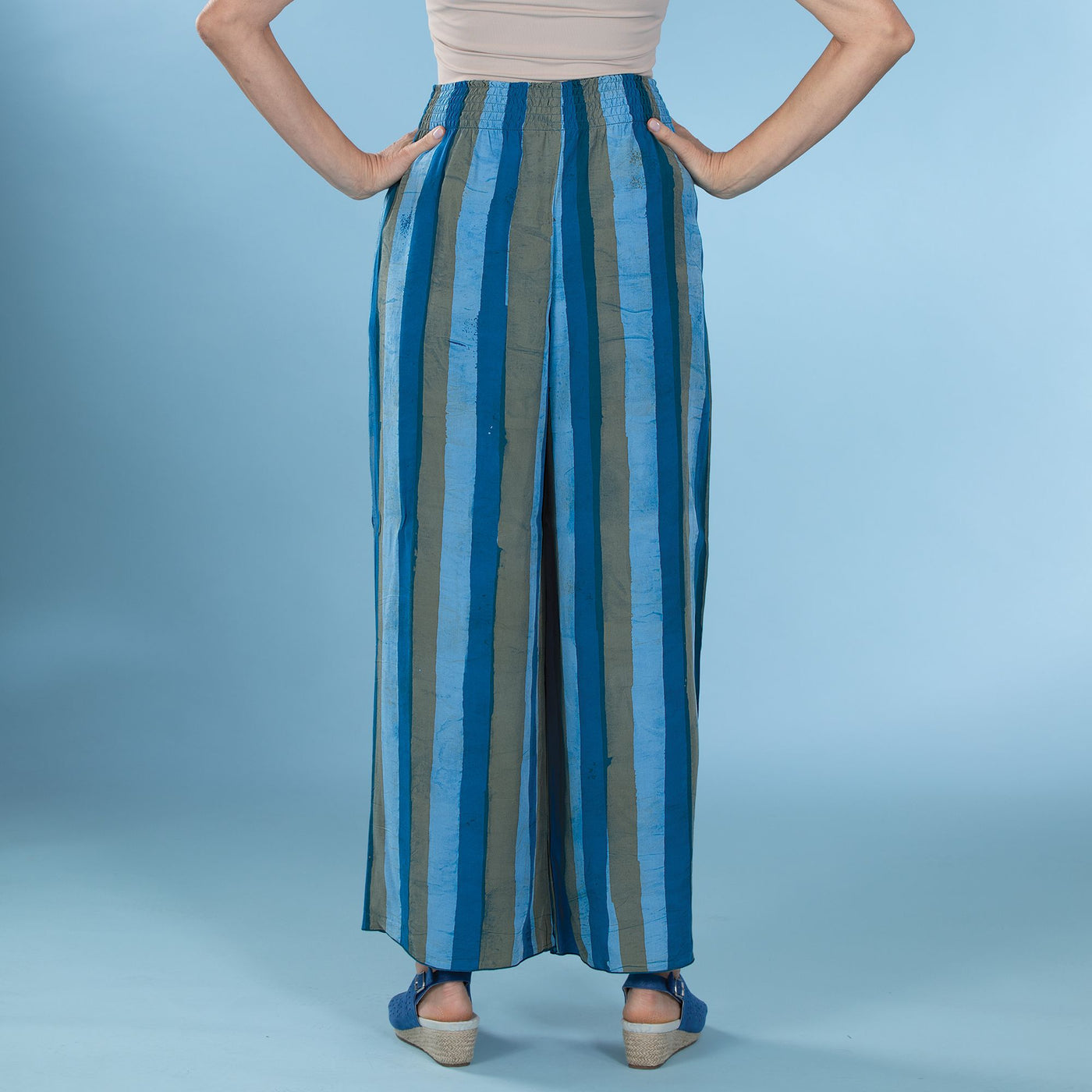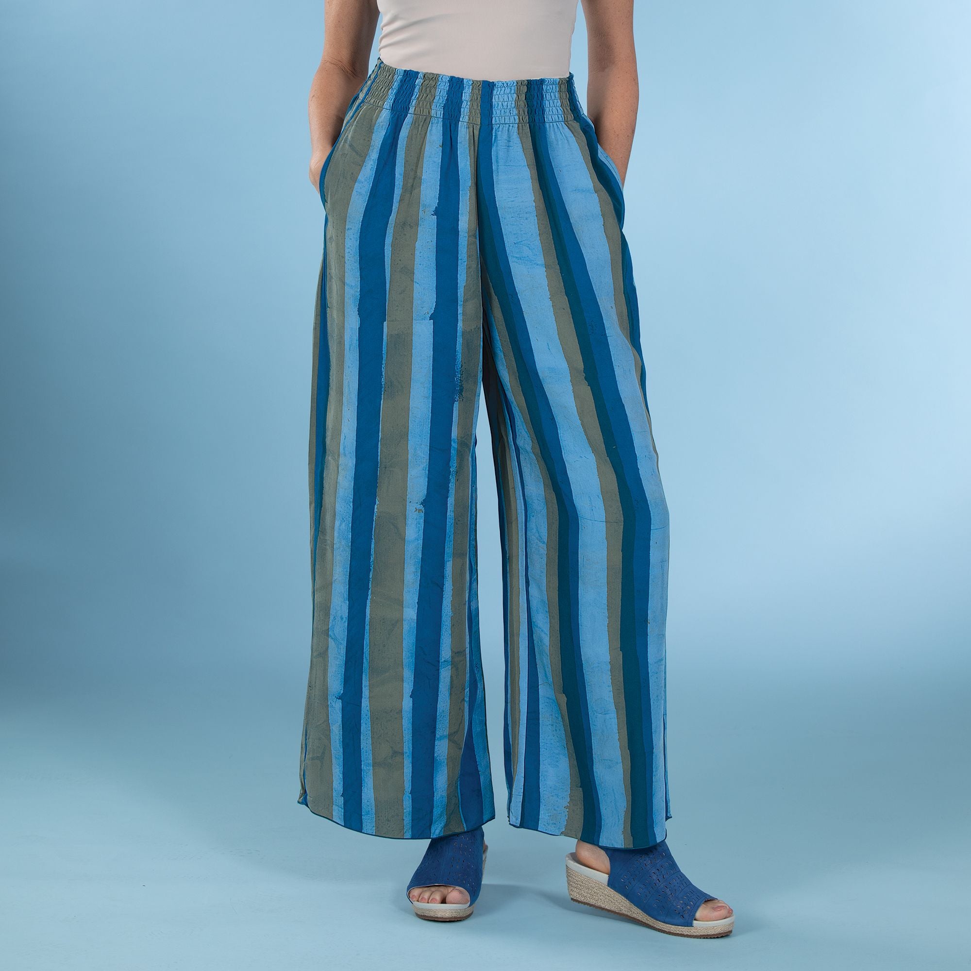 Artisans Lynn and Miklane of Bali design these chic and stylish pants in the U.S. and they are then handcrafted in Bali. Striped with pockets, elastic waist band. 100% rayon. Matching jacket is available. Available in: S-6, M-8, L-10, XL-12, XXL-14.