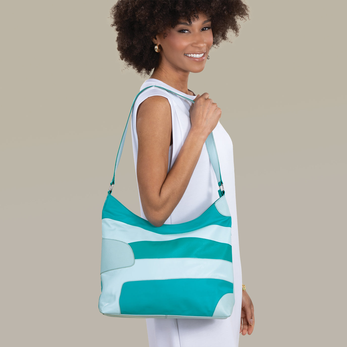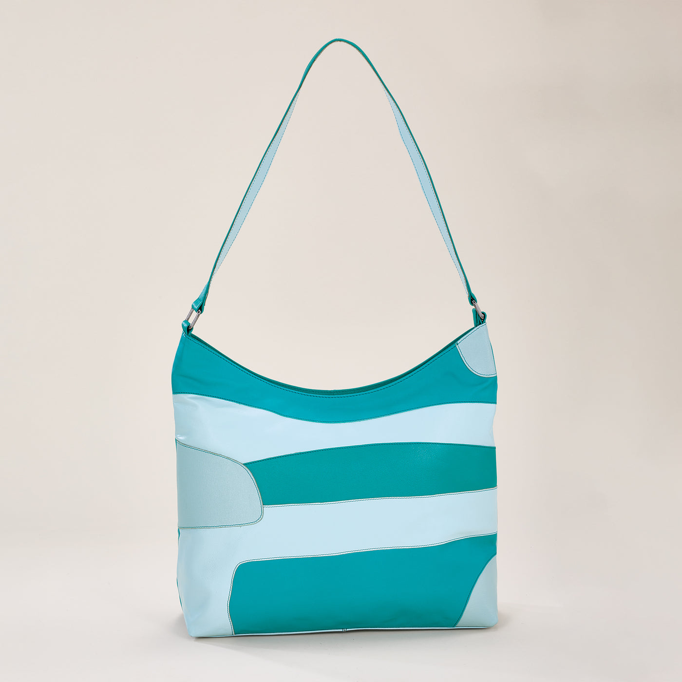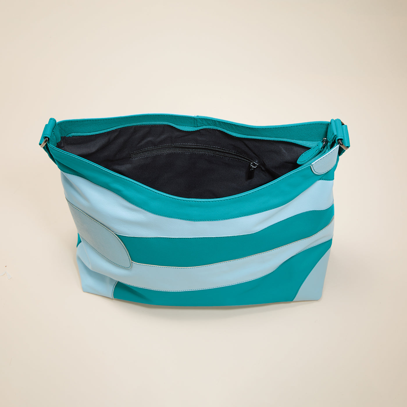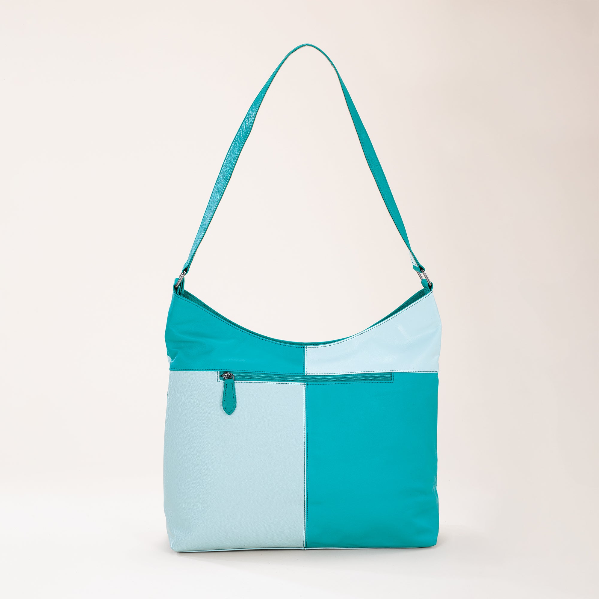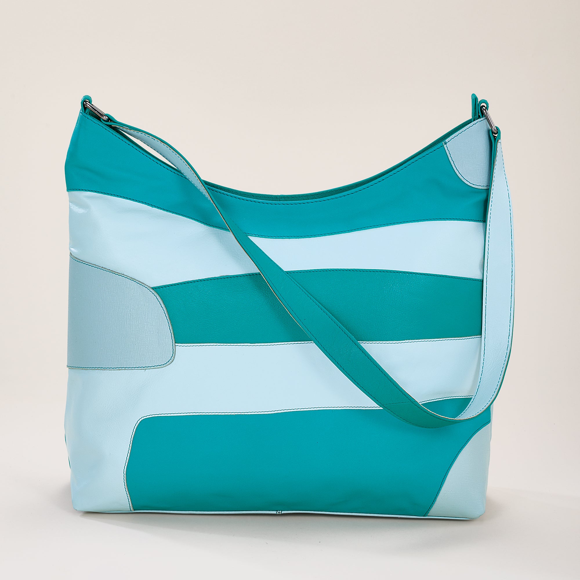Our artisans of Kolkata handcraft this hobo bag with supple aqua leather in an eye-catching abstract design. Perfect for every day or a special event. Approx. 13.5'' x 4.5'' x 11'', it features a 14'' shoulder strap, exterior zipper pocket, three interior pockets, and a zipper closure.