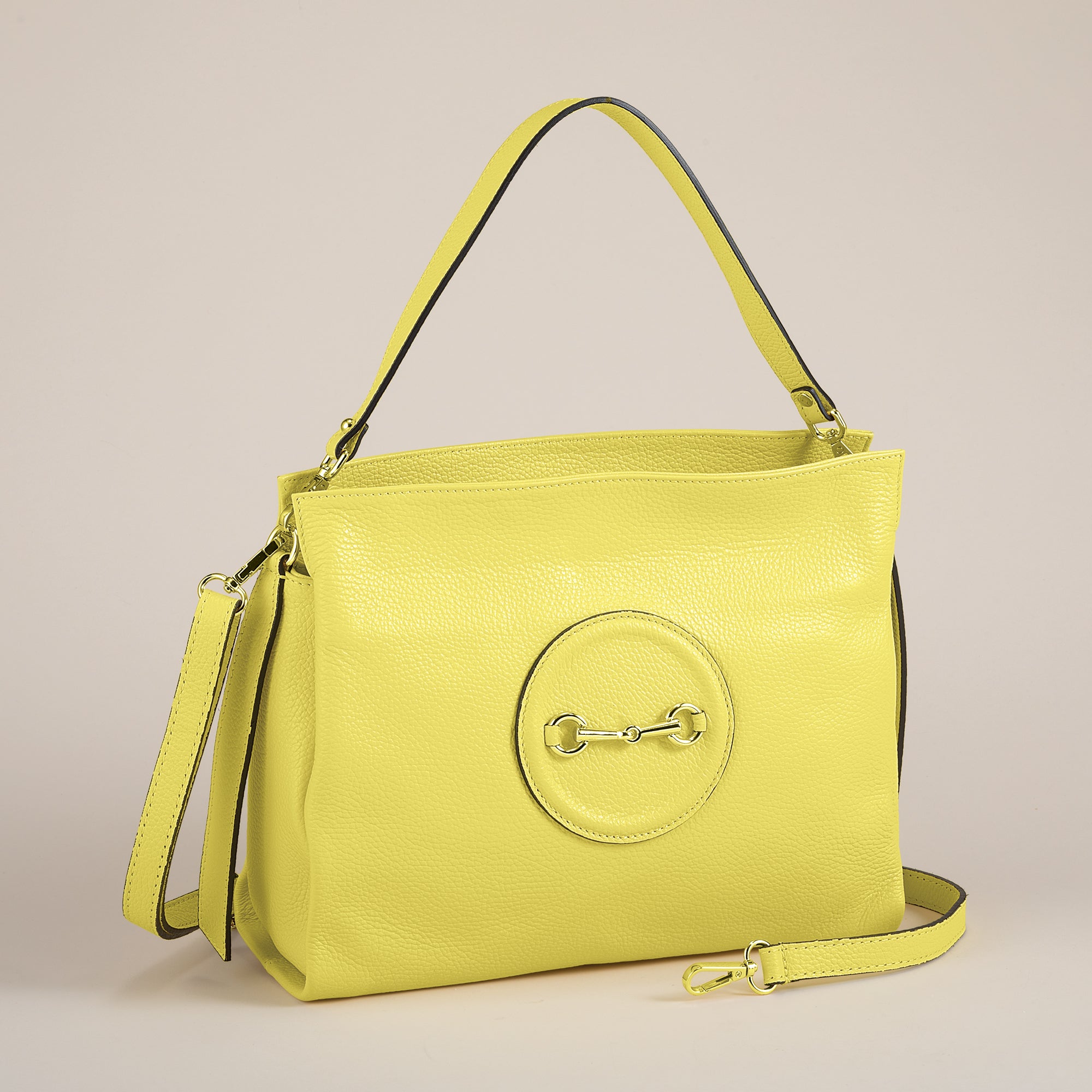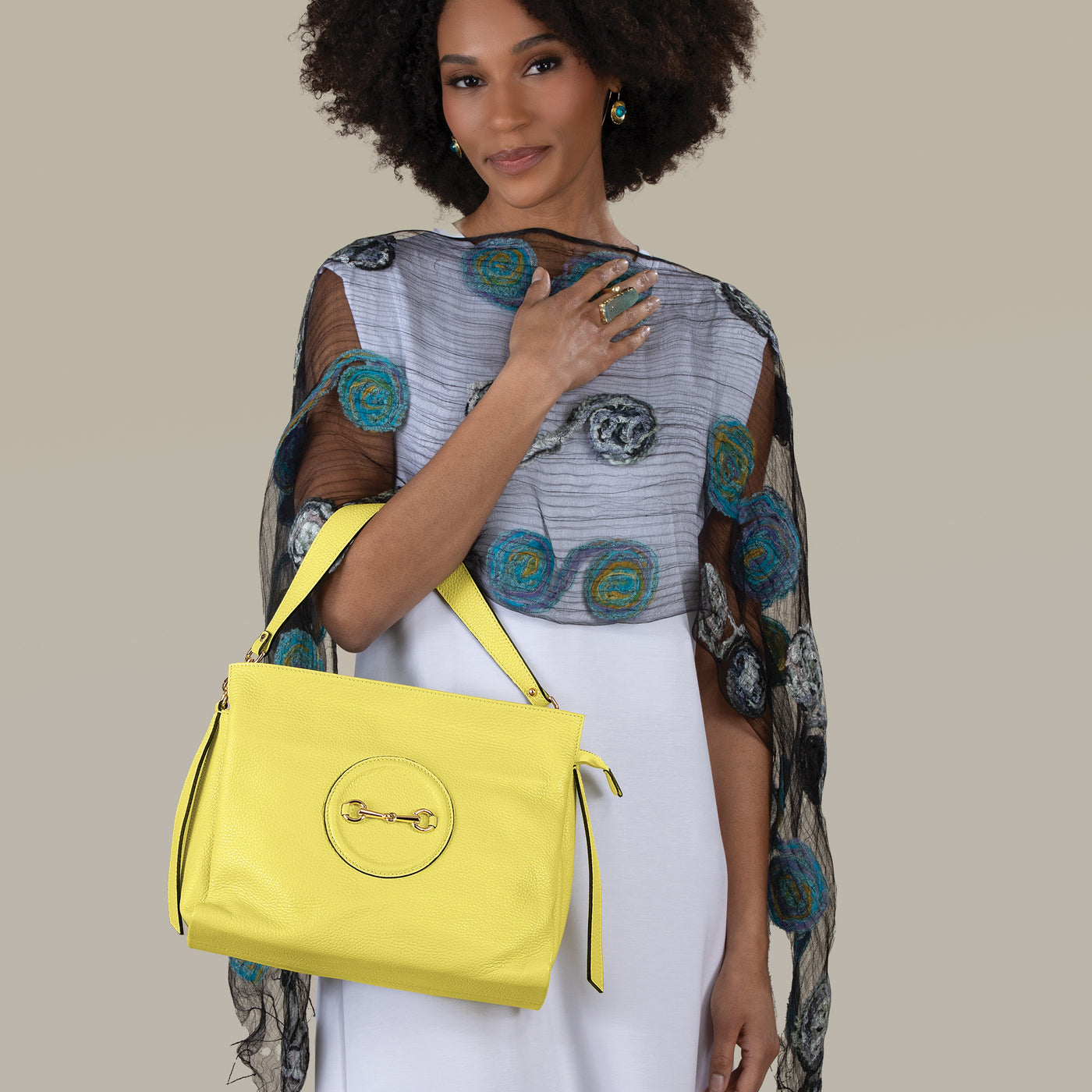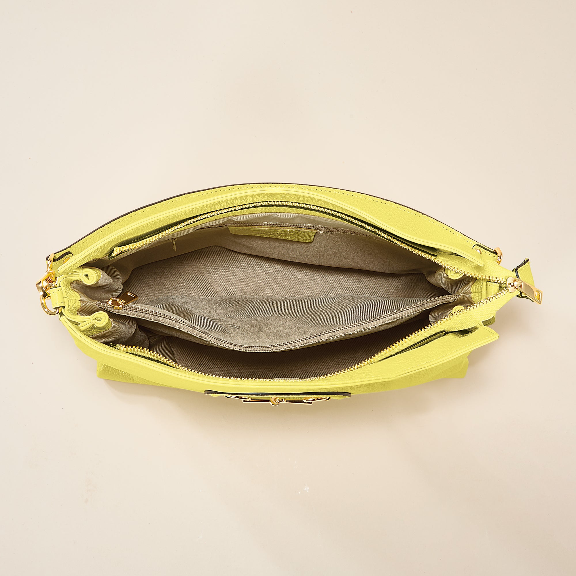 Artisan Marco of Florence creates this crossbody bag in a soft, buttery yellow Italian leather. Approx. 12'' x 5'' x 10'' with a 10'' strap, two interior zip pockets, and two interior slip pockets. Cloth lined, with a decorative link embellishment, and a zipper closure.