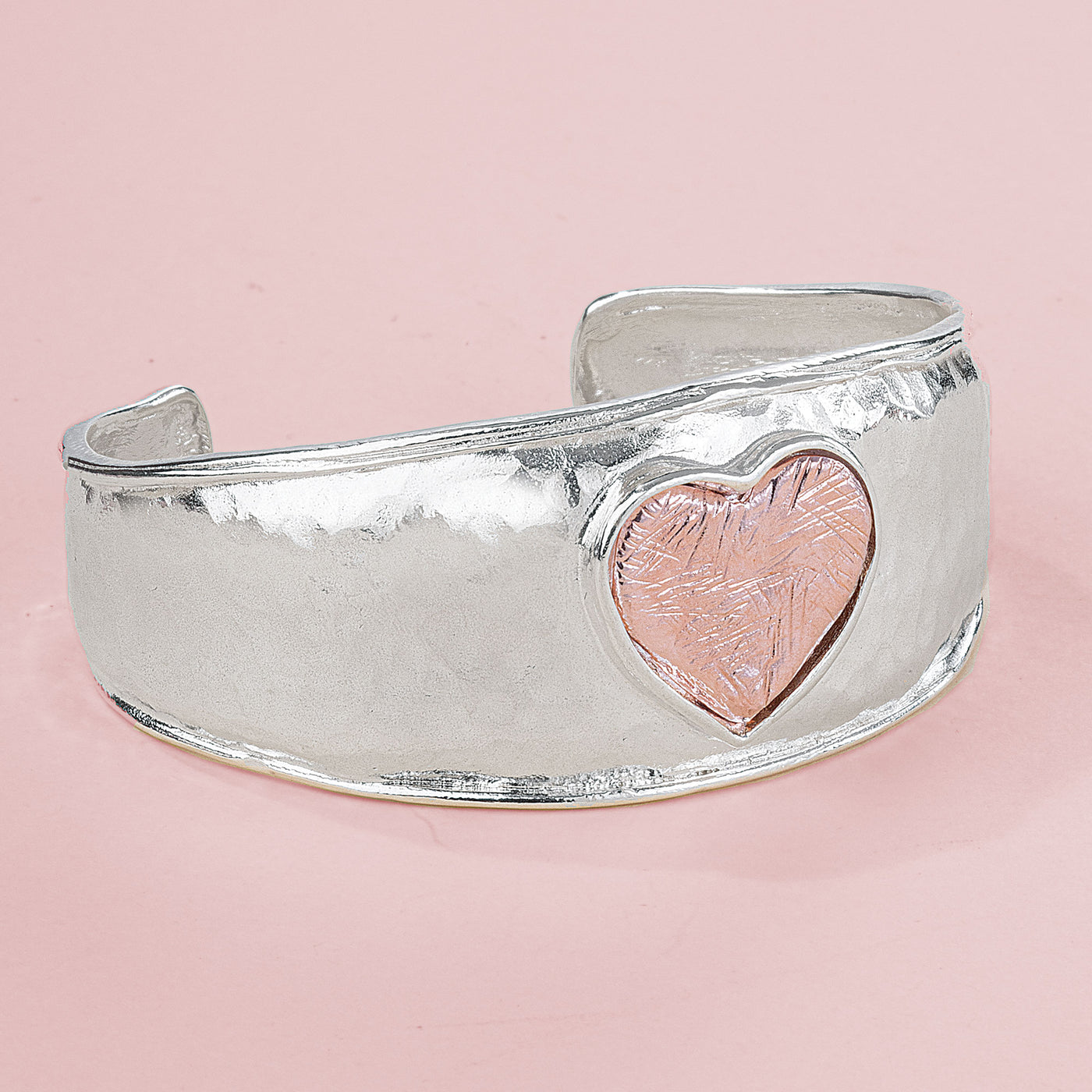 This eye-catching textured cuff, by artisan Avi of Israel, strikes the perfect balance between classically elegant and beautifully bold, pairing stylish rose gold with gleaming sterling silver. Handcrafted exclusively for Uno Alla Volta, from the hearts and hands of artisans. 1'' wide, adjustable.