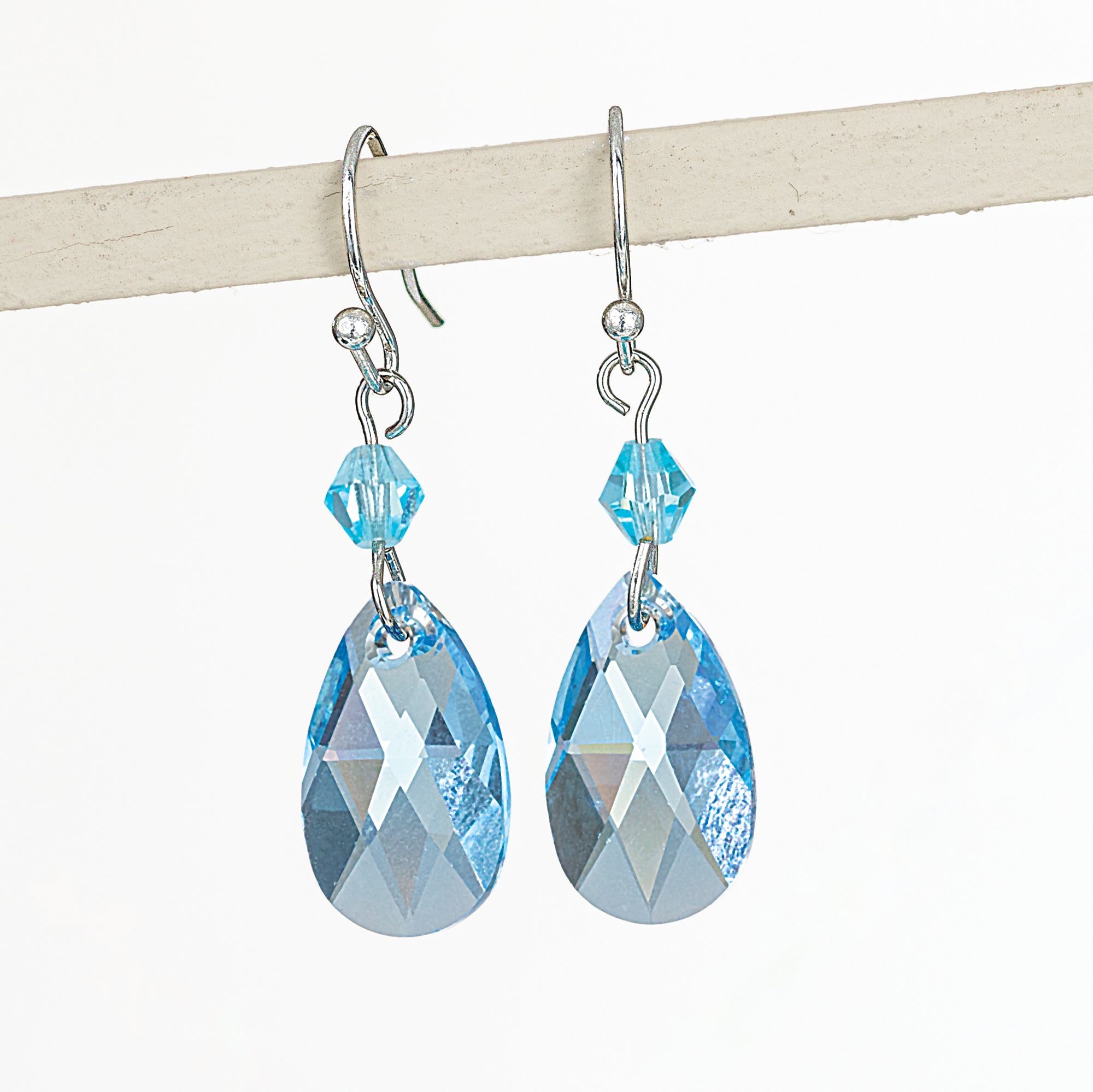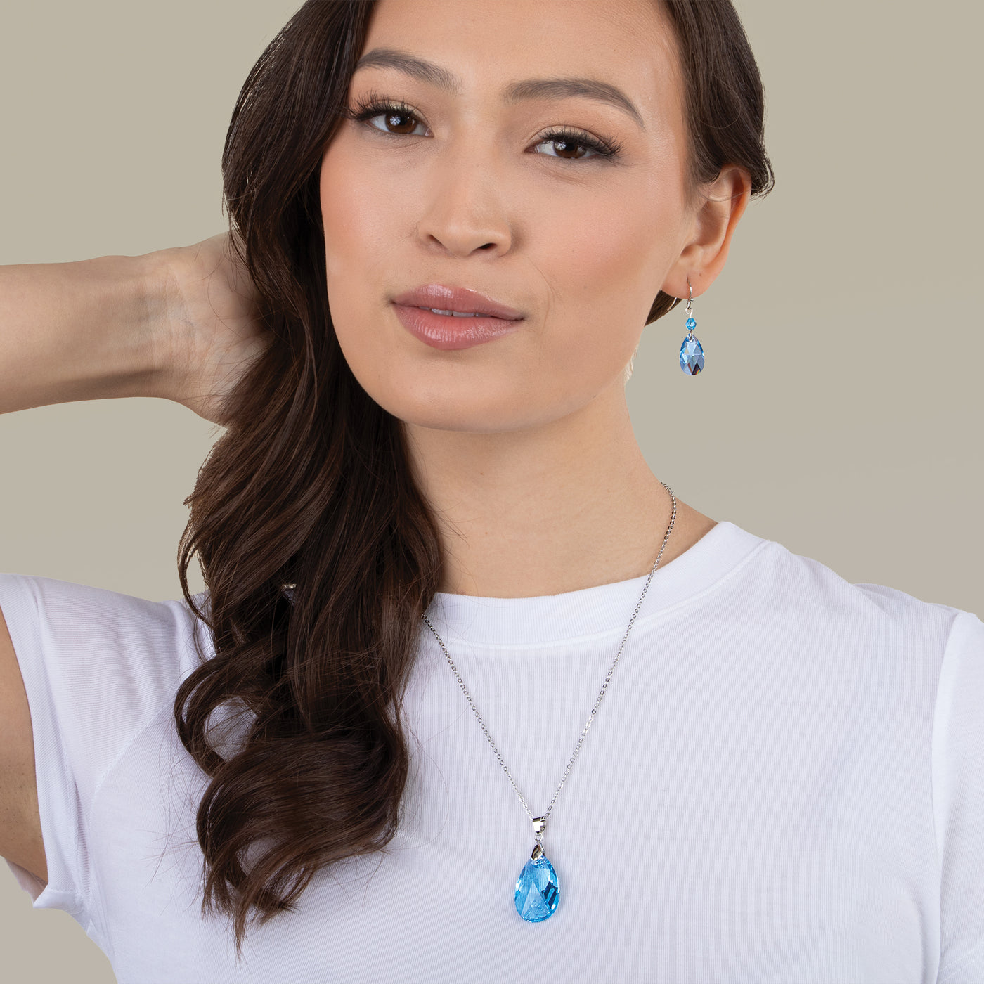 Artisan and U.S. based jewelry designer Jacob of Rhode Island handcrafts this sparkling necklace and earrings set with light blue faceted European crystals. Inspired by the waters of the Bahamas, these crystals are set in rhodium-plated brass. Handcrafted exclusively for Uno Alla Volta, from the hearts and hands of artisans. Necklace, approx. 19'' long, 2'' ext., 1.5'' pendant, lobster clasp. Earrings, approx. 1.5'' long, wires.