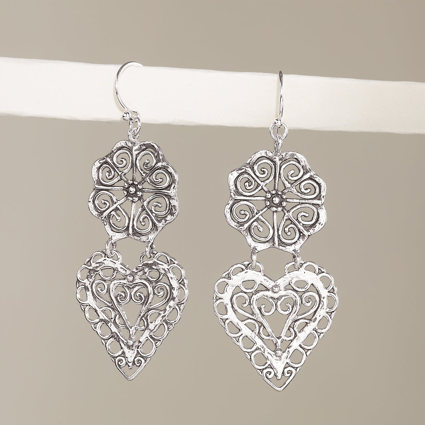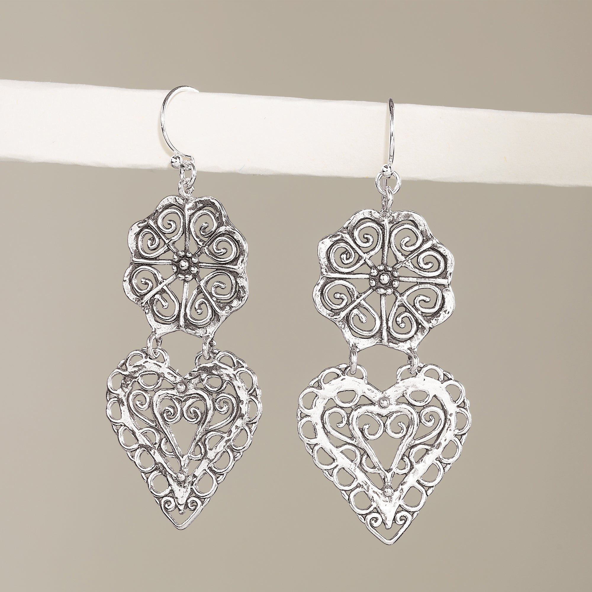 Tamir of Israel designs and handcrafts these sterling silver dangle earrings featuring filigree hearts and flowers. They pair perfectly with the Be Still My Heart Filigree Heart Necklace. Approx. 2.5'' long, wires.