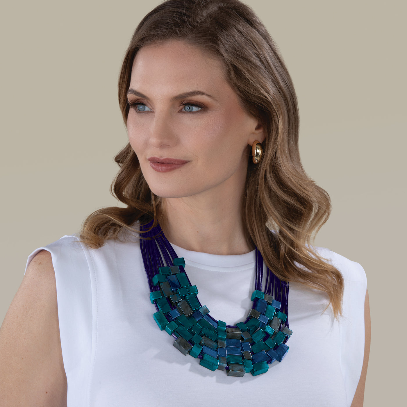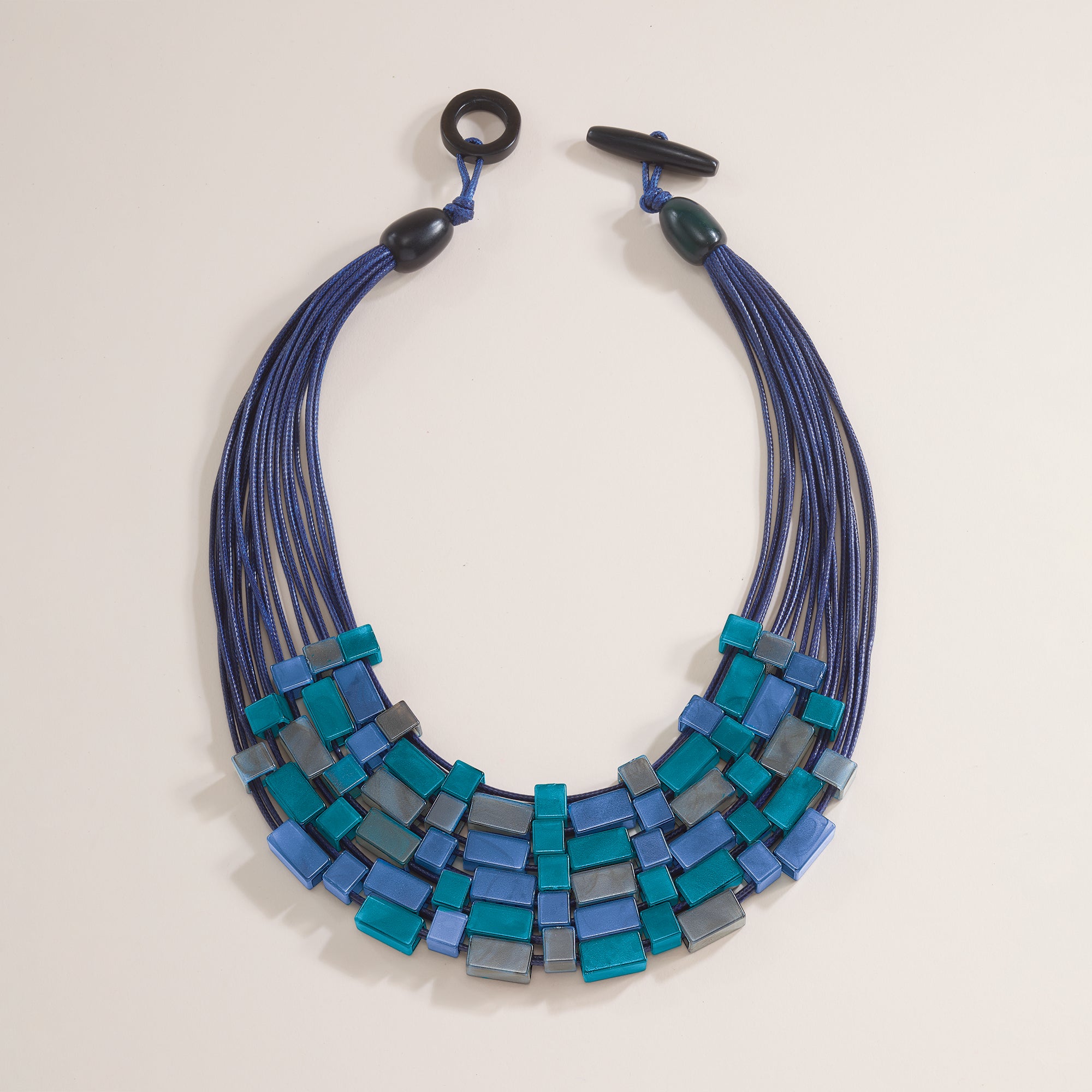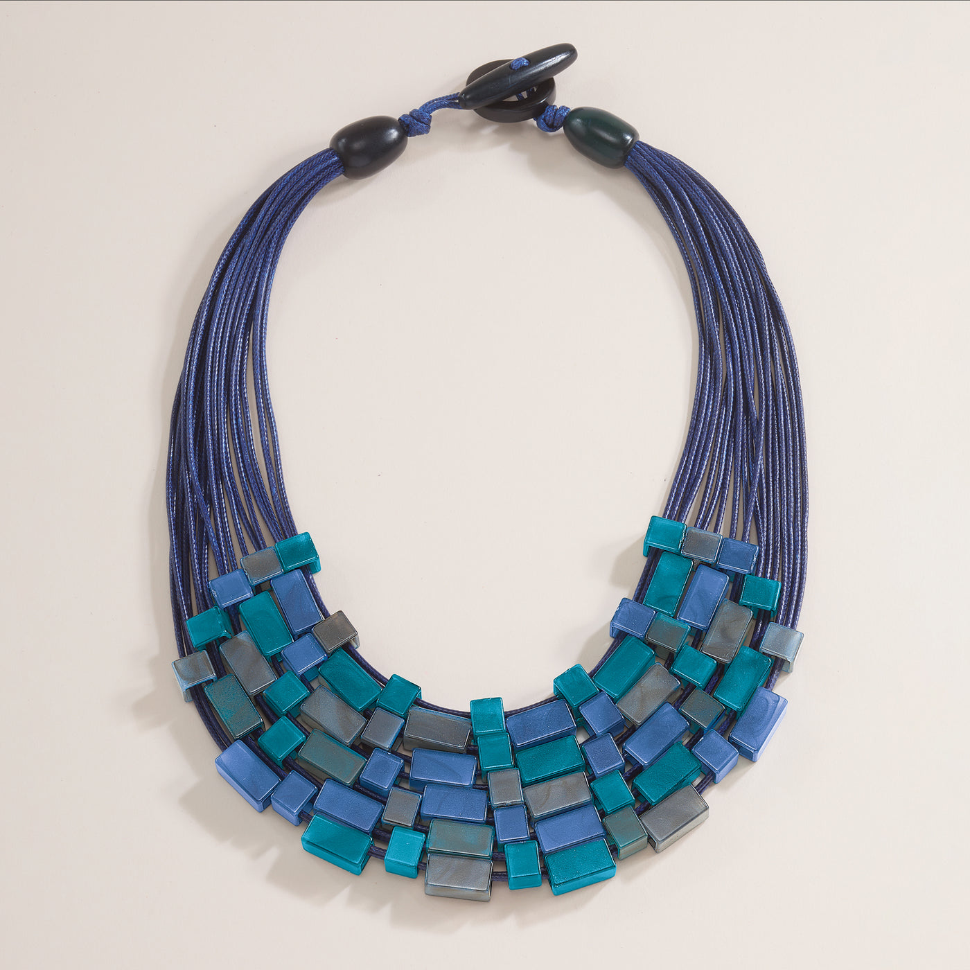 Artisan Susan of North Carolina designs this statement piece featuring naturally shed horn and blue resin beads on corded strands. Designed in North Carolina, made in the Philippines. Perfect to dress up or wear with a more casual ensemble. Approx. 24'' long, 2.5'' drop., toggle closure.