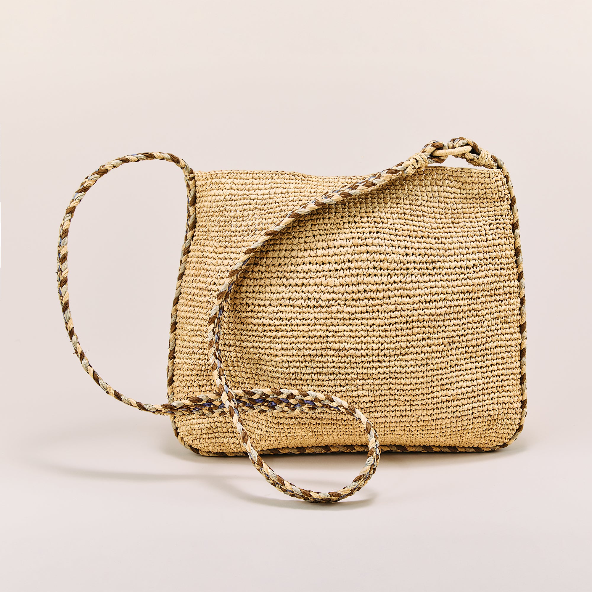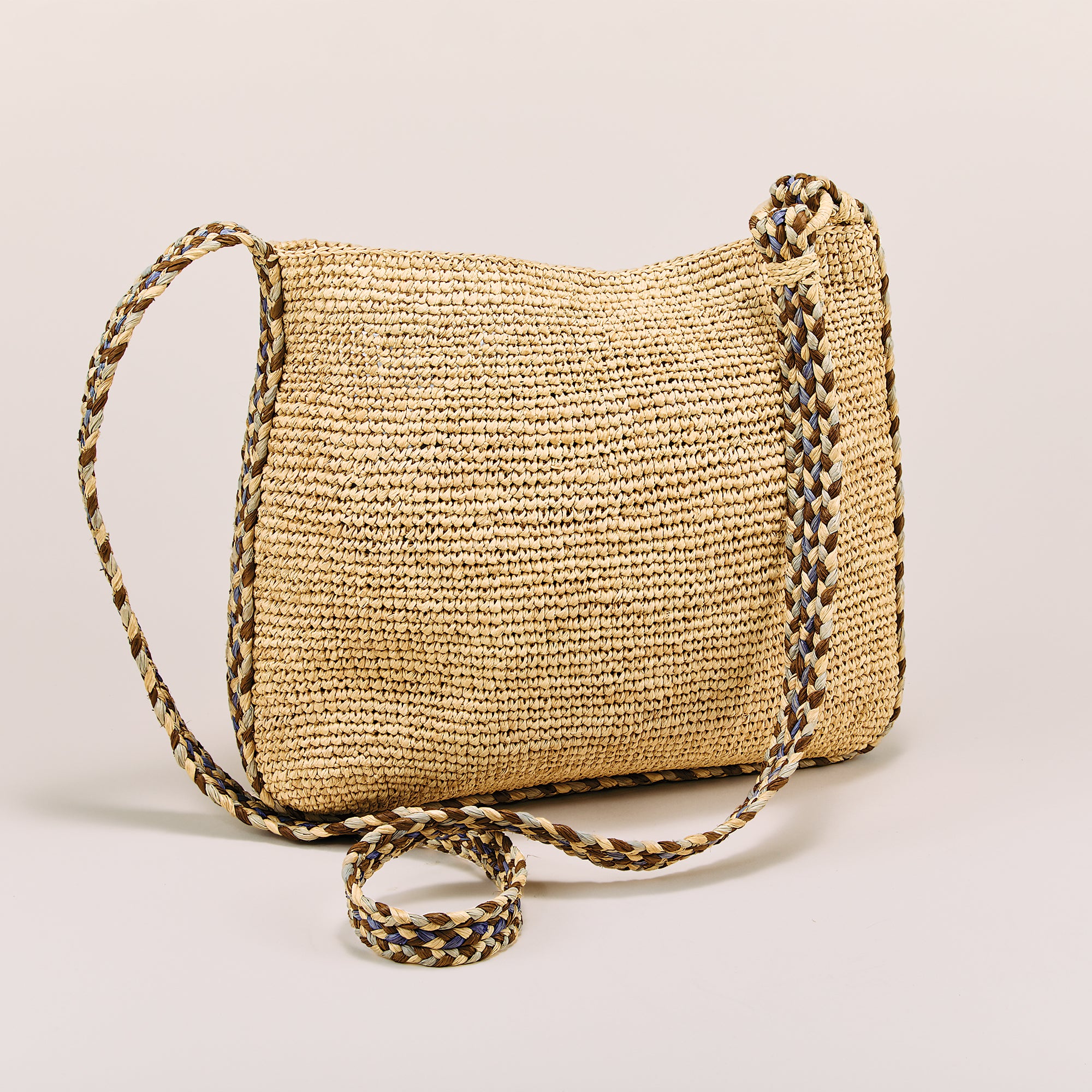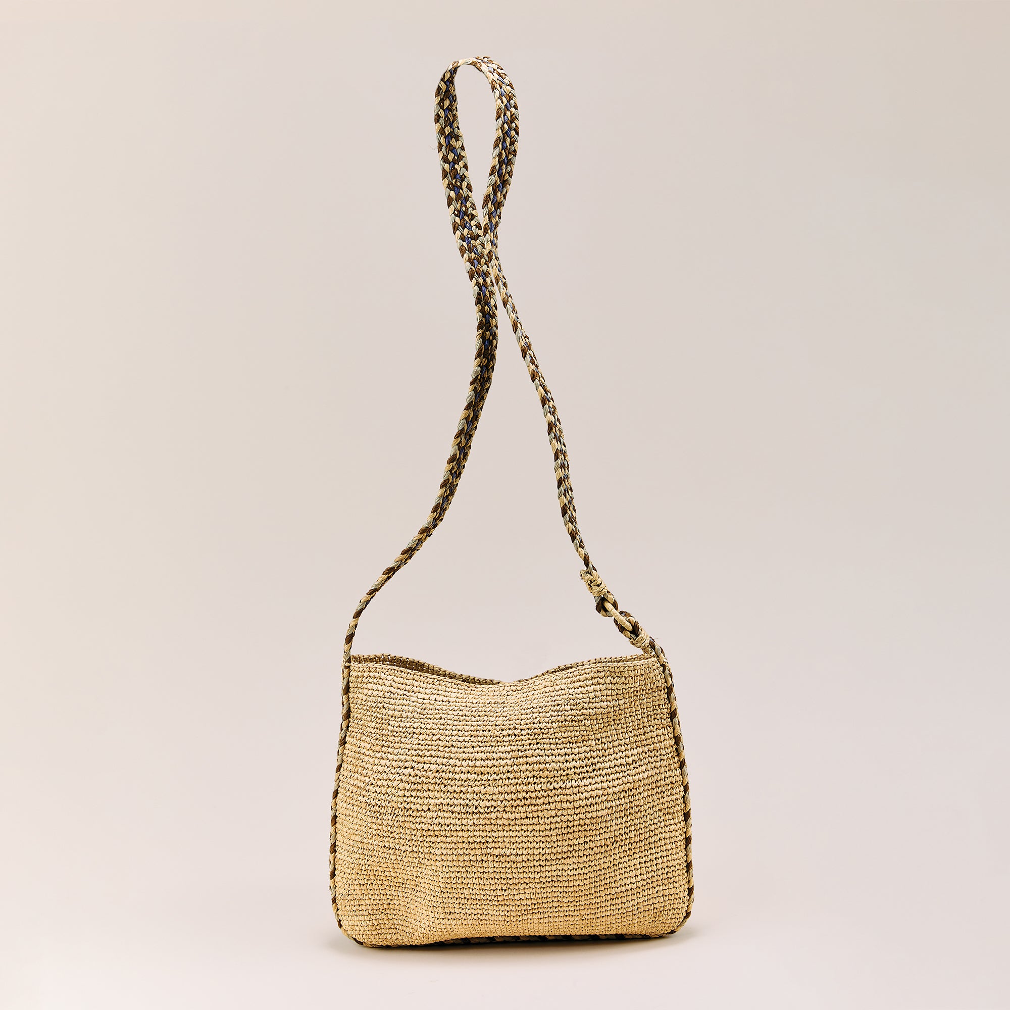 Our artisans of Italy create this natural raffia straw crossbody with a braided, multicolored strap. Perfect for running errands or when you just need to carry a few things. Approx. 12'' x 27'' with a 24'' strap, interior pocket and a tie closure.
