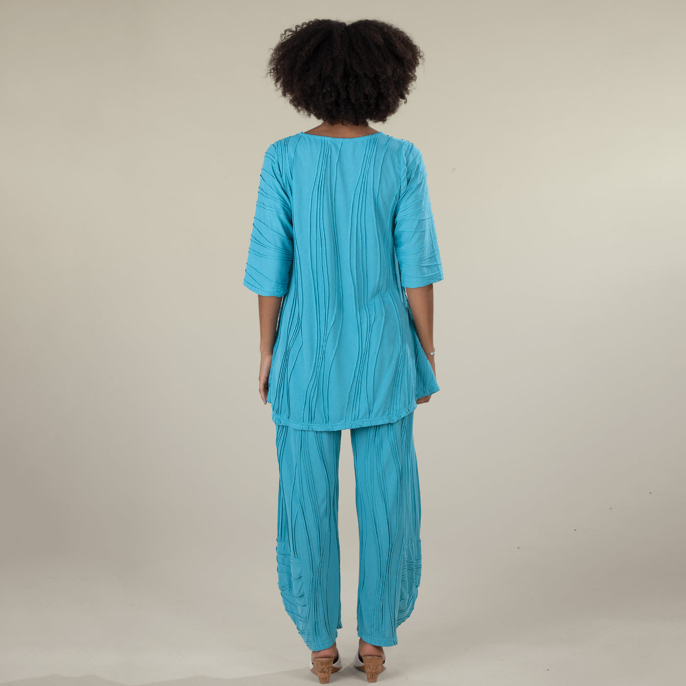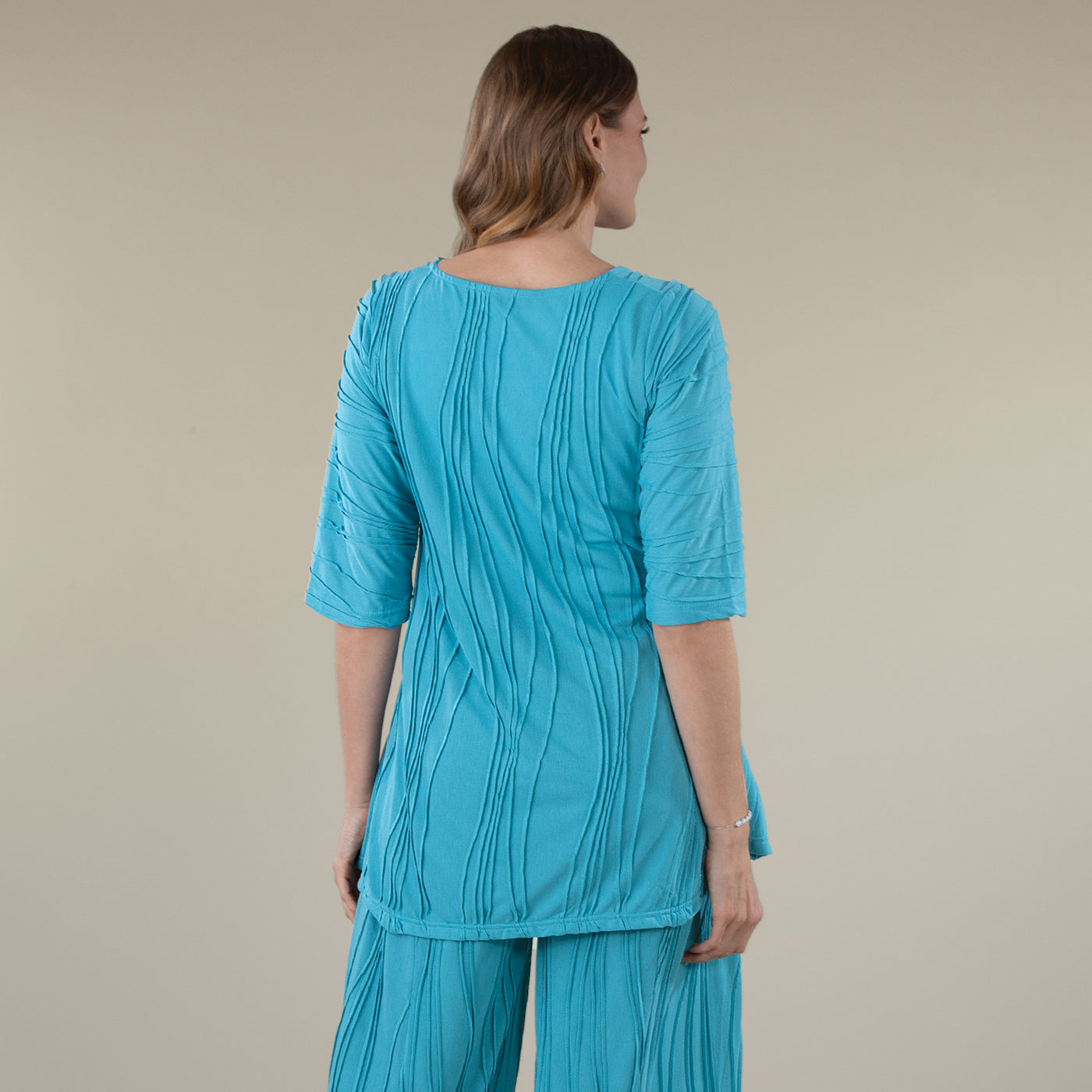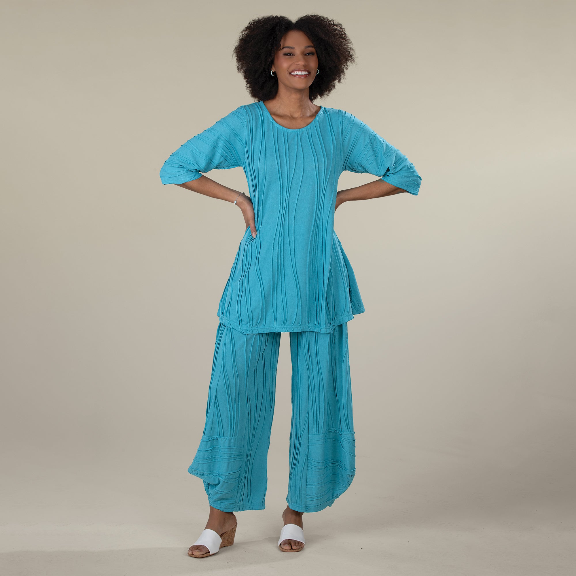 Our artisans of Nepal create this flowy, ocean blue knit cotton tunic with wave-inspired stitching. Features a scoop neck and 3/4-length sleeves. Do not wash with dark colors. Designed in NYC, handcrafted in Nepal. A perfect complement to the Capri Waves Pants. Available in: S/M 4-8, L/XL 10-14, XXL 16-18.