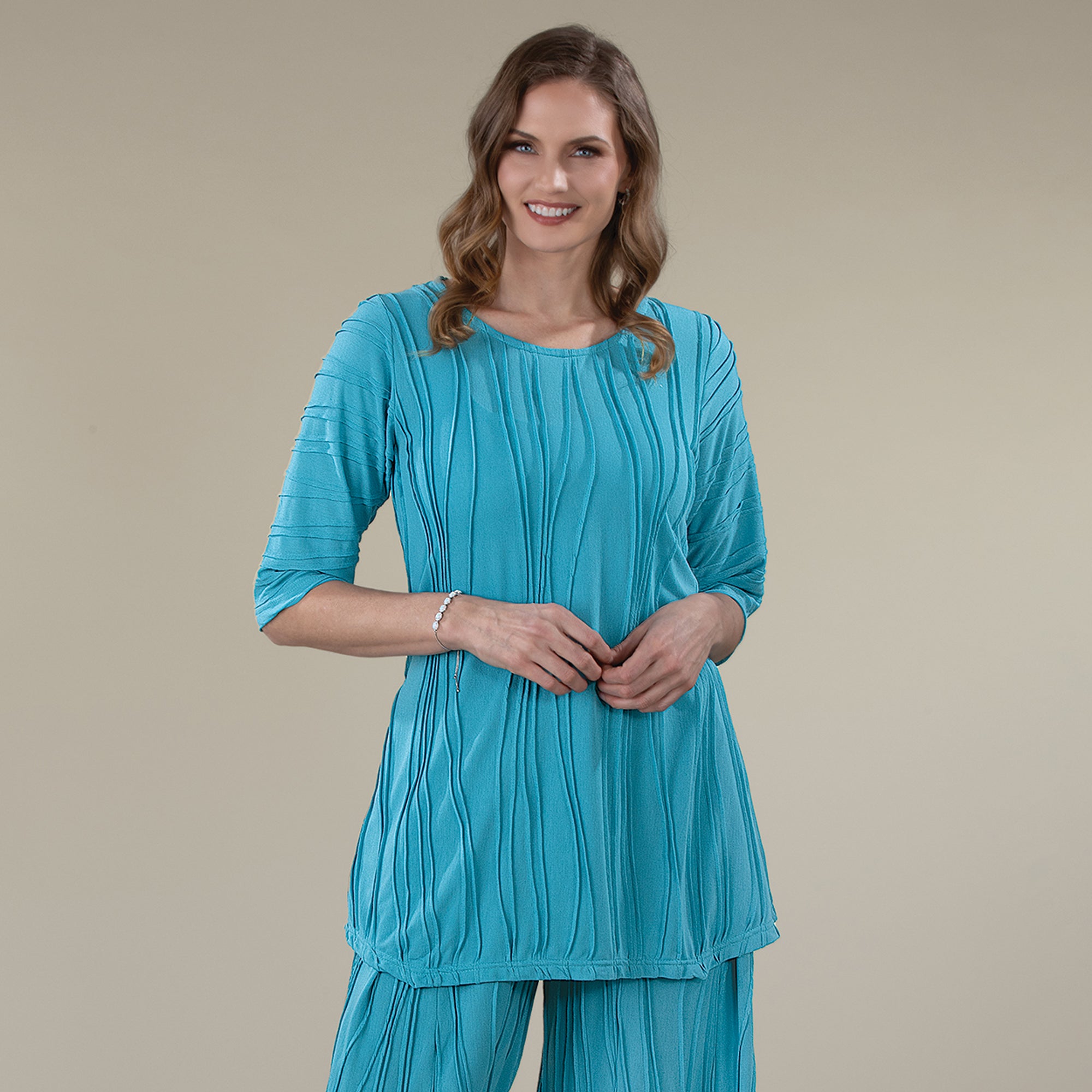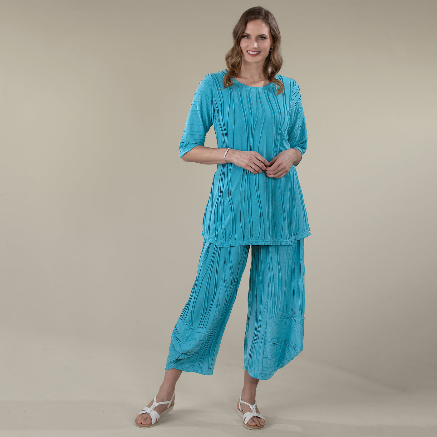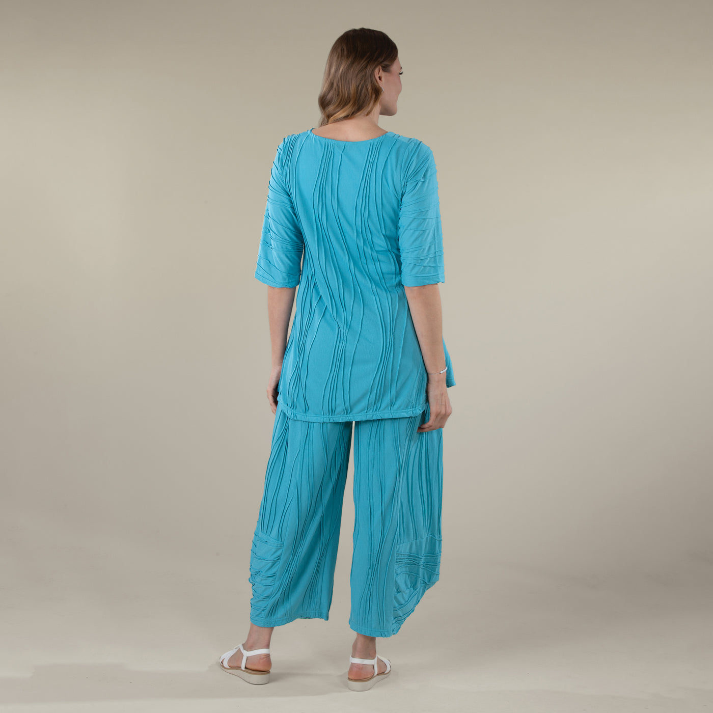 Our artisans of Nepal create this flowy, ocean blue knit cotton tunic with wave-inspired stitching. Features a scoop neck and 3/4-length sleeves. Do not wash with dark colors. Designed in NYC, handcrafted in Nepal. A perfect complement to the Capri Waves Pants. Available in: S/M 4-8, L/XL 10-14, XXL 16-18.