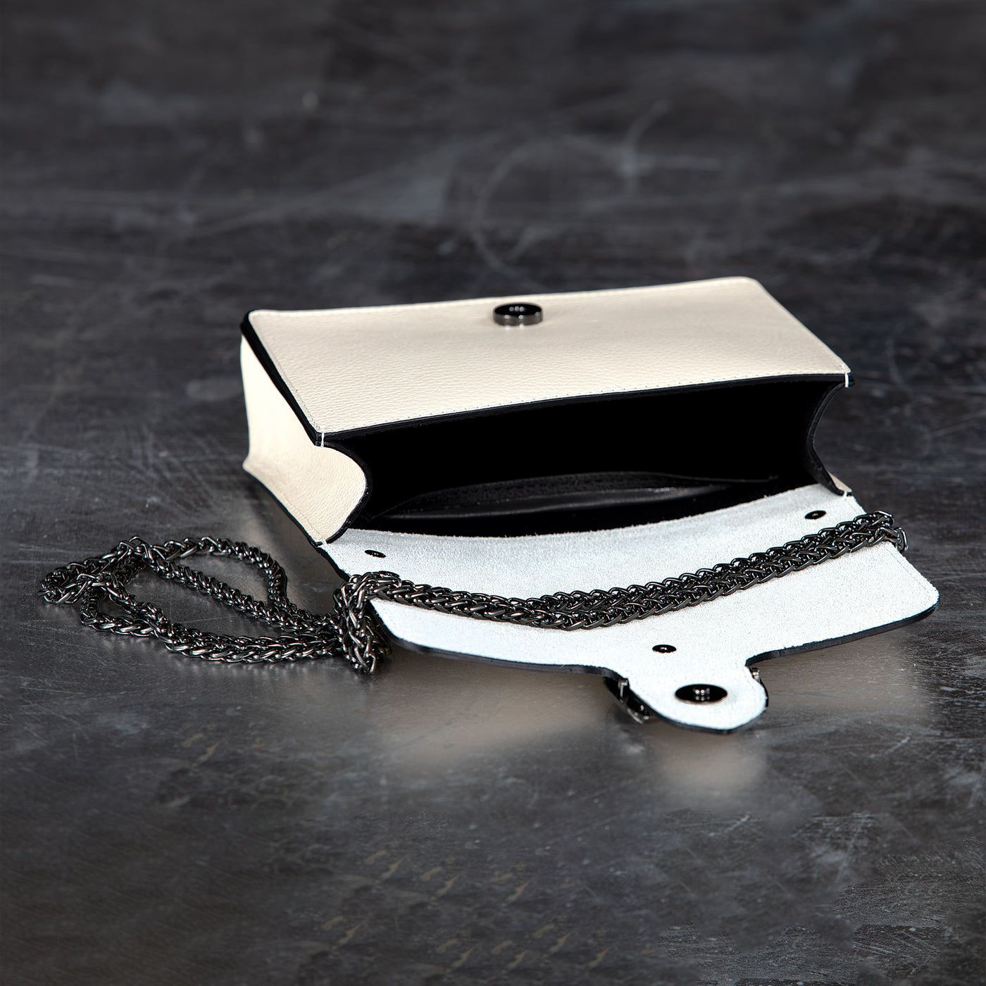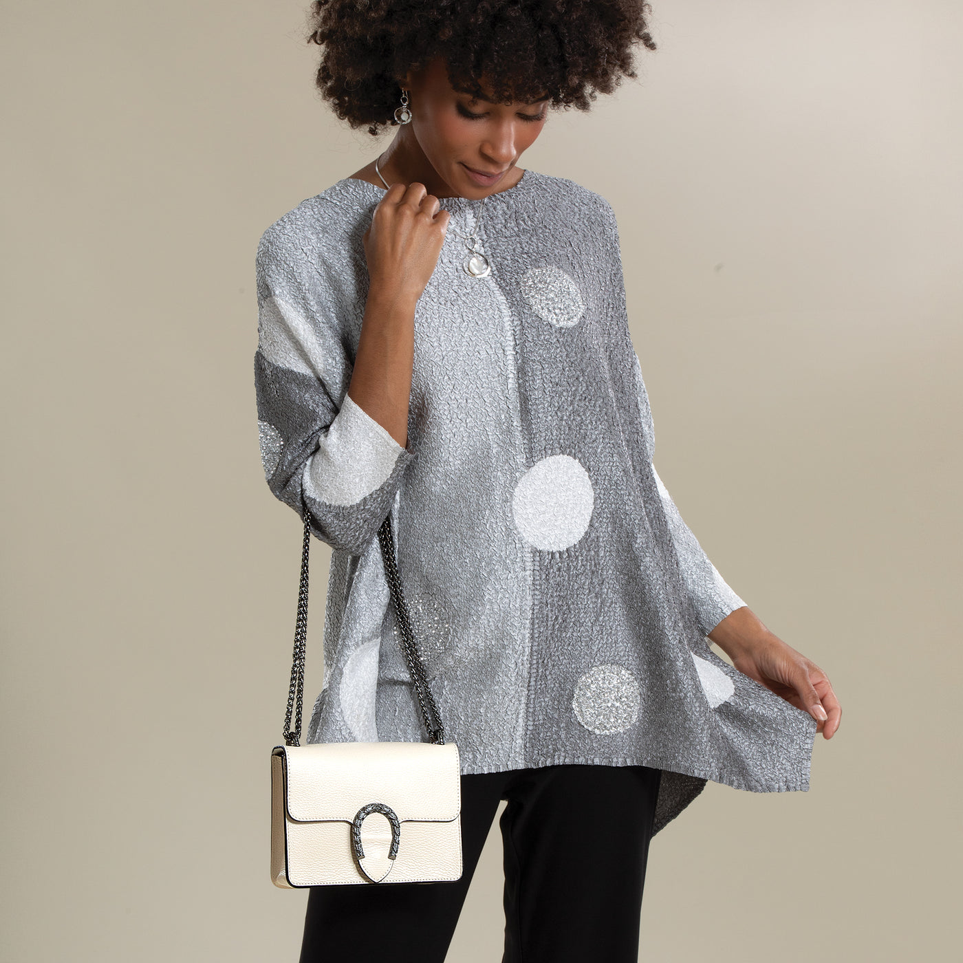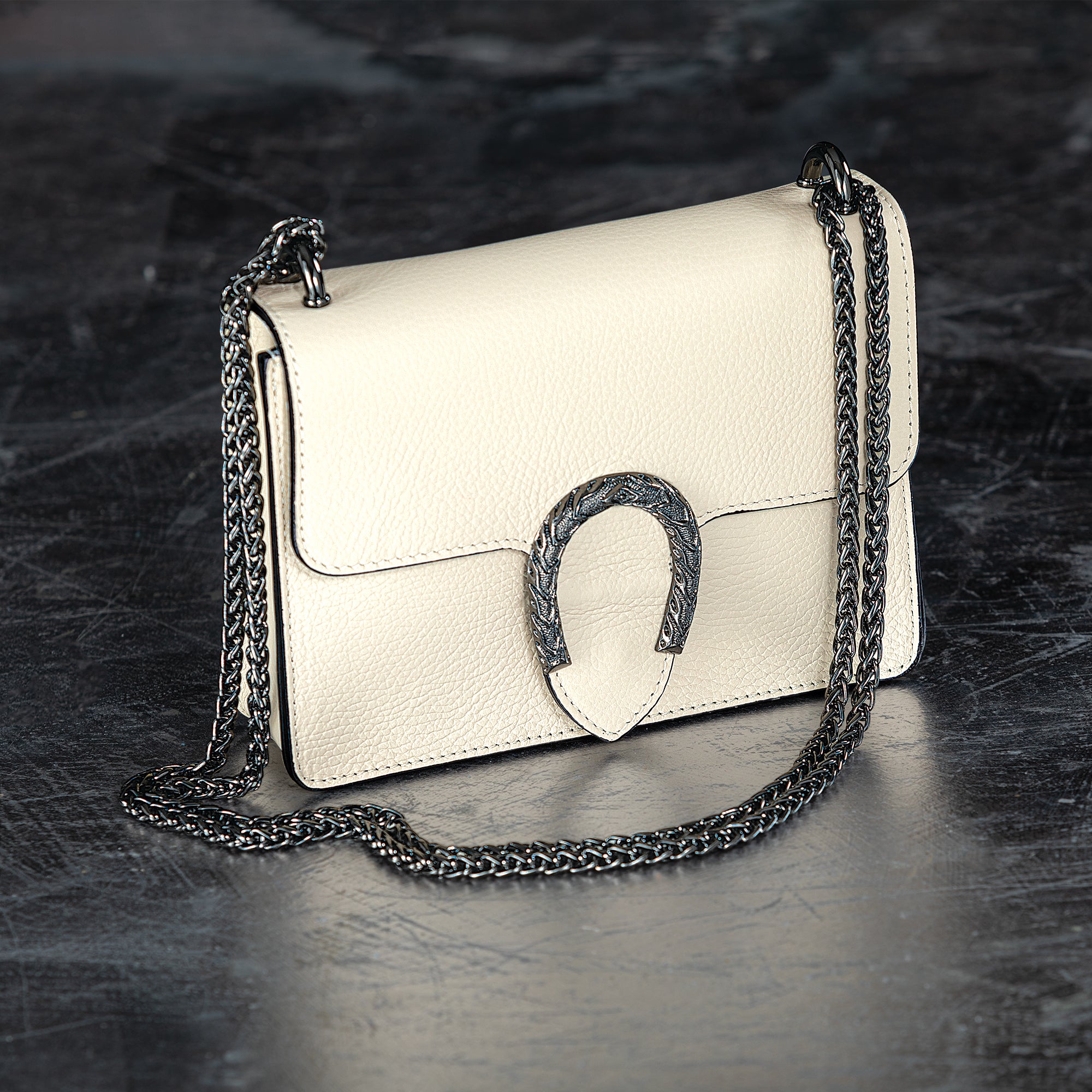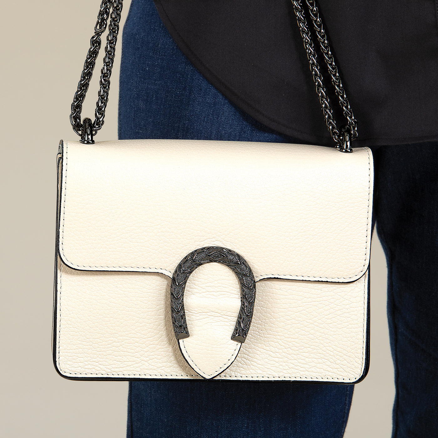 Artisan Marco of Florence creates this chic, structured bag with gunmetal accents. Approx. 7.5'' x 2.25'' x 6''. 13'' double chain shoulder strap, one interior pocket, unlined, snap closure with horseshoe-shaped accent.