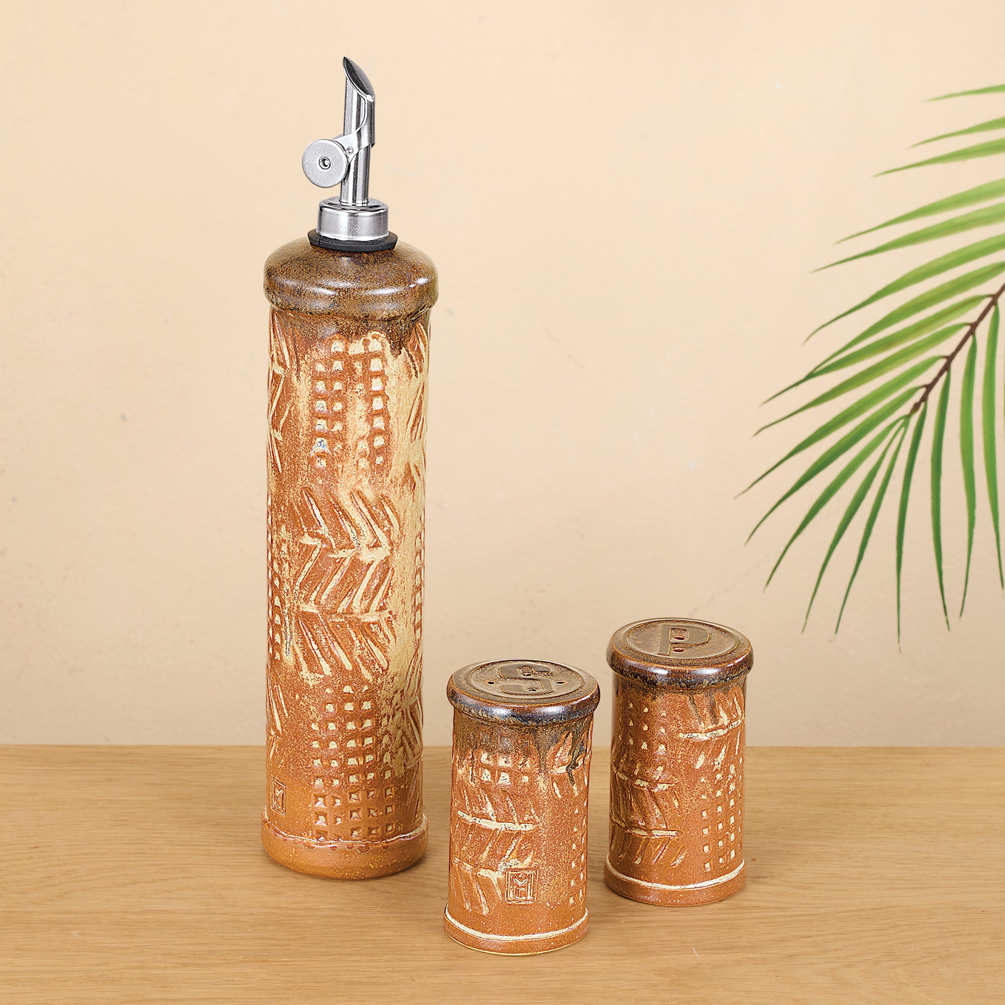 Michael of Wisconsin creates this ceramic cruet by hand-shaping clay, etching the design and glazing it with neutral tones. Coloring will vary due to glazing technique. With metal spout, approx. 11.5'' x 2.25''.
