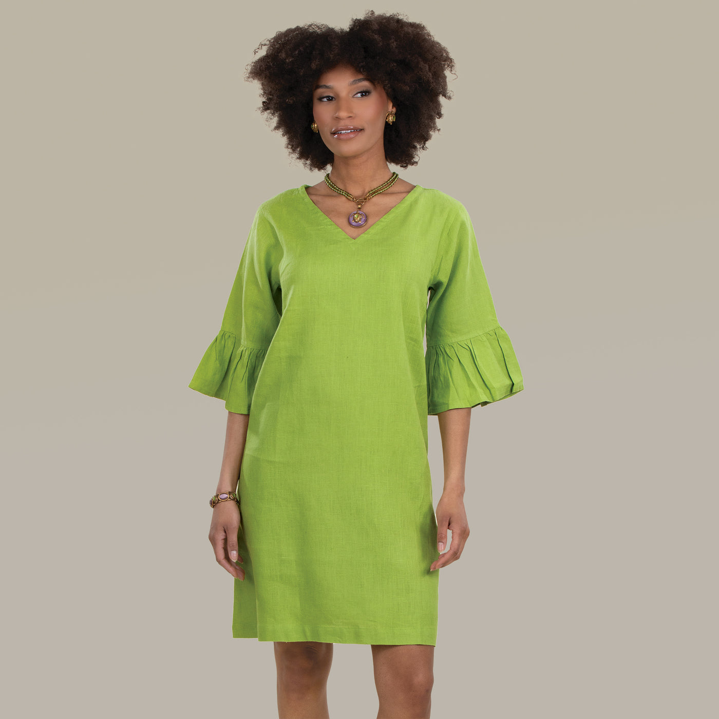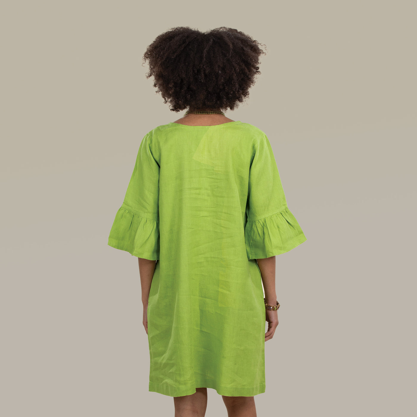 Our artisans of Kazakhstan design this fun and flirty lime green linen dress with a v-neck, elbow-length ruffled bell sleeves and knee length hem. Perfect for anything from a seasonal wedding to a day of shopping. Machine wash cold, gentle cycle. Hang to dry. Steam if desired. Available in: S 6-8, M 8-10, L 12-14, XL-16.