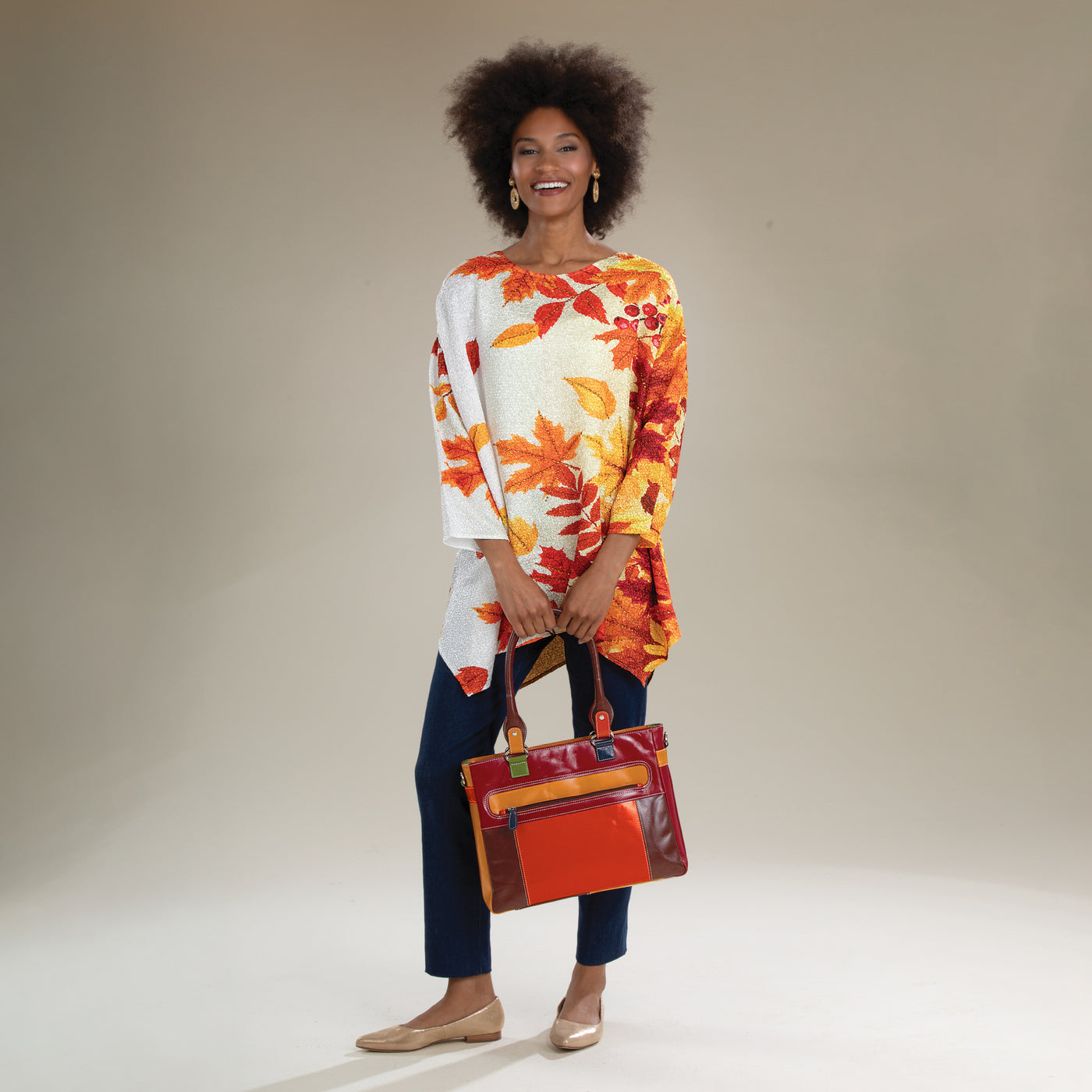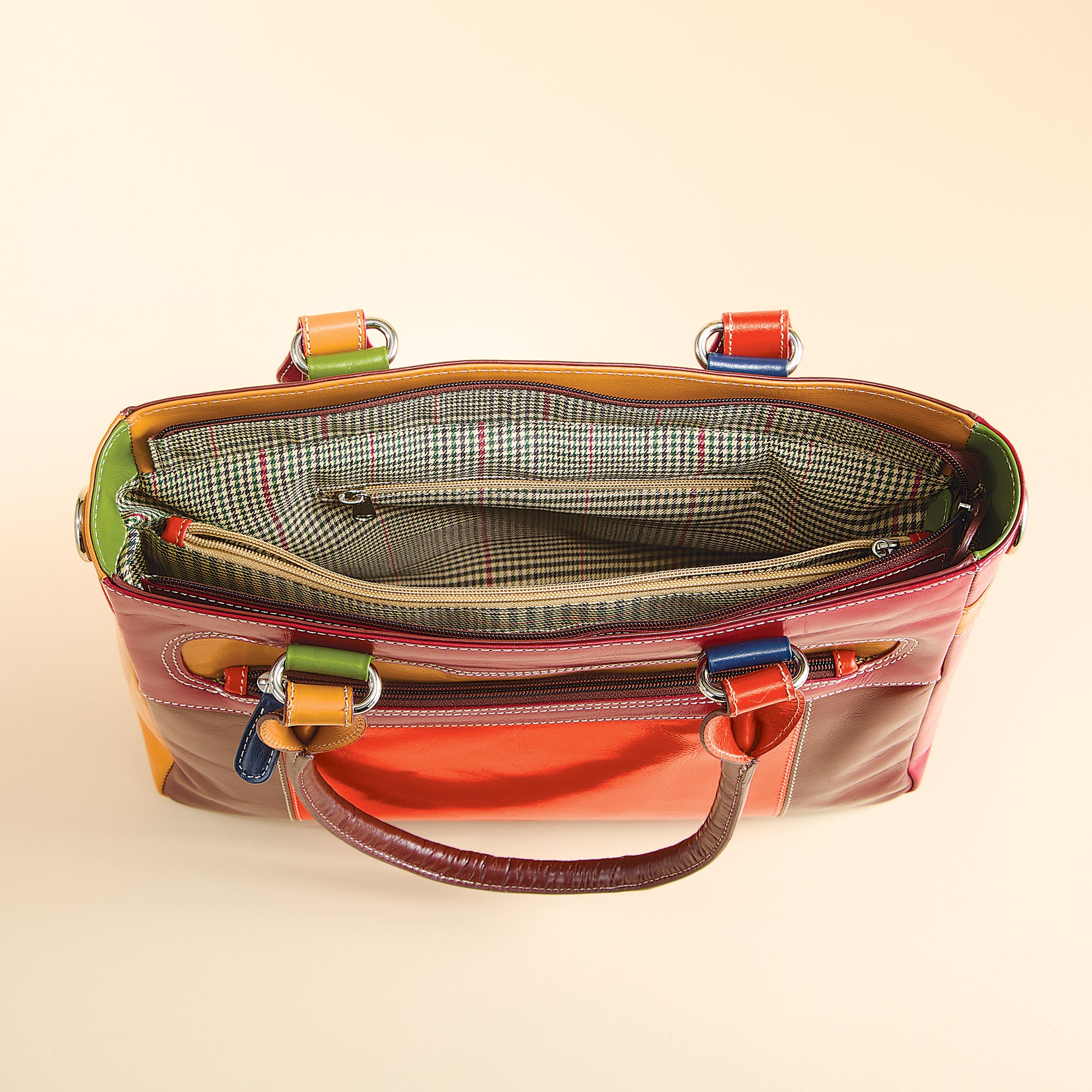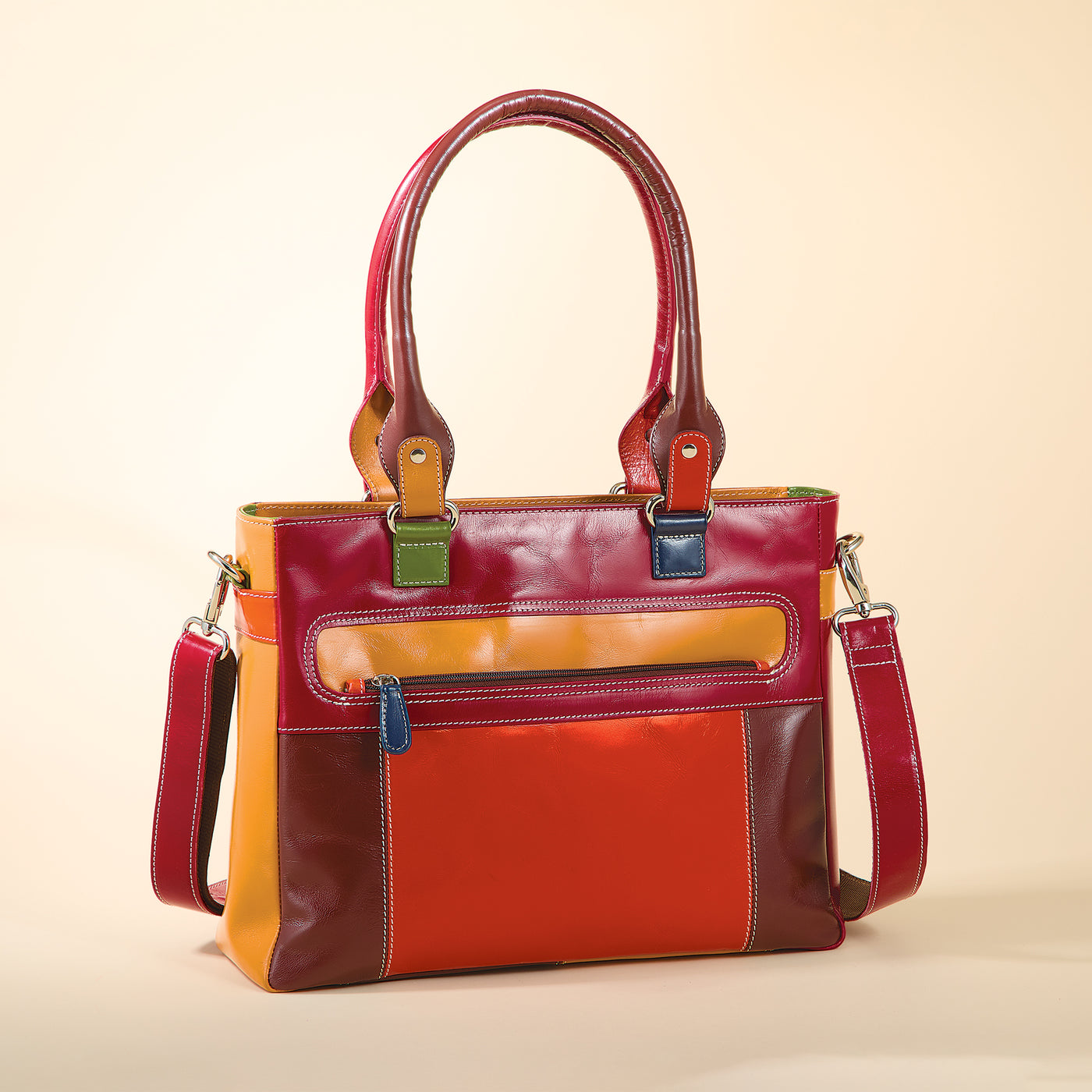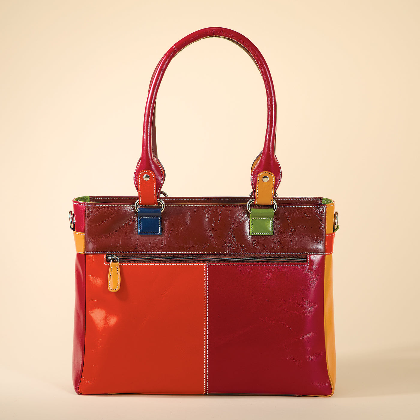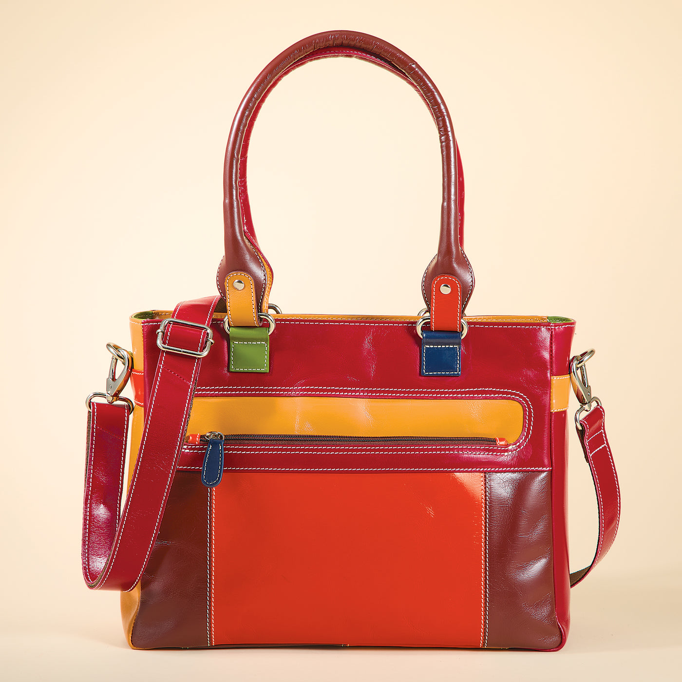 Our artisans of Kolkata, India handcraft this tote in a color block design, using rich shades of red, orange, navy, green and leather. Approx. 14'' x 4'' x 10.5''. 11'' handles, 23'' adjustable detachable strap, multiple pockets, plaid cloth lining, zipper closure.