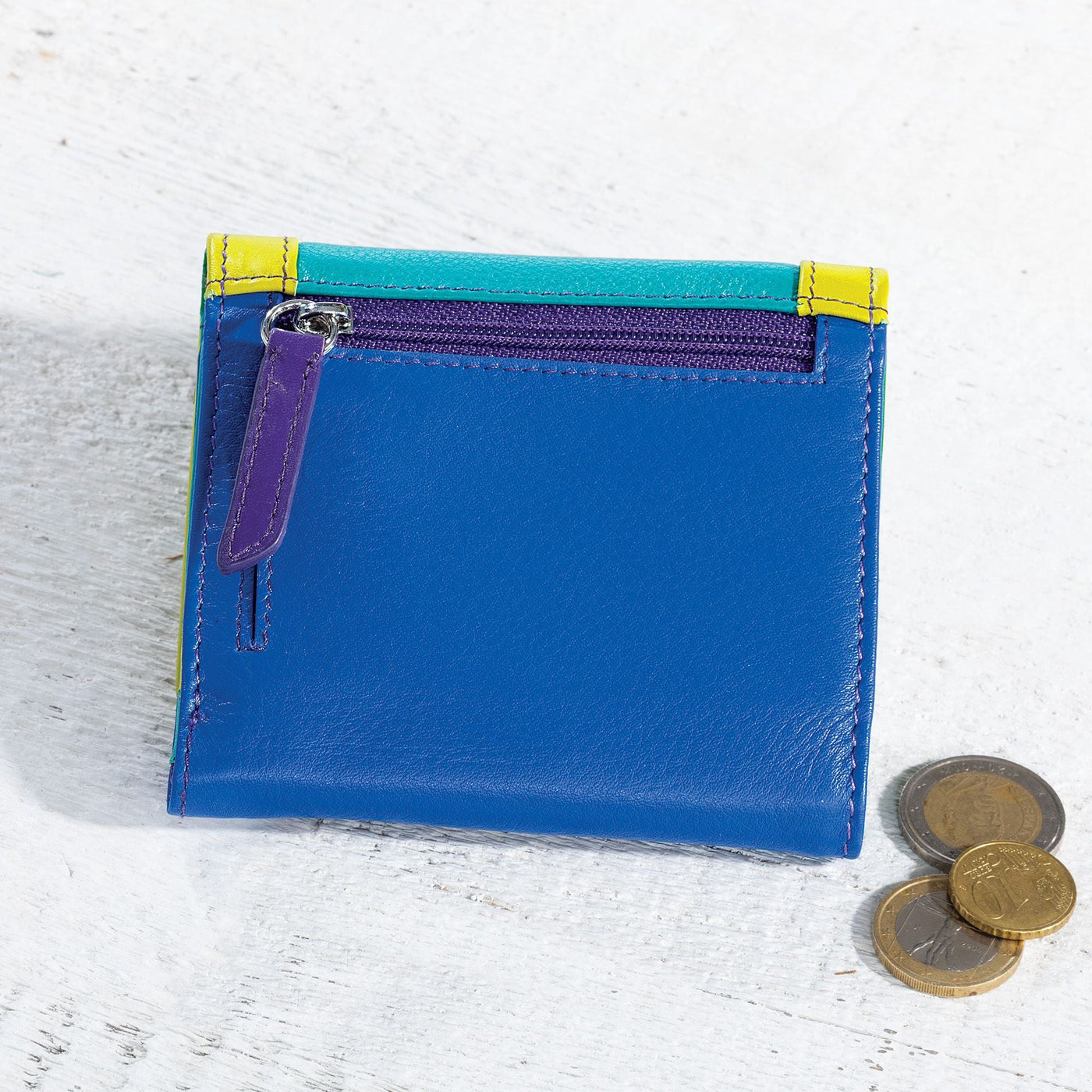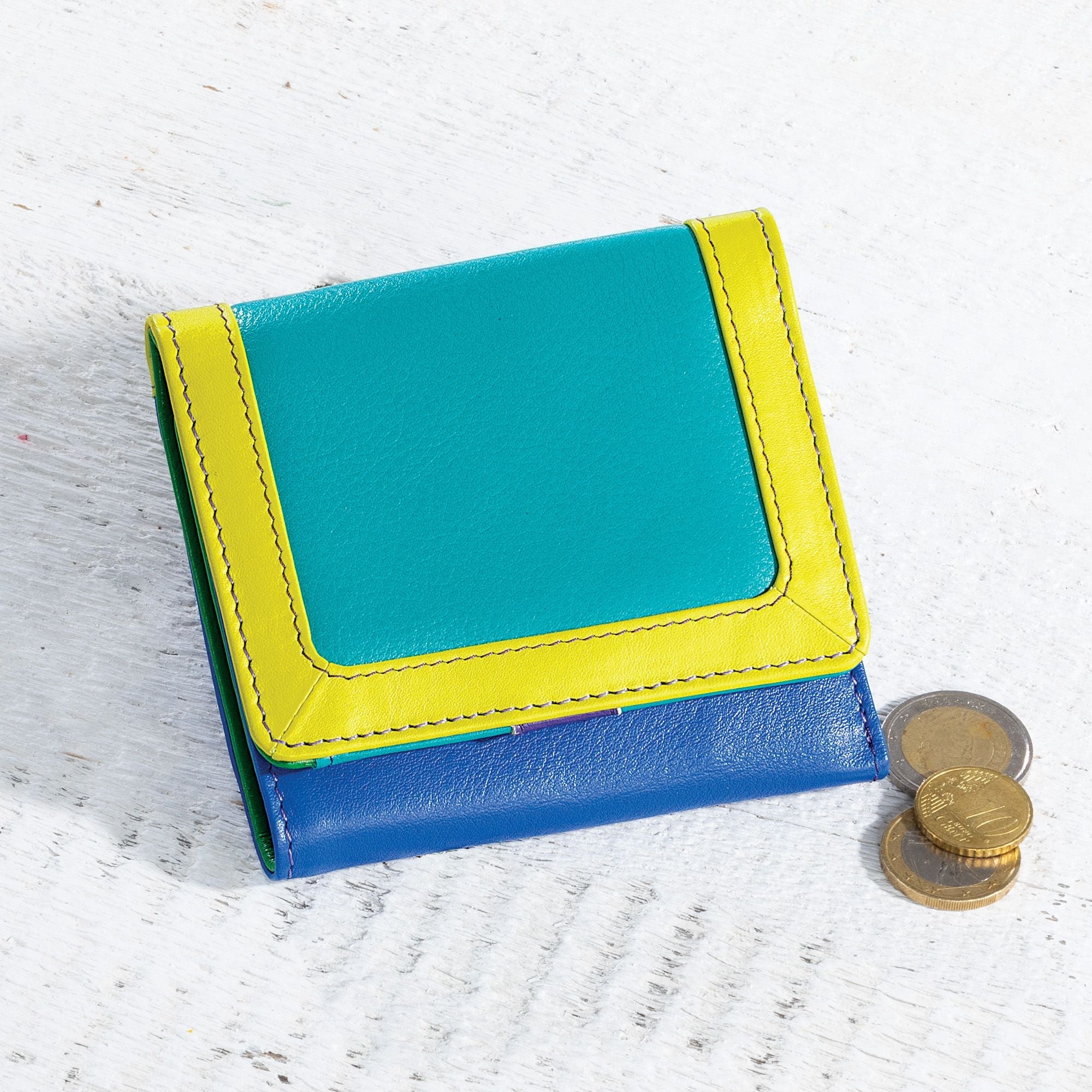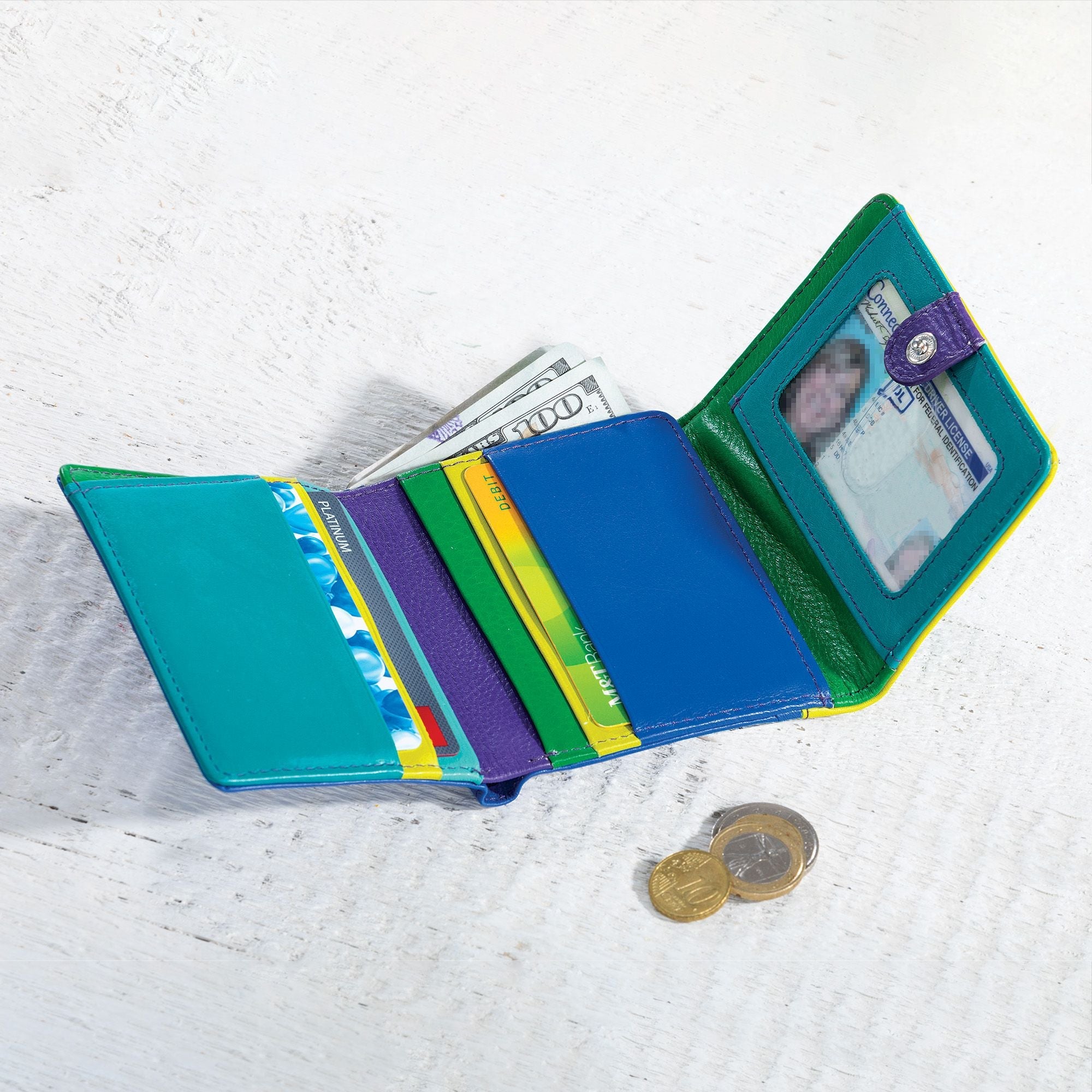 Supple blue and green leather is hand-stitched and lined with polyester by master craftsman to create each of these multi-colored trifold wallets. Approx. 4.25'' x 3.75'' x .5'', one currency pocket, six credit card slots, one ID window, and one back zip pocket.