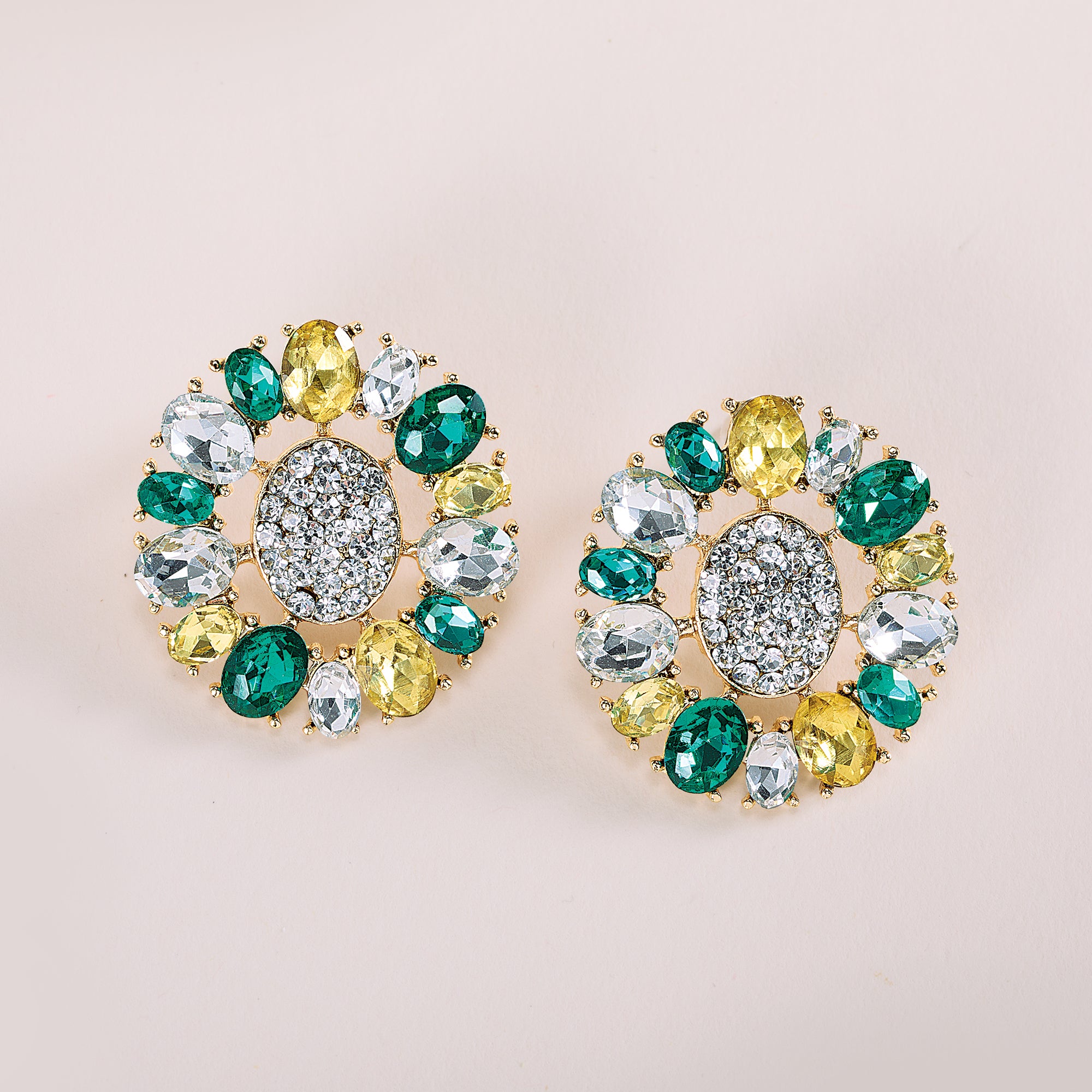Handcrafted with a mix of sparkling clear, green and yellow crystals, with pave crystal centers, set in gold-plated copper. Designed and crafted by Beatrice and Francesco of Italy. Approx. 1.5'' long, posts.