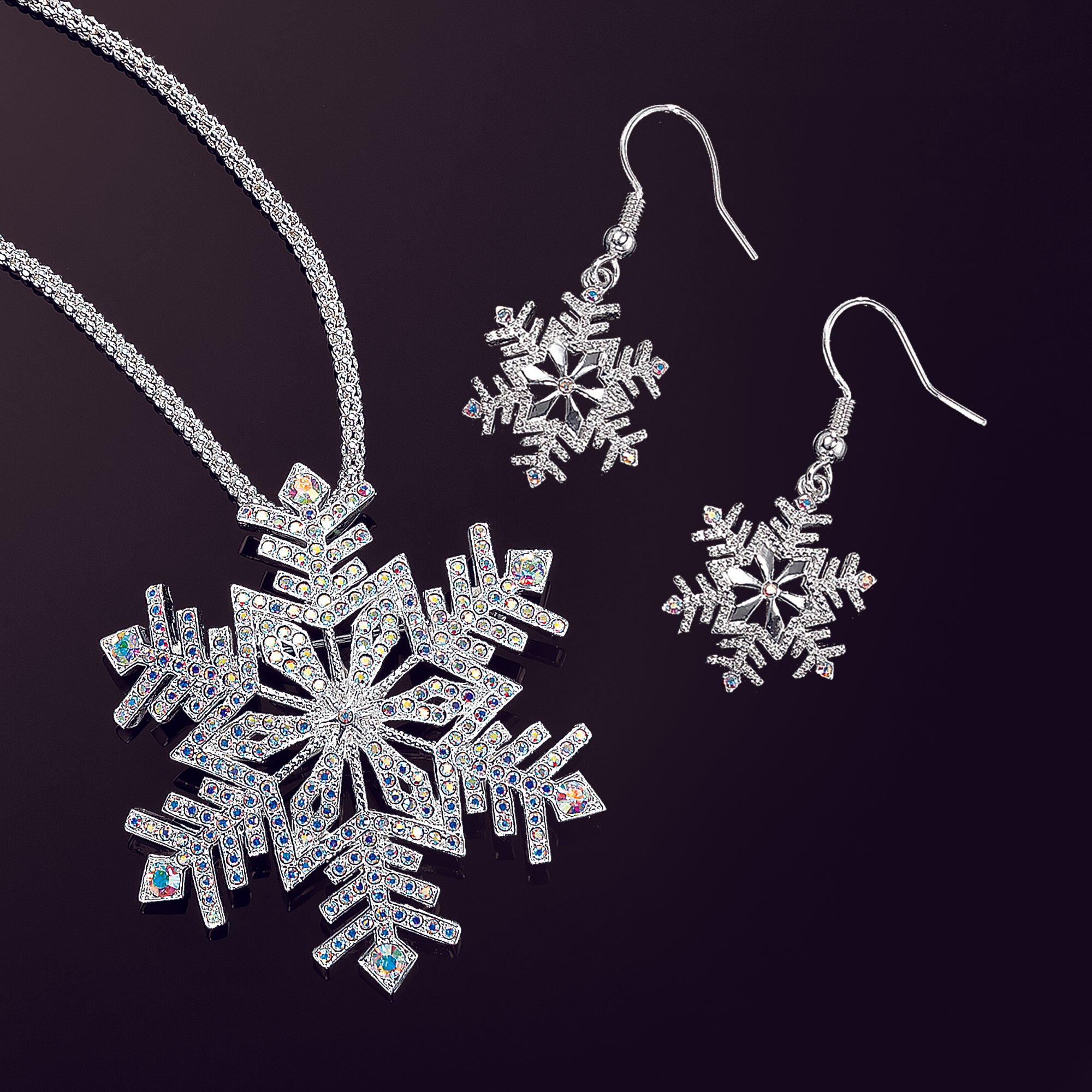 This delightful snowflake jewelry set from our London jeweler brings dazzling sparkle to any holiday outfit. Each necklace and earring is handmade from rhodium-plated sterling silver and then decorated with hand-set Czech crystals. Handcrafted for Uno Alla Volta, from the heart and hands of the artisan. Dimensions- Necklace, 17'' long, 1.75'' dia. pendant, 2'' ext., lobster clasp. Earrings, 0.75'' long, wires.