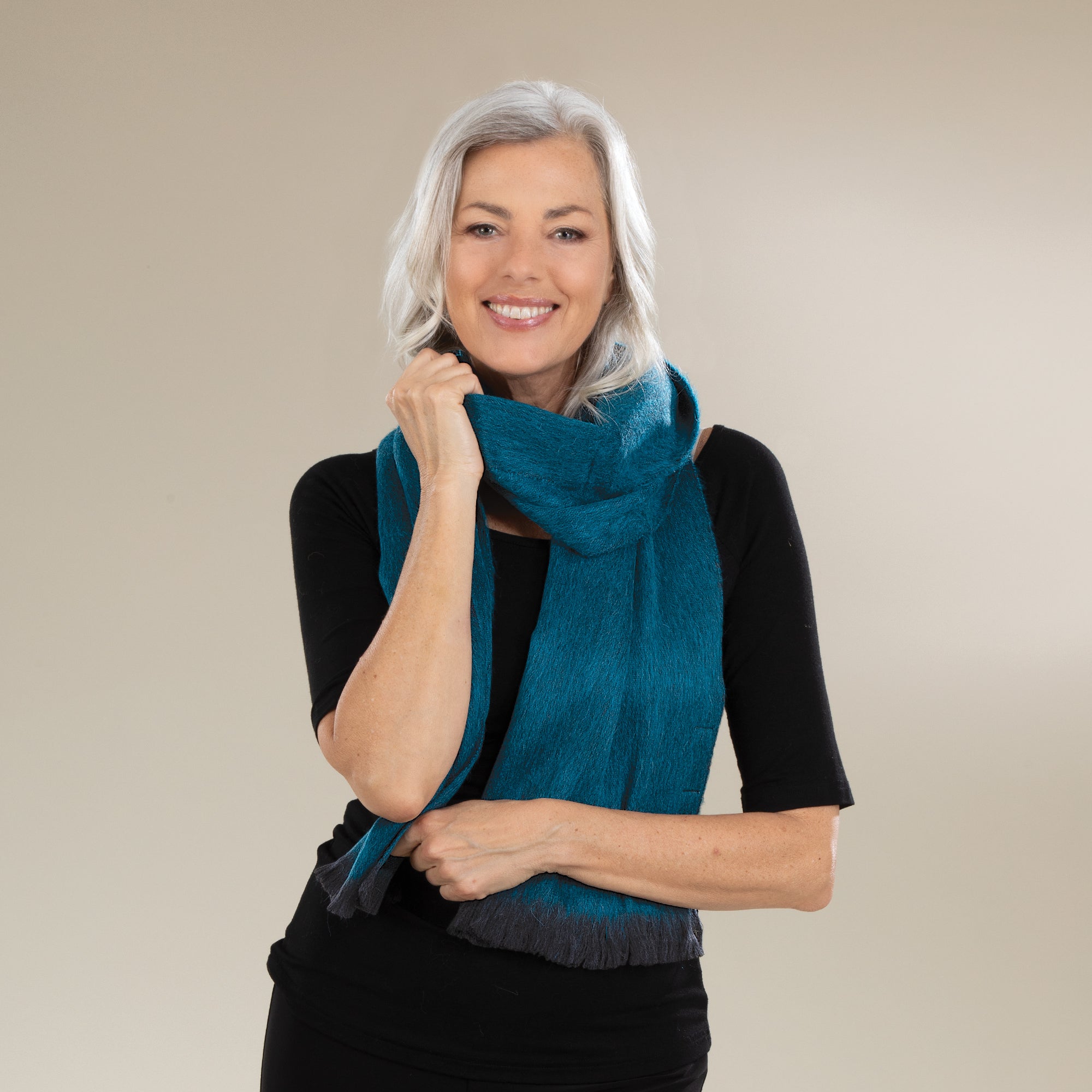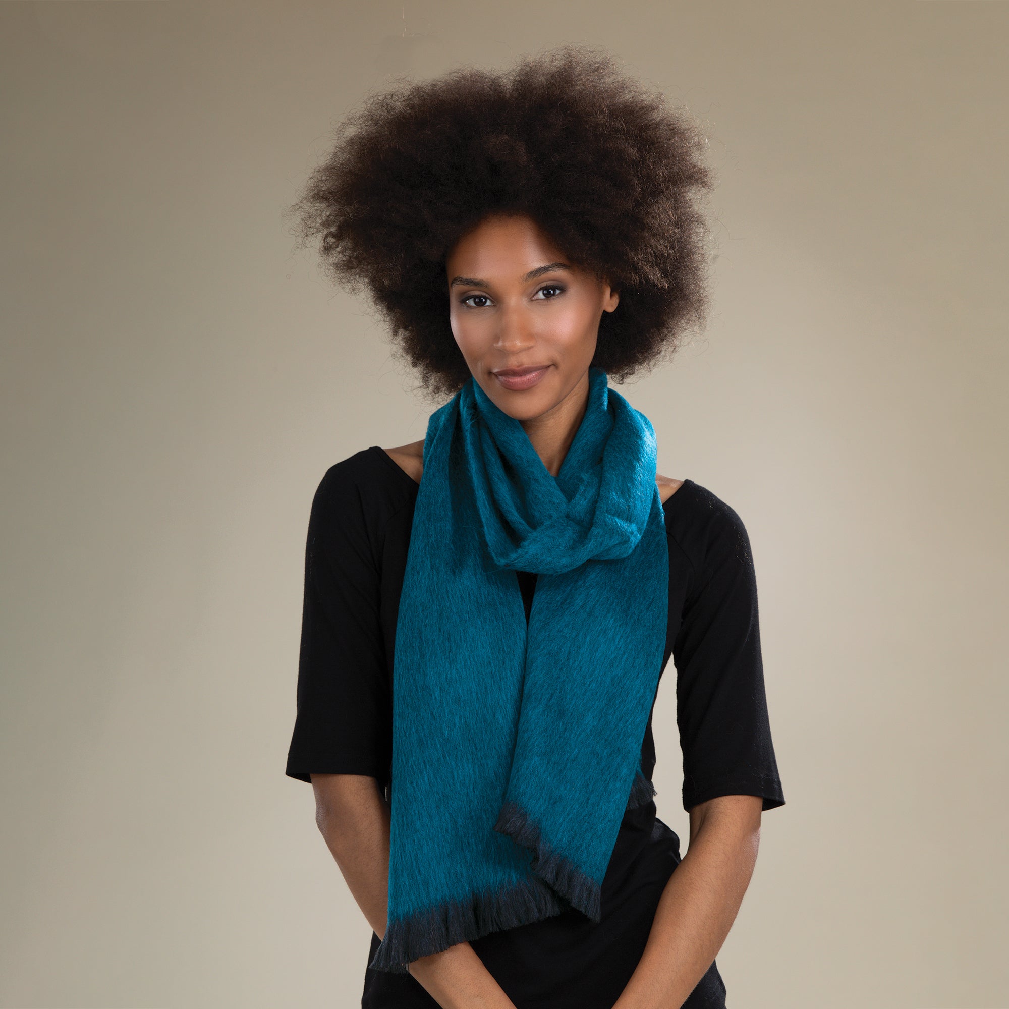 Our weavers in the Andean Quechua communities of Ecuador and Peru use centuries-old looms to handcraft this contemporary dark turquoise alpaca scarf from one of nature's most versatile and renewable materials. Warmer than wool, this silky, hypoallergenic scarf is hand-woven of 80% pure alpaca with 20% acrylic for resilience. Hand wash. Handcrafted for Uno Alla Volta, from the heart and hands of the artisans. Dimensions - Approx. 72'' x 11''.