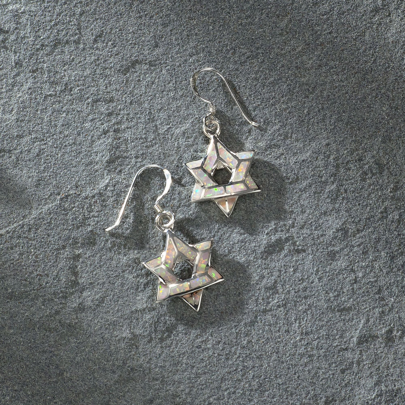 These sterling silver Star of David earrings are inlaid with a matrix of iridescent white opal by Leon Nussbaum, our London silversmith. Opal, considered ''the queen of gems,'' can flash patterns of color representing every hue of the rainbow as they flicker and change with every movement of the wearer. Believed by ancient peoples to actually contain fire, opal has long been ascribed many mystical and healing properties. These opal and sterling silver Star of David earrings are masterfully handcrafted exclusively for Uno Alla Volta, from the heart and hands of the artisan. No two are exactly alike. Earrings measure approx. 2 inches long, wires.