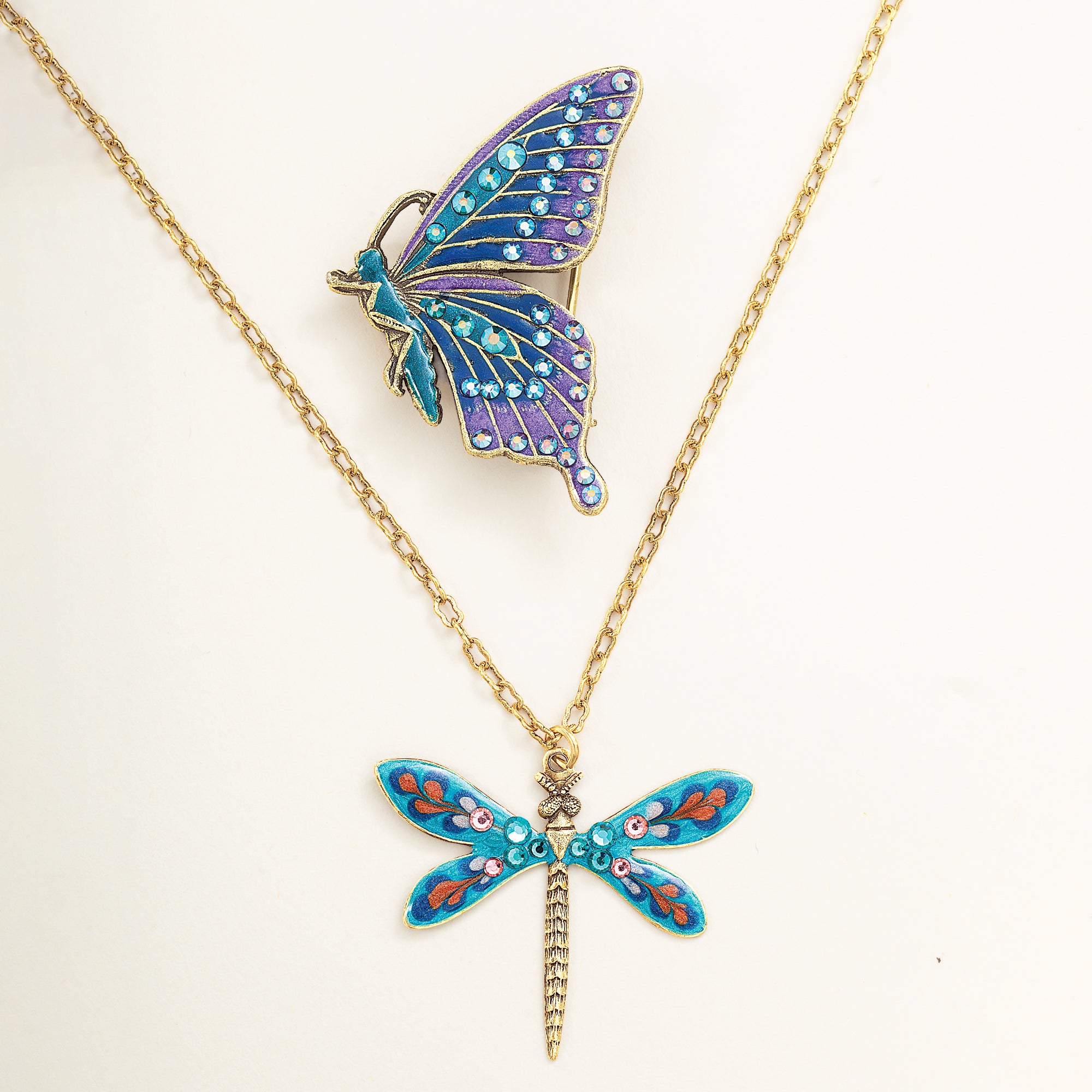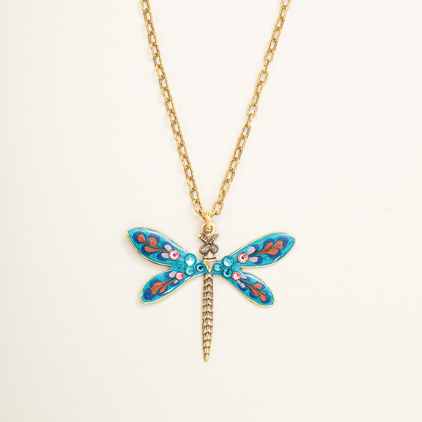Anne of New York designs this whimsical dragonfly pendant necklace with colorful enamels and hand-set crystals. Set in antiqued brass. Many believe dragonflies are signs of love, good fortune, transition, and hope for the future, so what a lovely gift for someone special, including yourself. Approx. 16'' long, 2'' ext., 1.25'' pendant, lobster clasp.