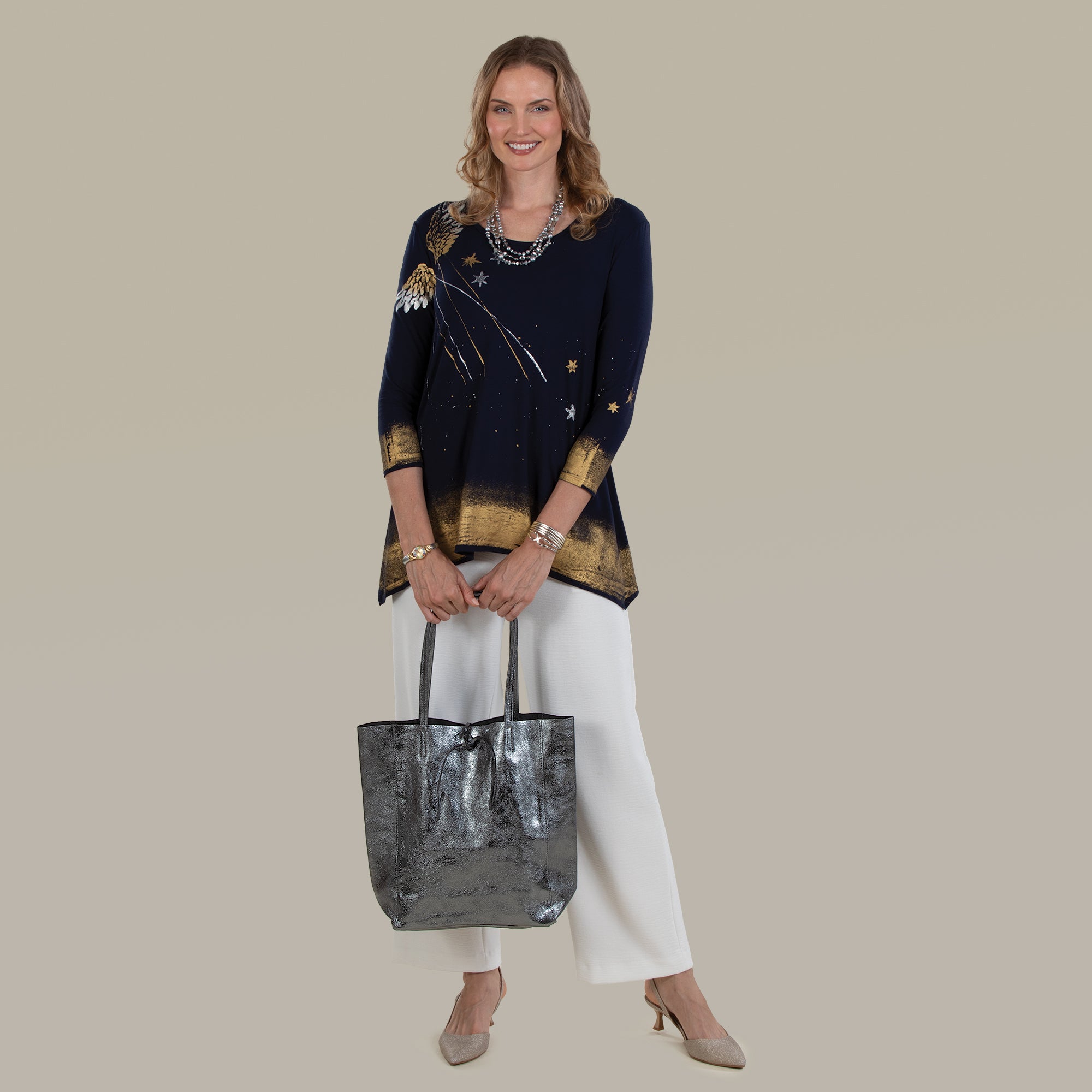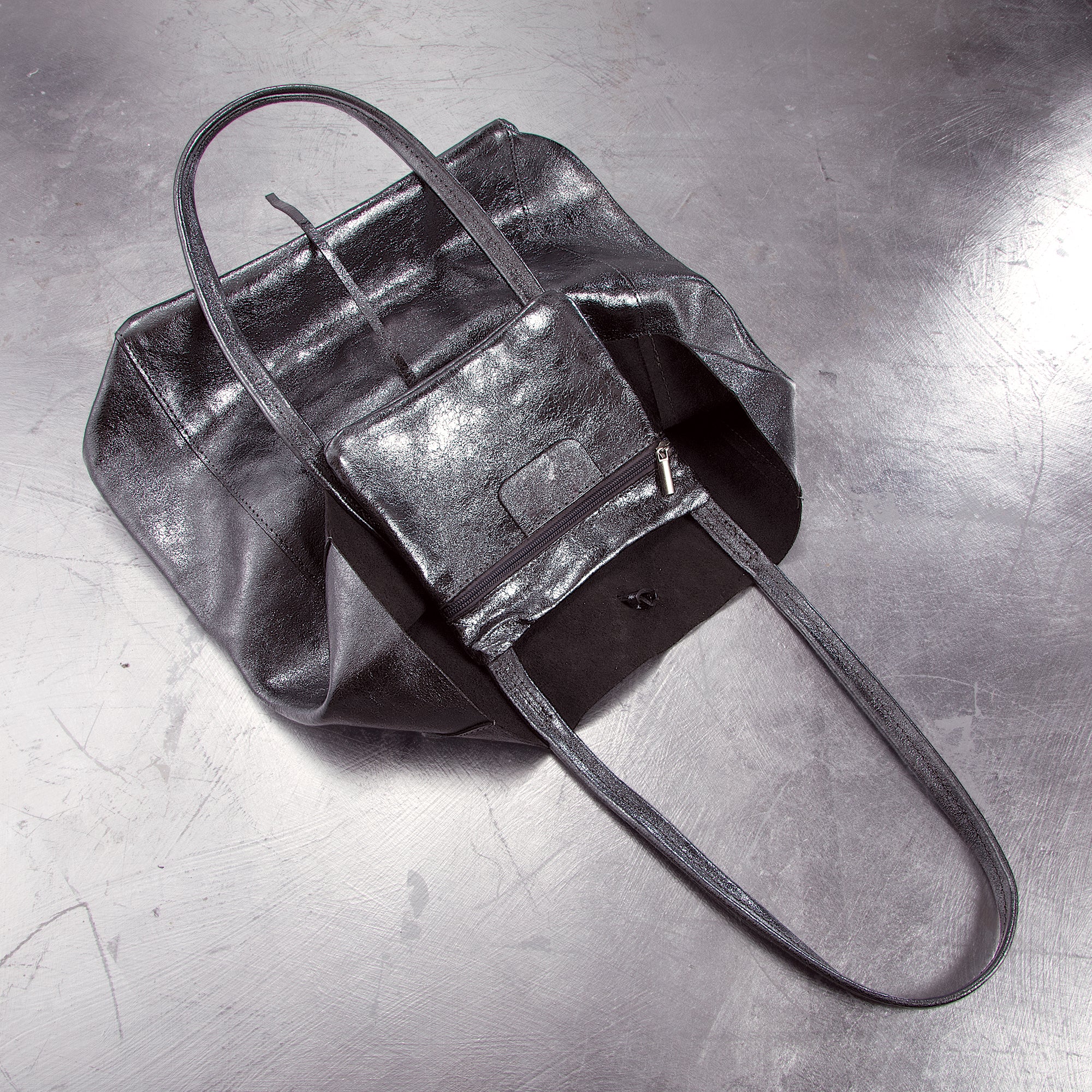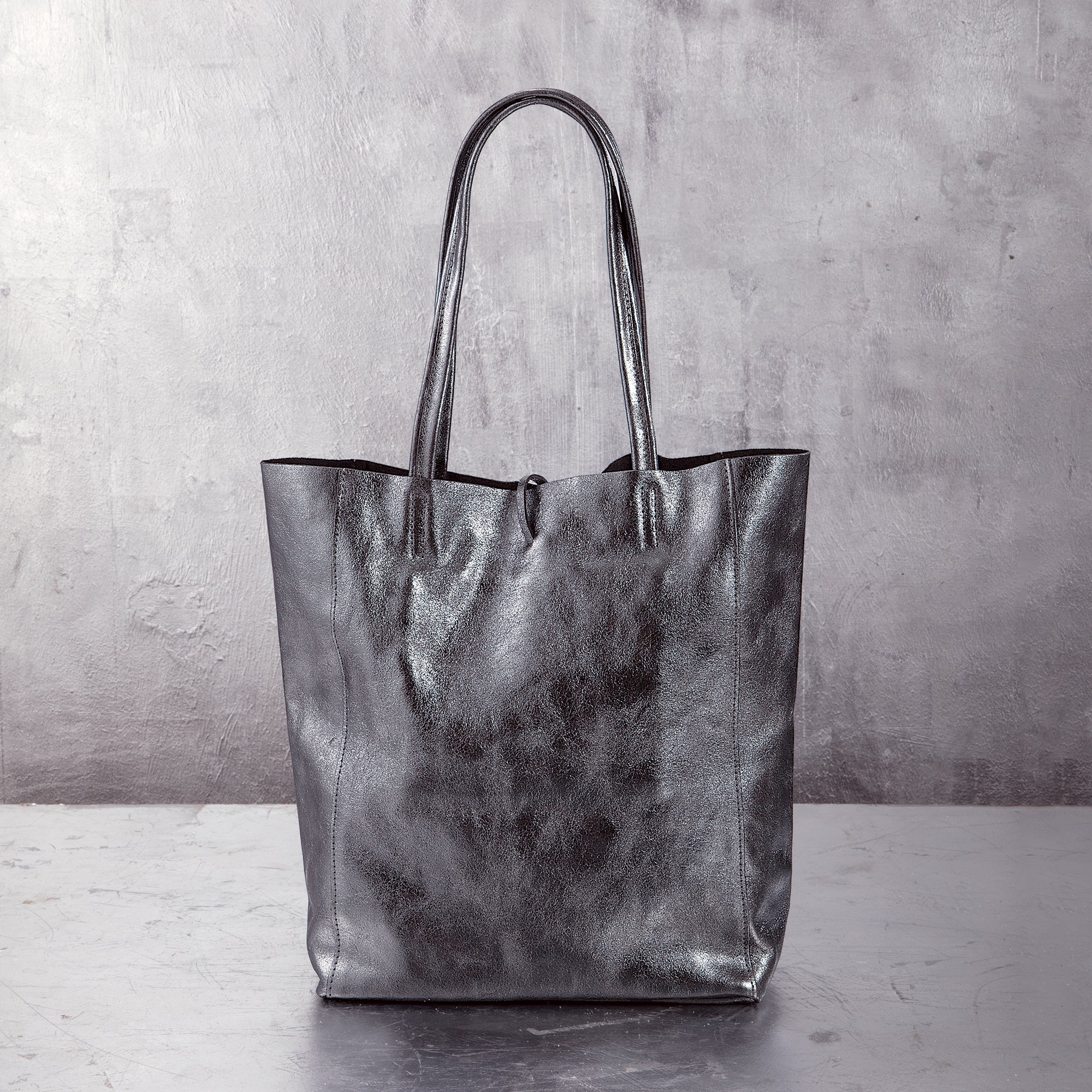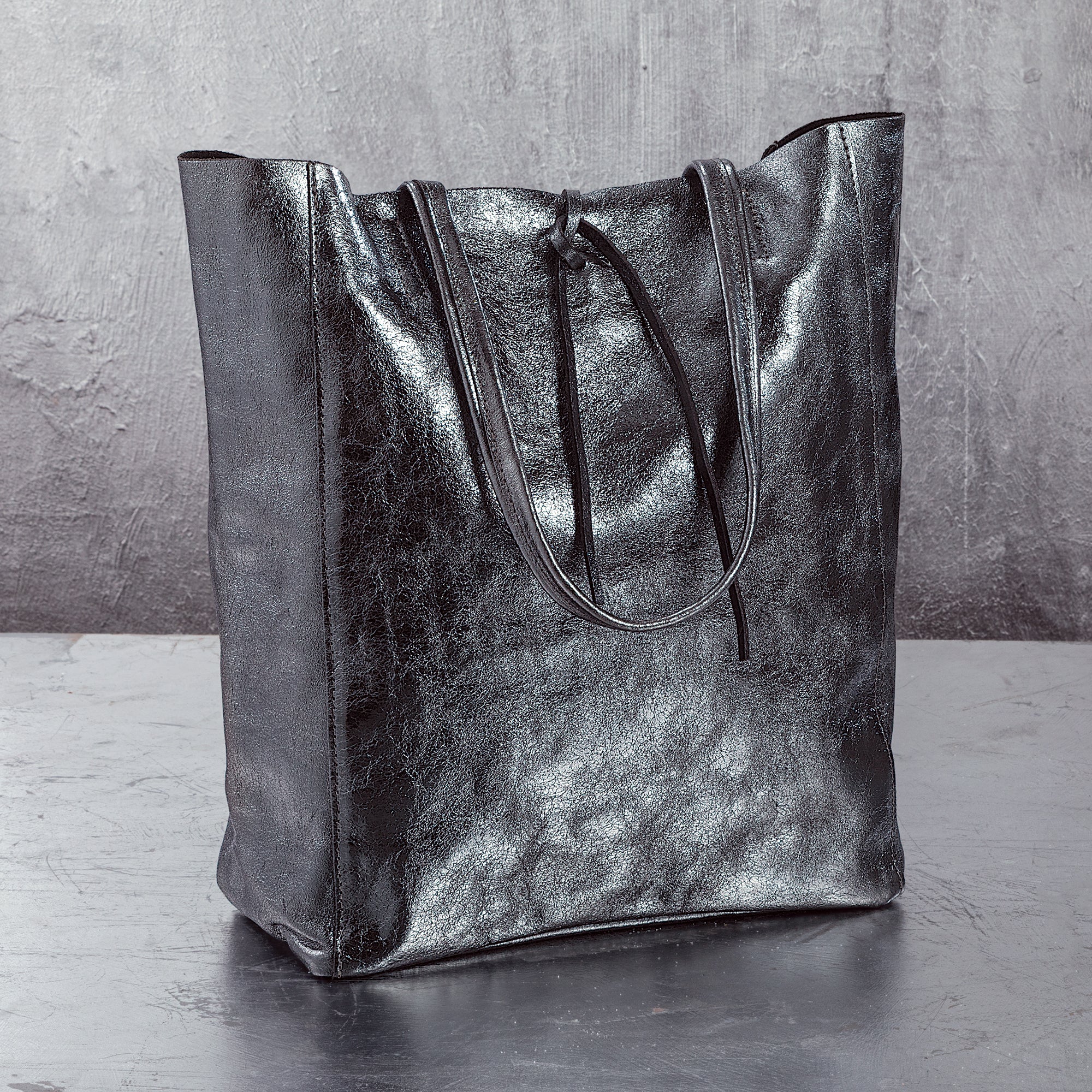 Our best-selling tote, designed by Marco of Florence, in this sleek silver metallic shade. Handcrafted in Italy of supple leather. Destined to become a go-to bag! Approx. 11.5'' x 5'' x 14.5'', with 9.5'' handles. Unlined, zipper pouch, tie closure.