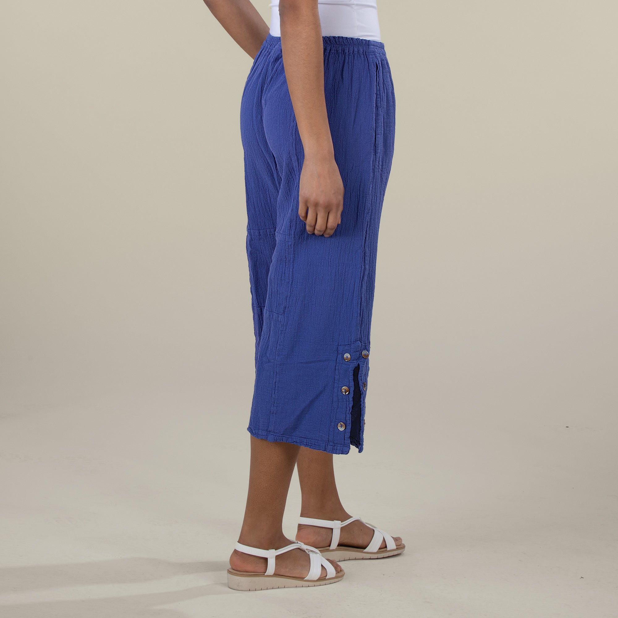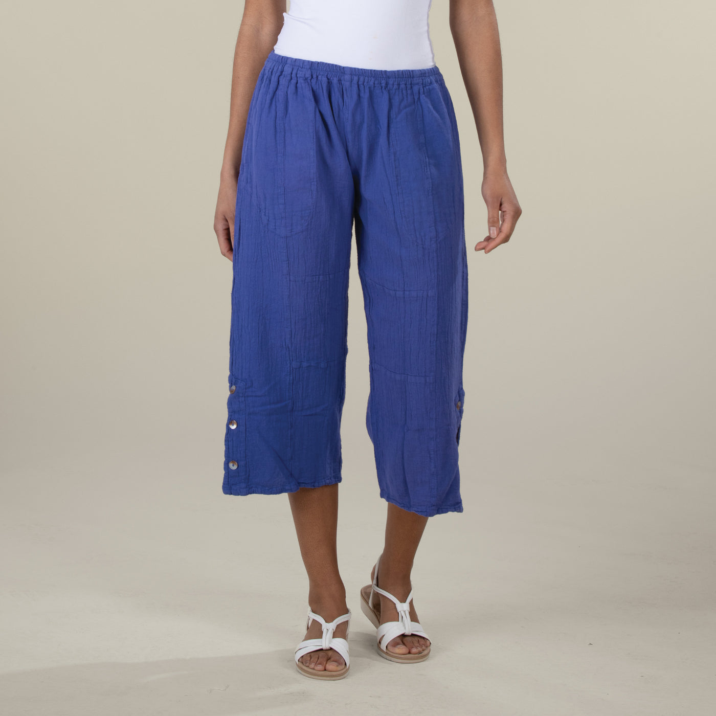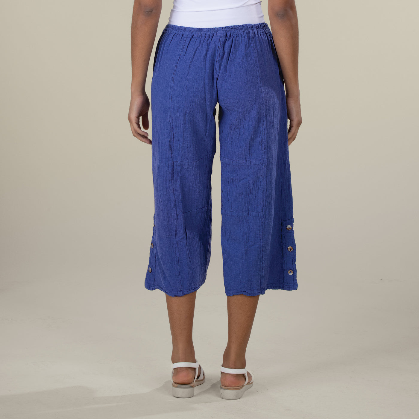 Designed in Florida and handcrafted by master artisans in Mexico, these blue cotton pants feature two pockets, a slightly widened leg with slits on both pant leg bottoms, and an elastic waistband. Machine wash separately with cold water and mild detergent, then tumble dry on cool. Available in: XS/S 0-4, S/M 6-10, L/XL 12-16, 2X/3X 18-22.