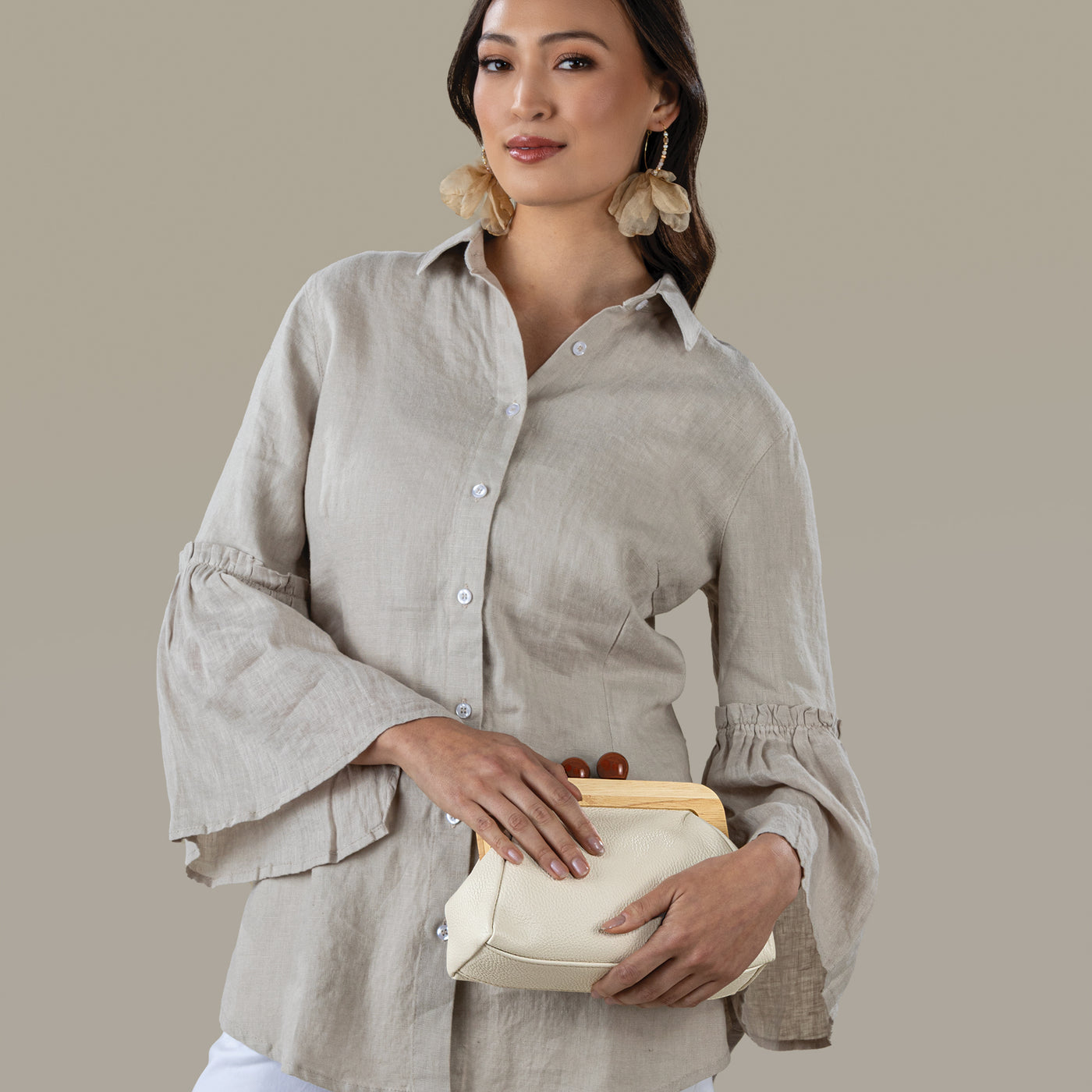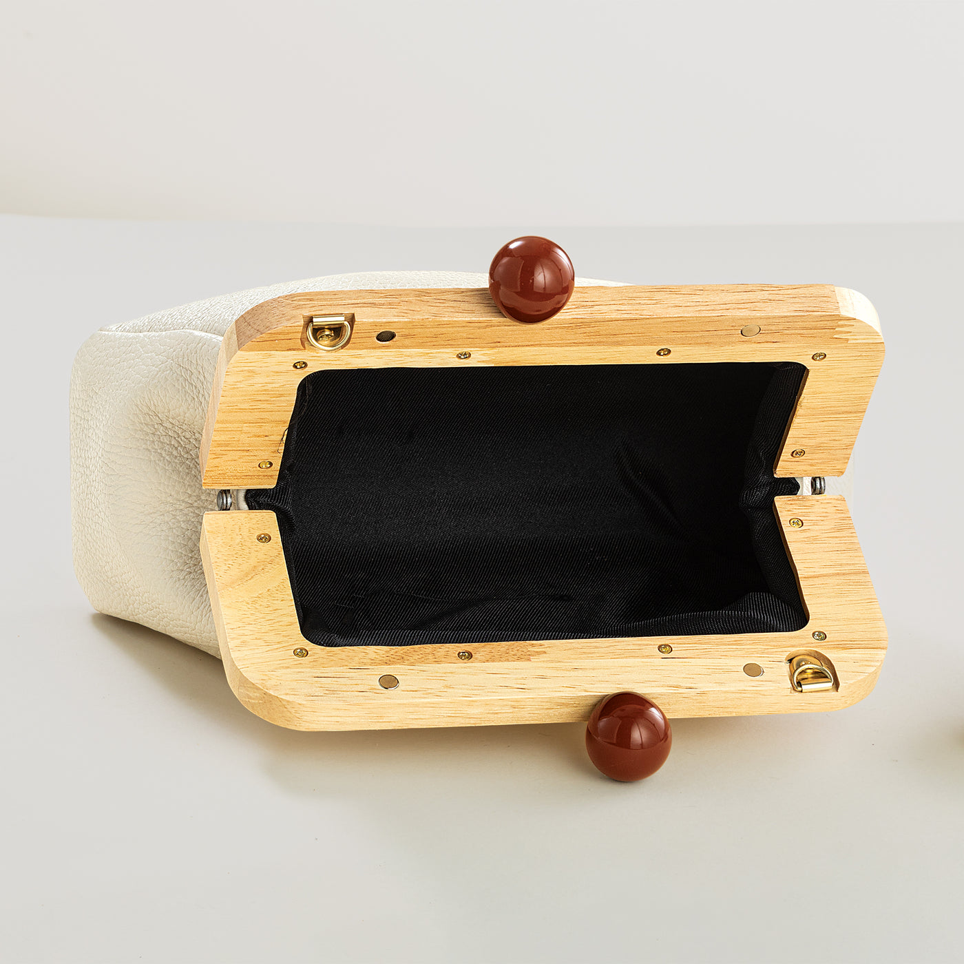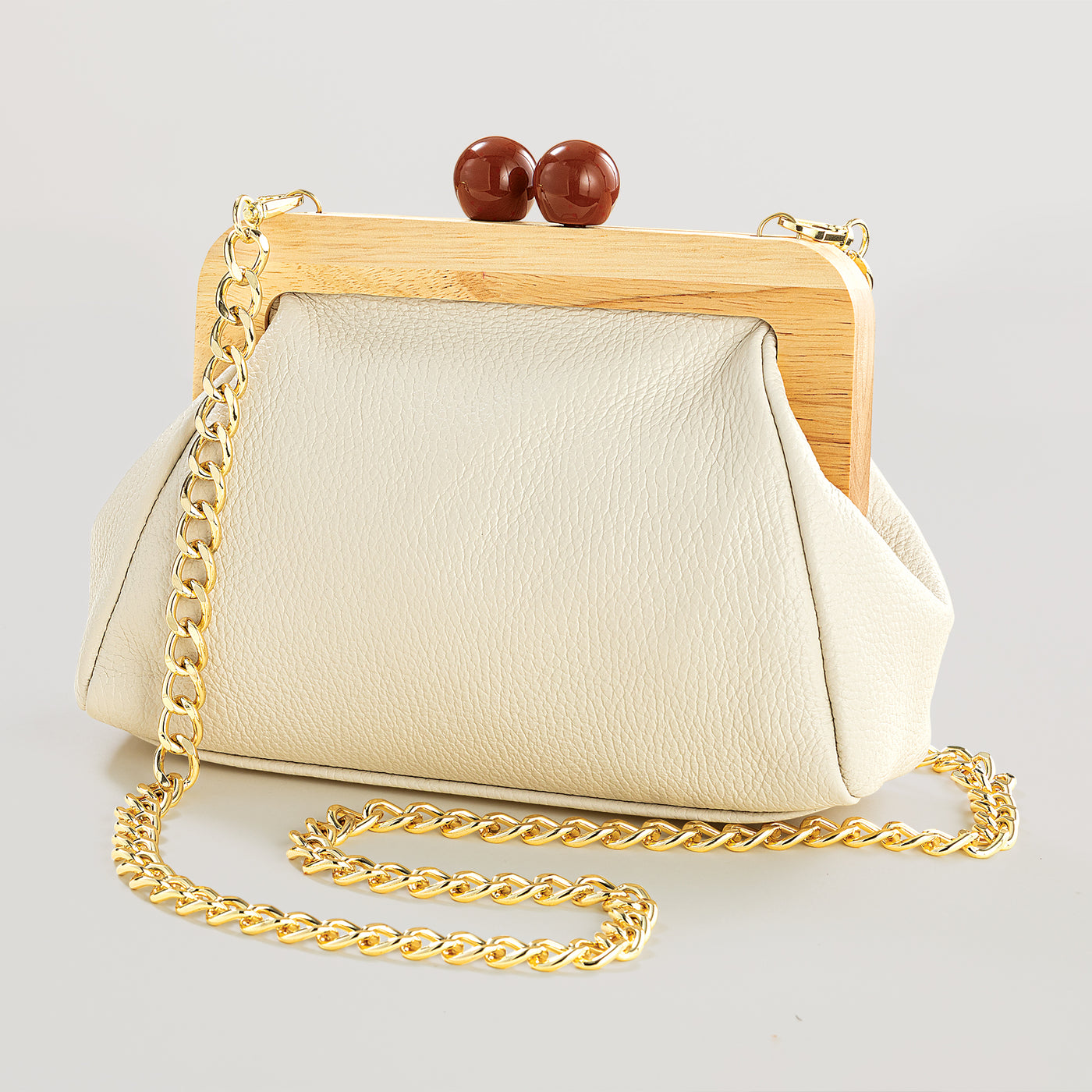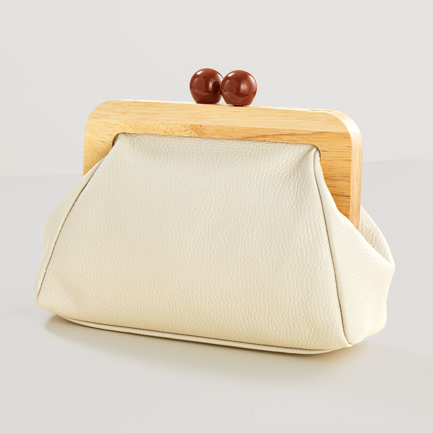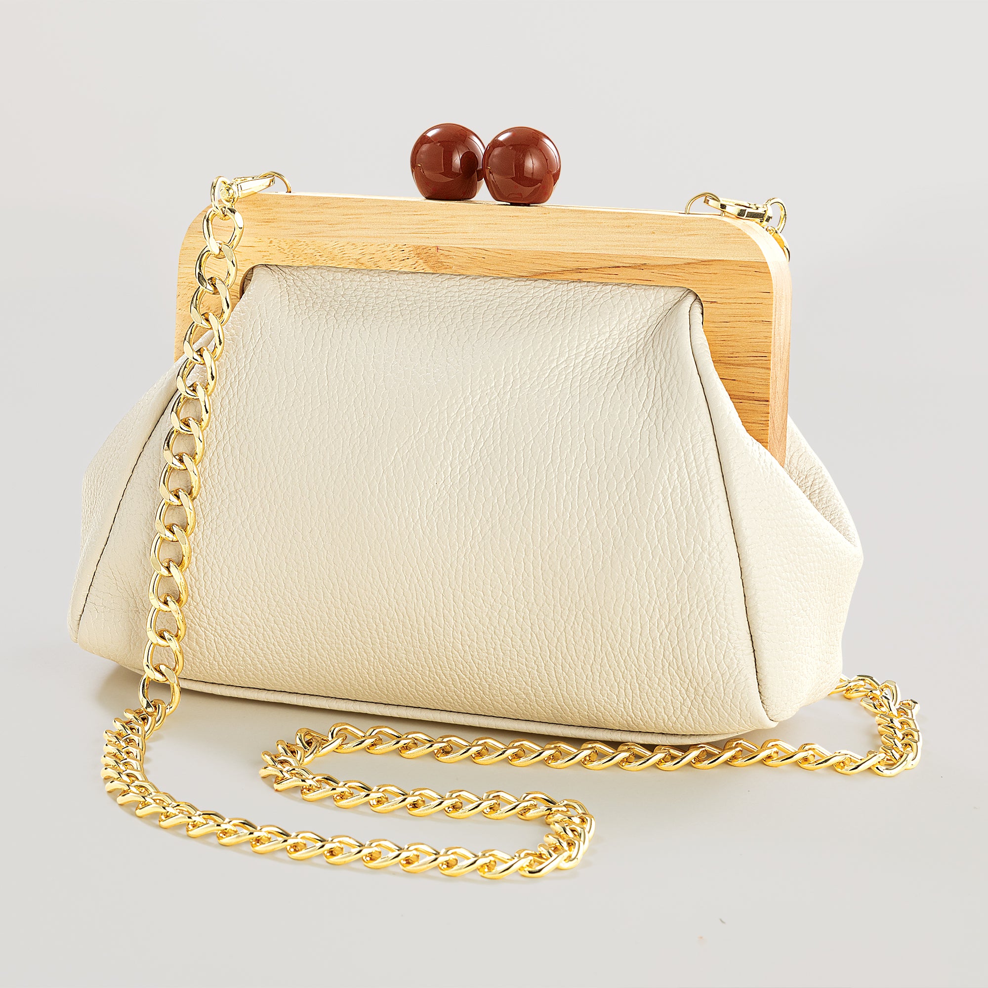 Artisan Marco of Florence designs this retro style clutch with a wood frame and supple ivory Italian leather. Approx. 9'' x 2.25'' x 7'', it features a 20'' removable gold chain strap, is black cloth lined, has one inside zipper compartment, and a magnetic tortoise shell kiss lock closure.