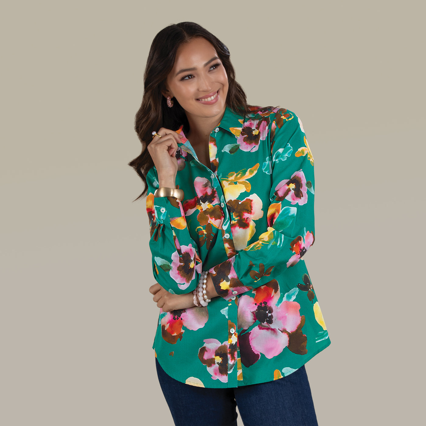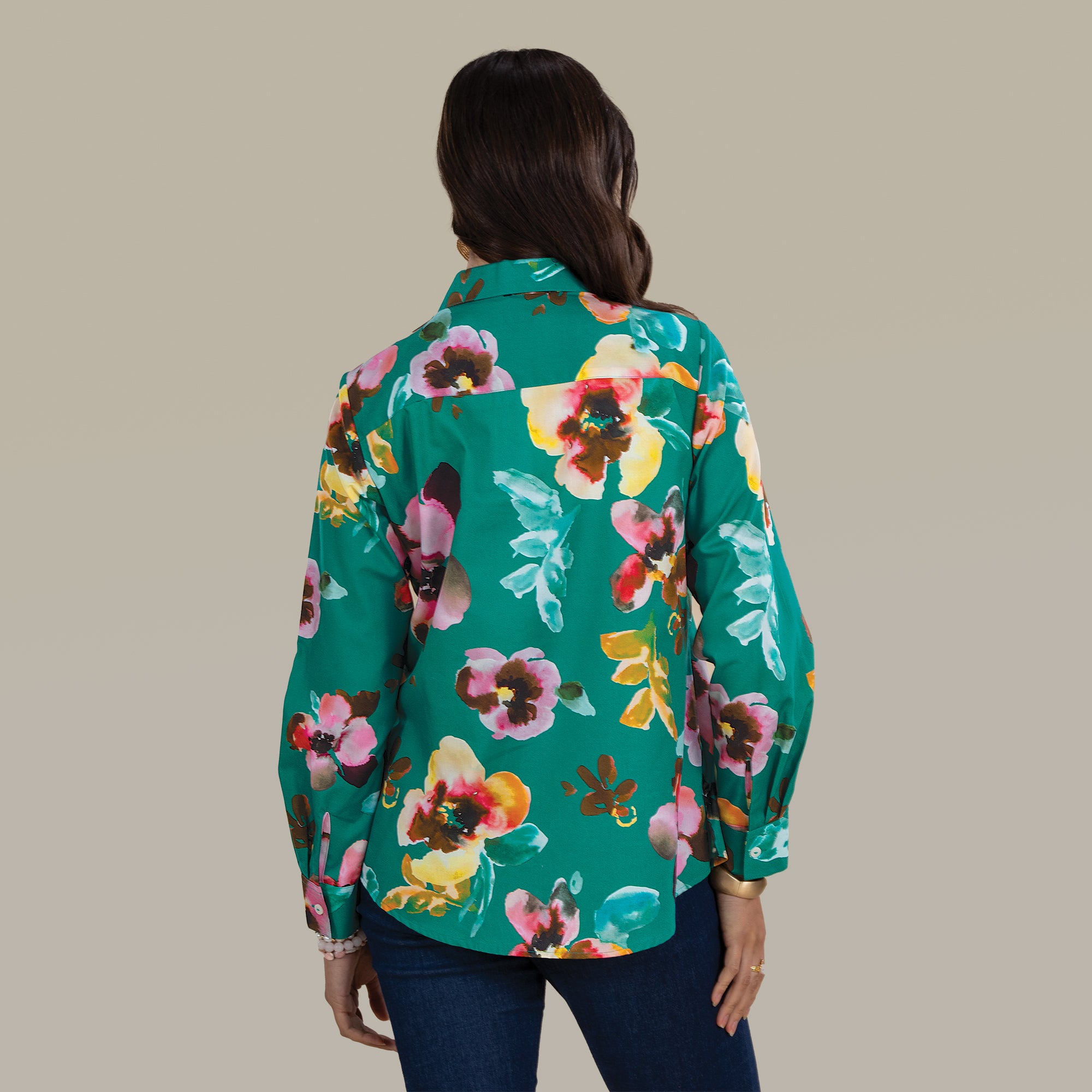 Artisan Becca of NYC designs this beautiful blouse with vibrant and detailed pansies against an emerald green background. This button-down top features a notched lapel collar, long sleeves, and is made of 100% wrinkle-free, cotton poplin. Machine wash with like colors. Available in S-6, M-10, L-14, XL-18, 1X-20, 2X-22, 3X-24.