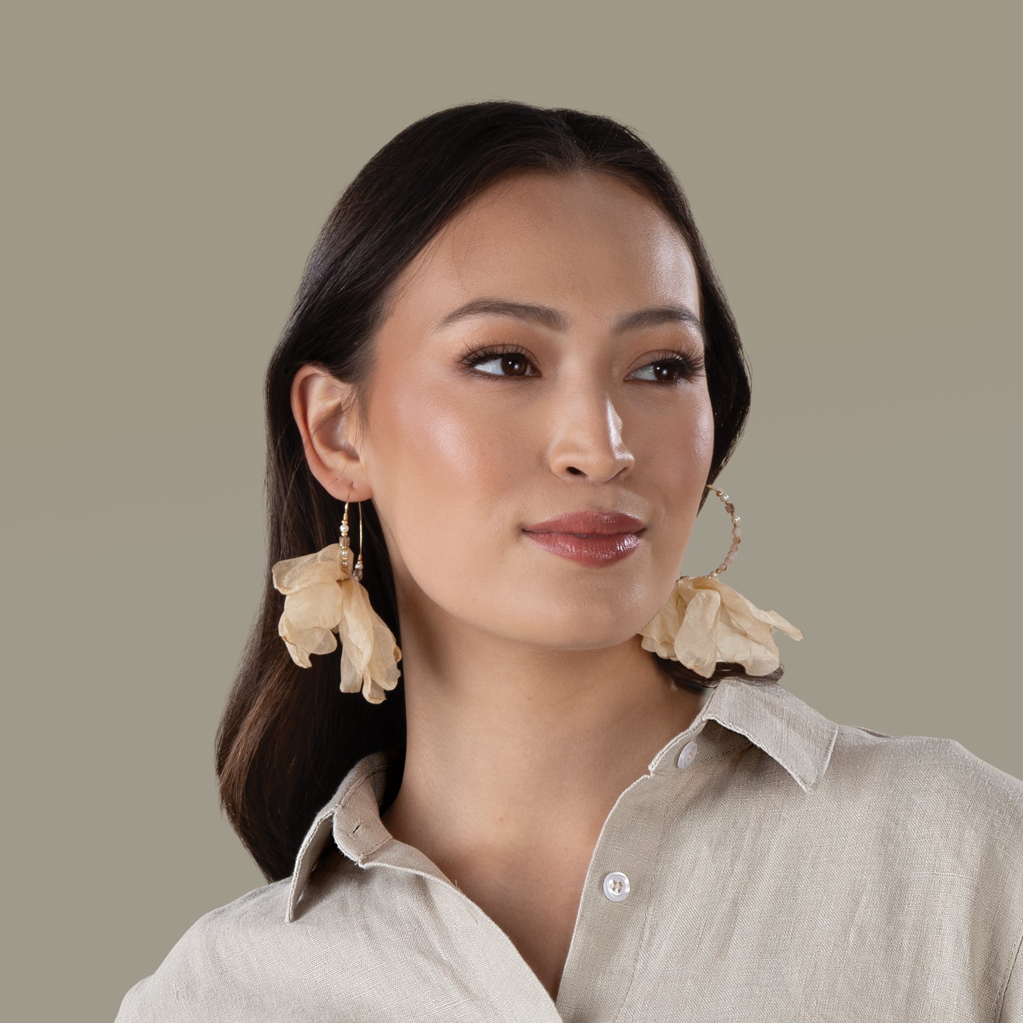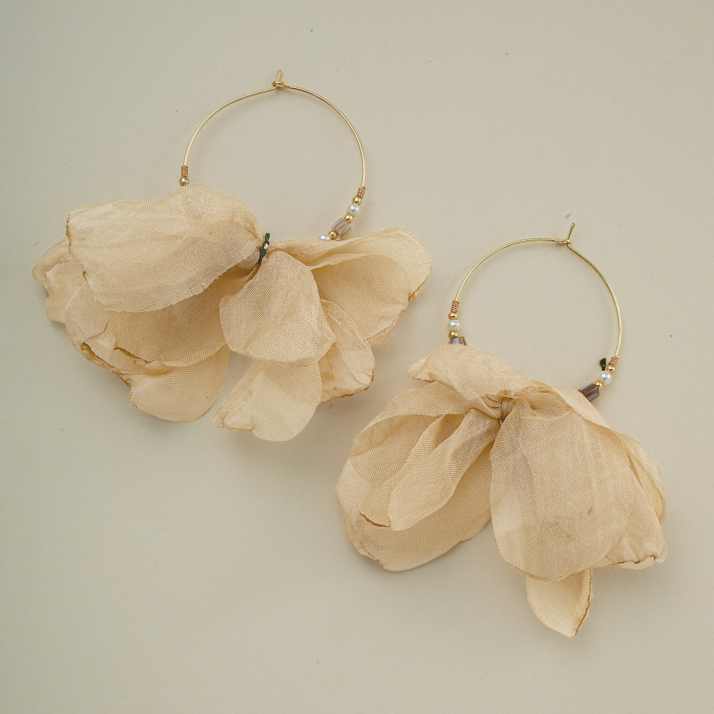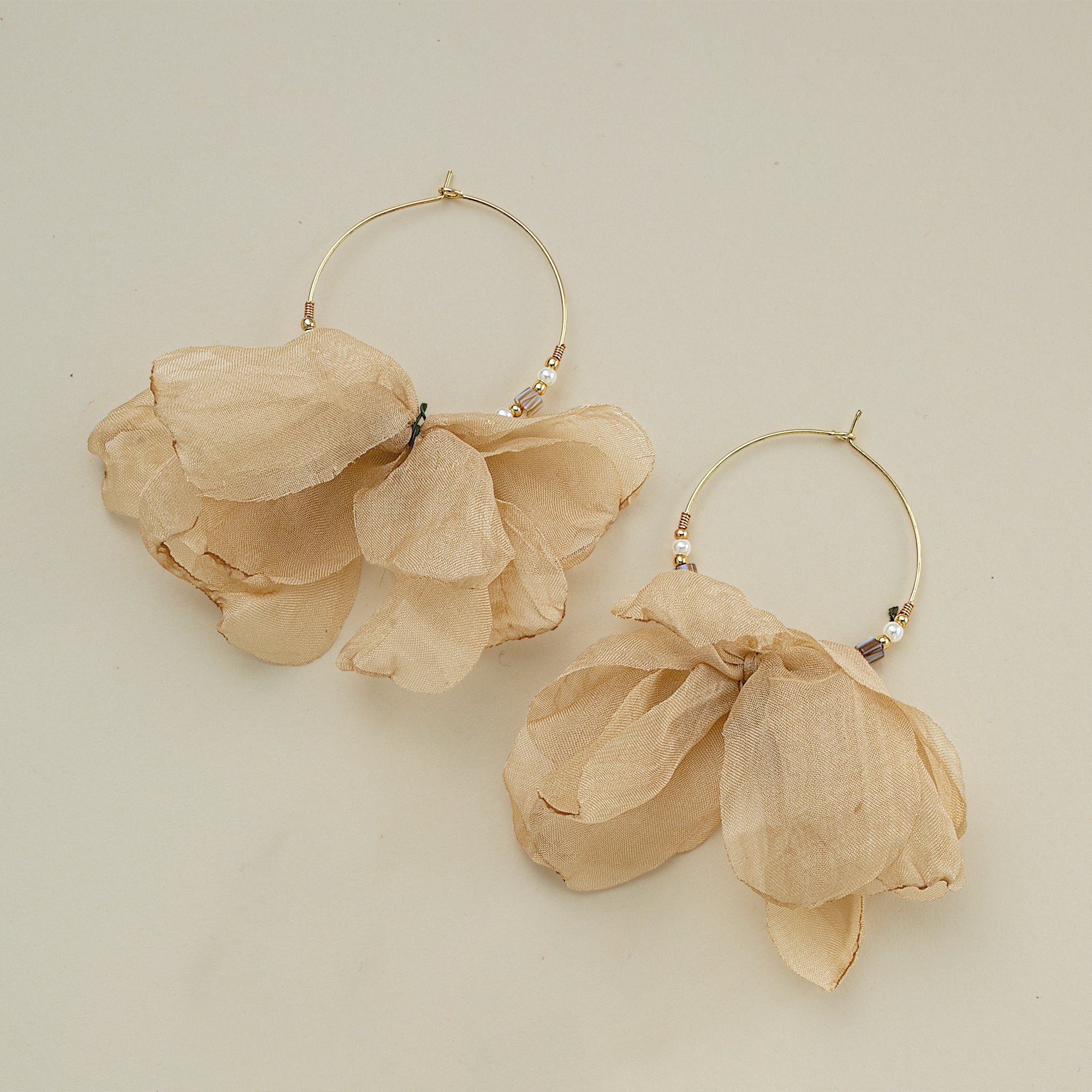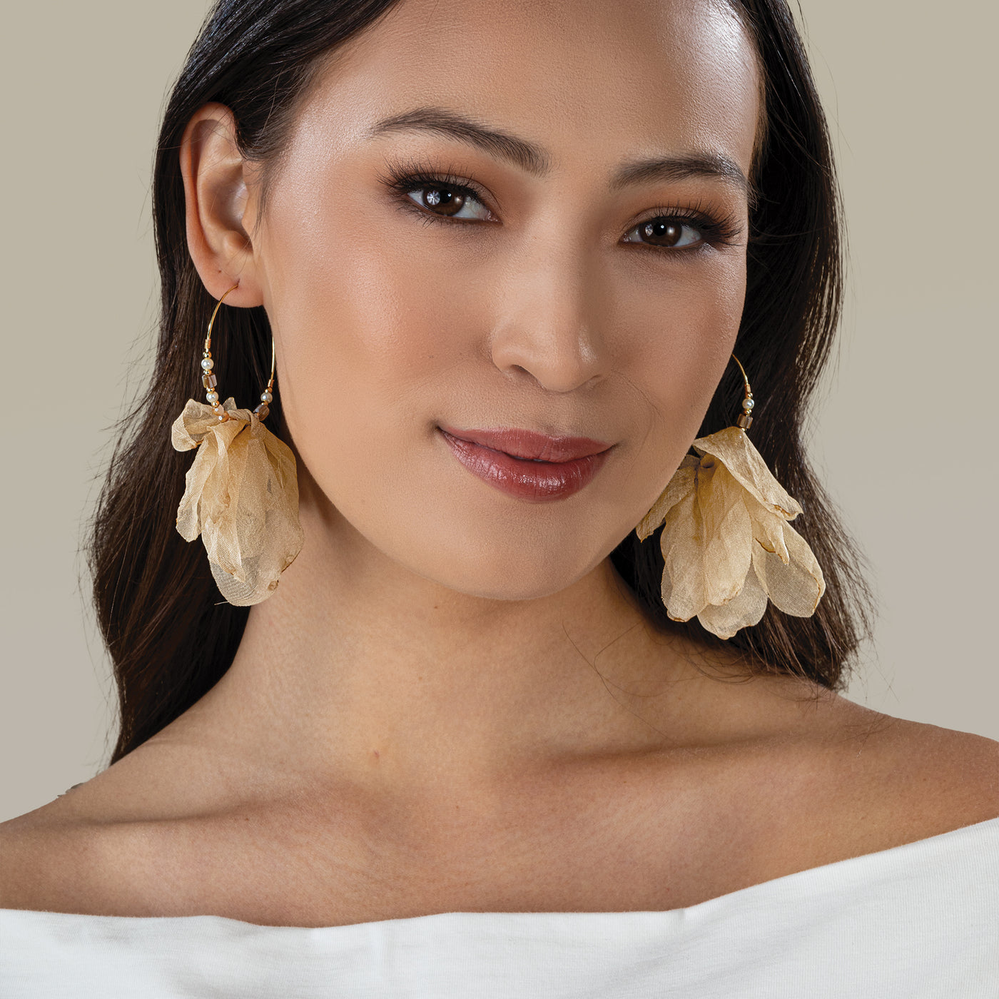 Artisan Vivian of Texas designs these floral petal earrings that resemble gossamer wings. Bordered with complementary beads on lightweight hoops. Designed in Texas, made in Thailand. Approx. 3.5'' dia.