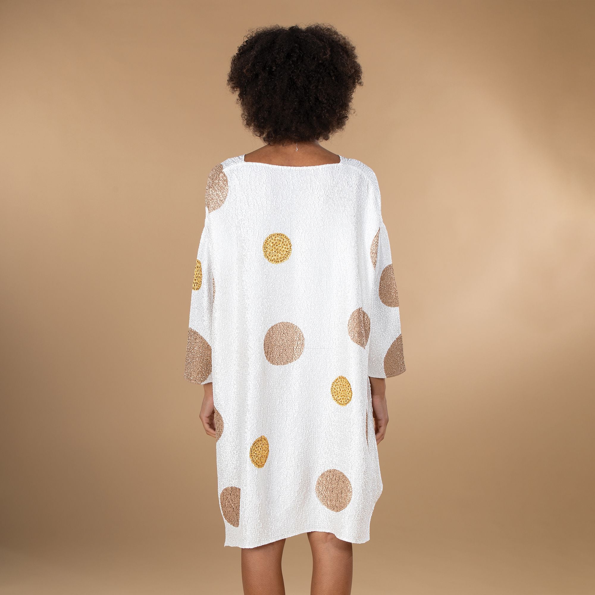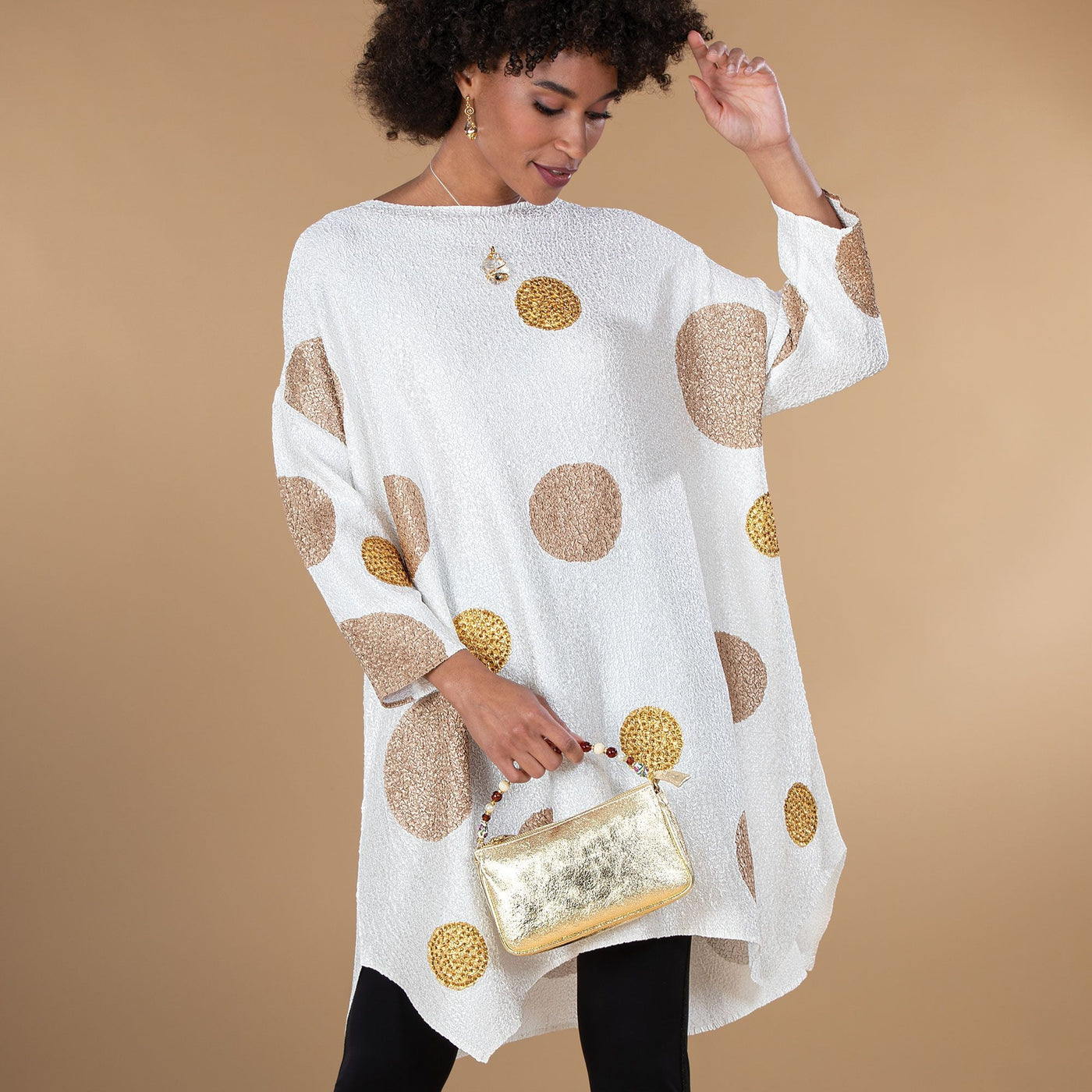 With nearly 40 years of experience, this NYC-based artist transforms hand-illustrated designs into vibrant, head-turning garments. A graduate of Moore College of Art in Philadelphia, her journey began unexpectedly—with a quick sketch for Saks that turned into a full collection. Each piece is crafted in collaboration with skilled tailors overseas, using specialty fabrics like machine-crinkled textiles adorned with custom prints and intricate beading.