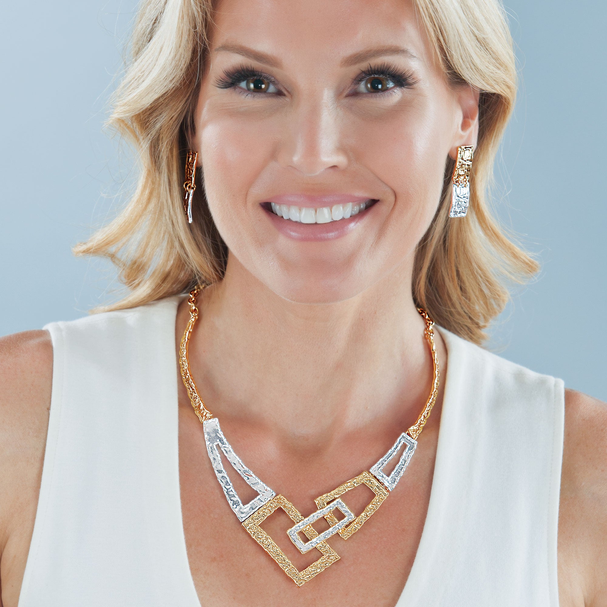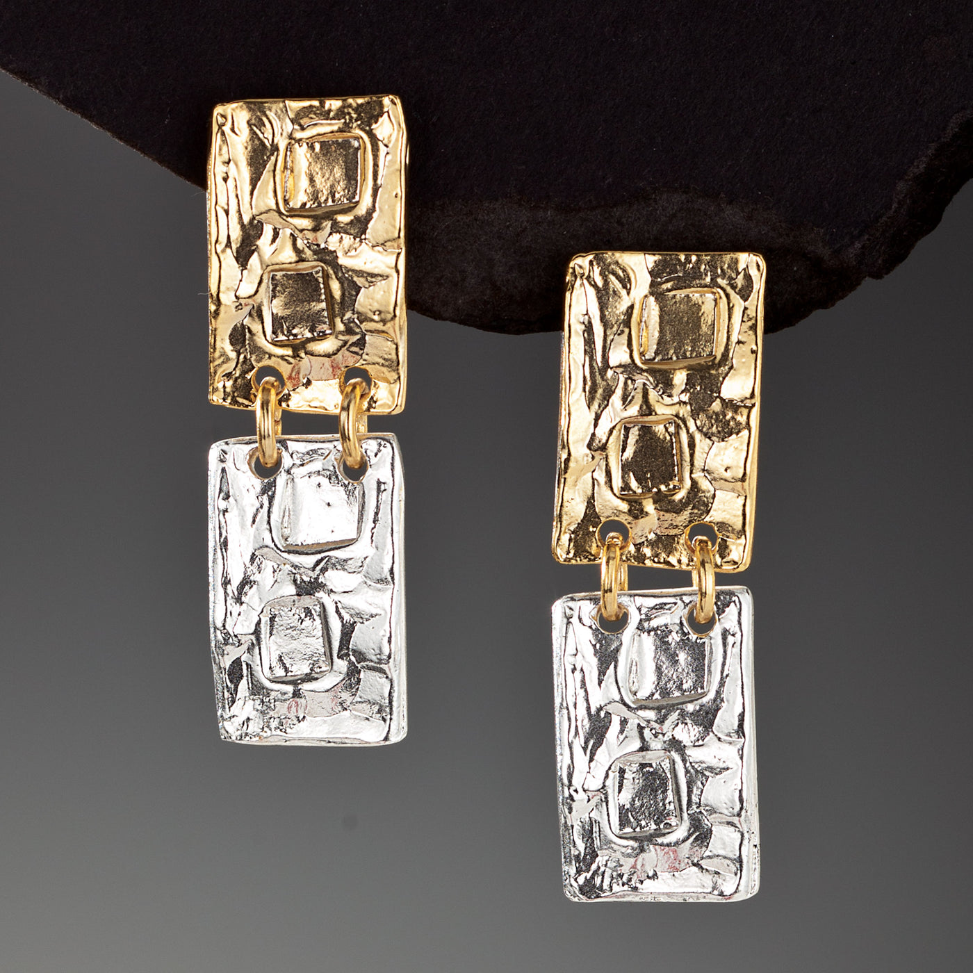 Using a combination of geometric cut-outs plated in either sterling silver or 24k gold, our French jeweler handcrafts each ornate statement piece in her Parisian workshop. To give each piece of jewelry a subtle texture, she lightly hammers the metals, one at a time. Handcrafted exclusively for Uno Alla Volta, from the heart and hands of the artisan. Dimensions - 1.5 inches long, posts.