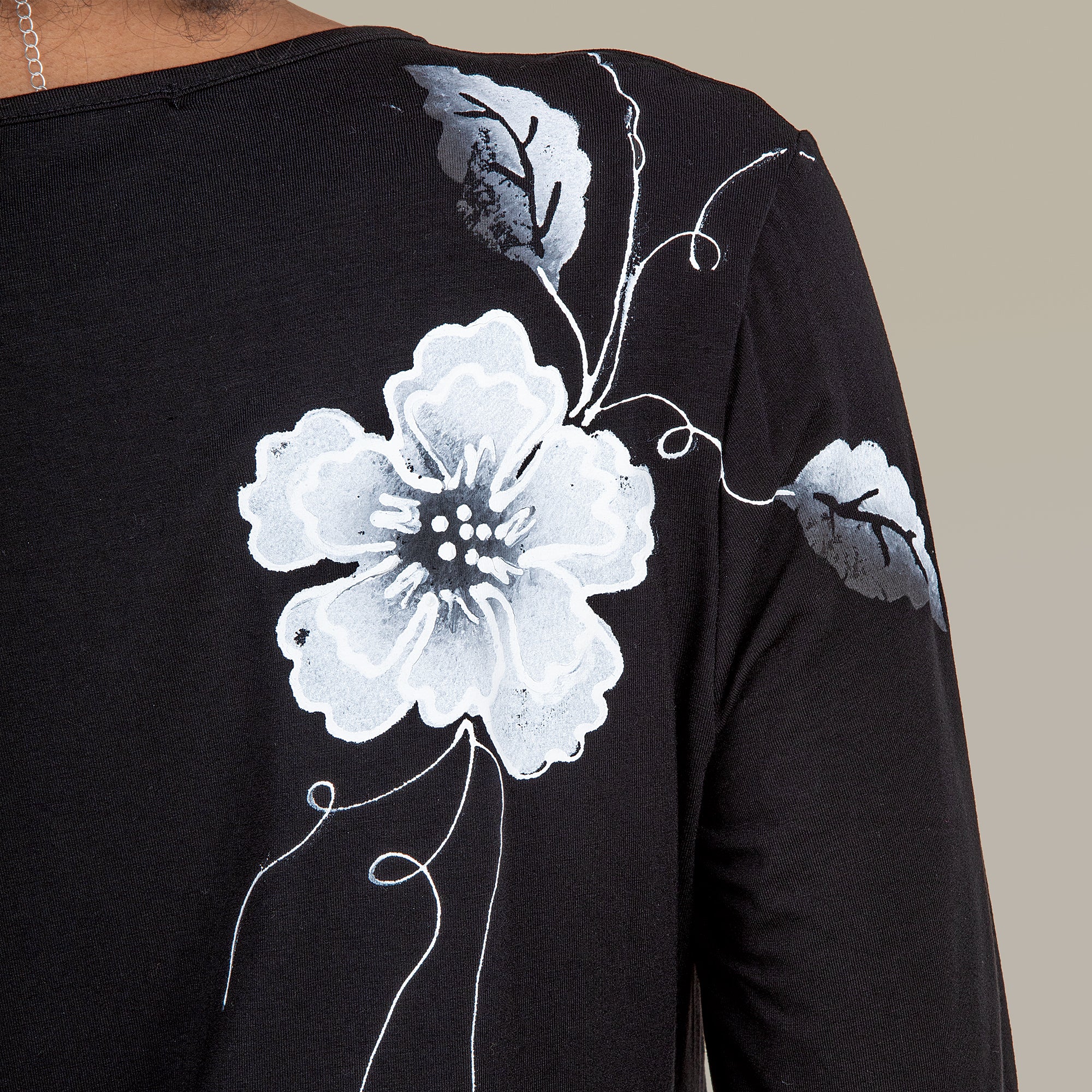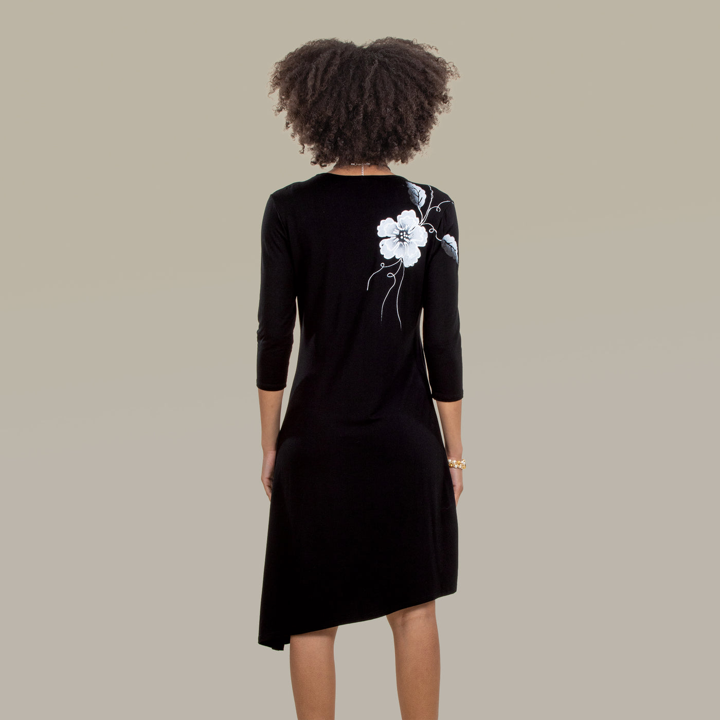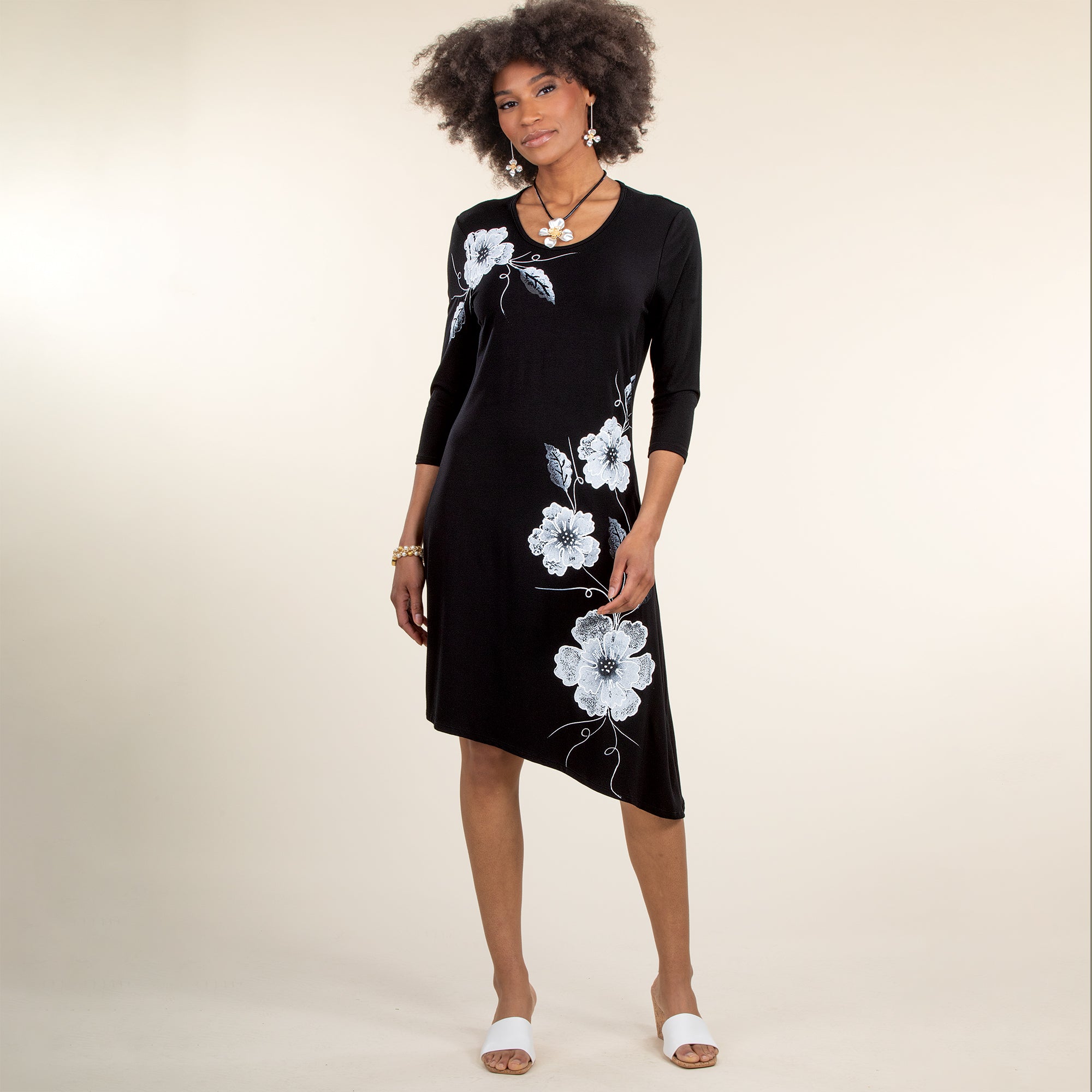 Raffi of Los Angeles creates this original floral design with shapes cut, painted, then applied, by hand, to shoulder and down the side of this black and white dress. 3/4-sleeves scoop neck, angled hem. Handcrafted exclusively for Uno Alla Volta, from the hearts and hands of artisans. Knit rayon and spandex. Machine wash with like colors. Available in: S 6-8, M 10-12, L 14-16, XL-18, 1X-20, 2X 22-24, 3X 26-28.