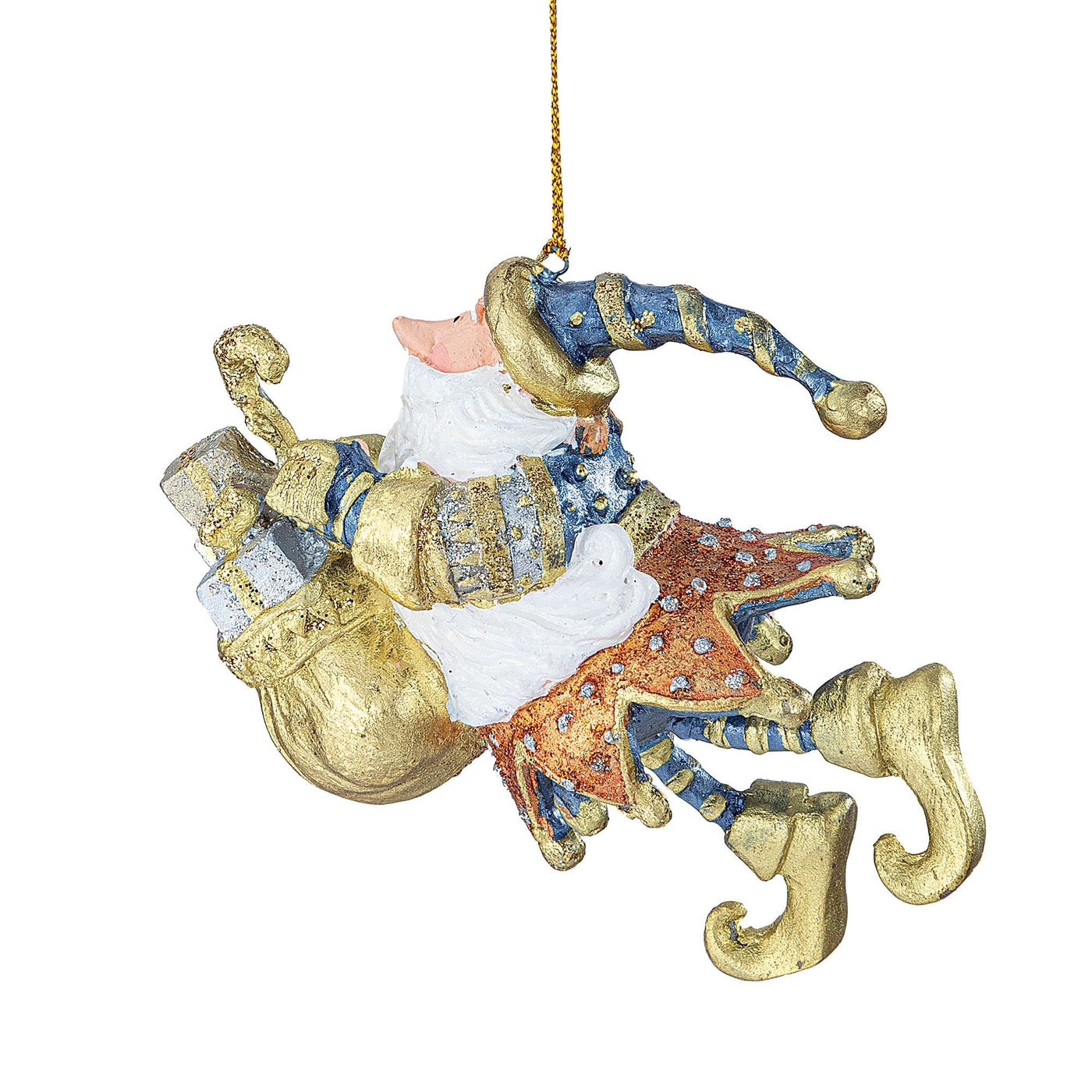Our Filipino artisans draw inspiration from fabric patterns when creating the original molds for their lushly textured ornaments. Each is hand-finished and painted with glittering details. This adorable Santa is dressed in blues and golds, toting his bundle of gifts and holding a candy cane. Approx. 3'' x 4''.