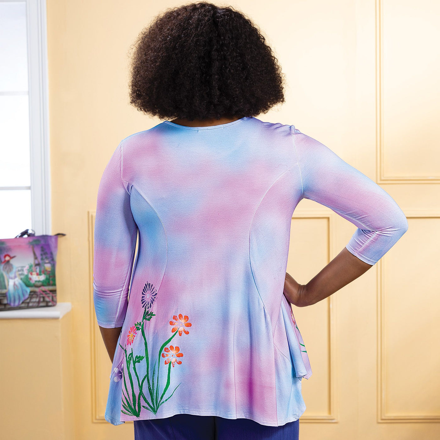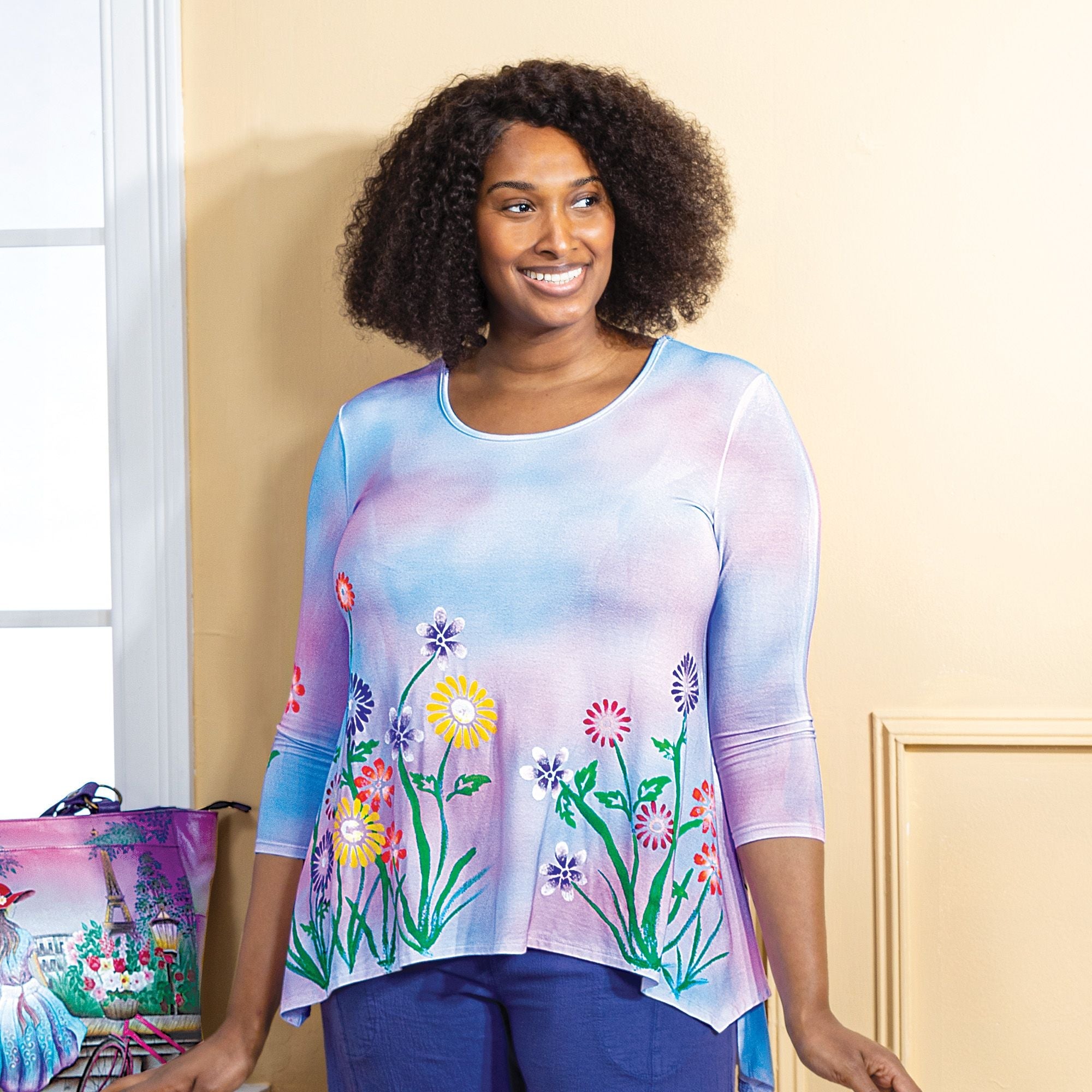 Hand-painted spring flowers dance against a rosy, baby blue backdrop on this asymmetric hem top, exclusive to Uno Alla Volta. Each is an original masterpiece created through a multi-step process in which intricate shapes are cut, painted, and then stamped by hand onto the fabric to create the design. Knit rayon and spandex. Pre-shrunk for a perfect fit. Machine wash and dry. Do not bleach. Available in: S 6-8, M 10-12, L 14-16, XL-18, 1X, 2X, 3X.