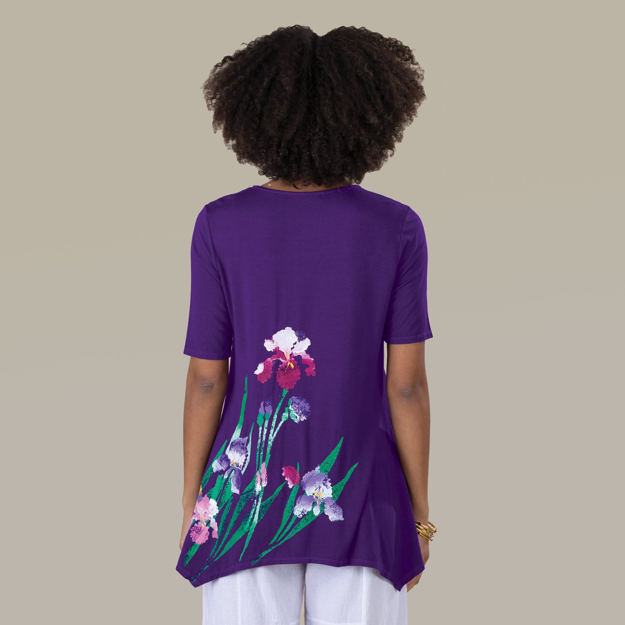 Our iconic artisan, Raffi of Los Angeles, designs this beautiful blouse with hand-painted irises that dance across the bottom and rest on the shoulder of this rich purple top. Handcrafted exclusively for Uno Alla Volta, from the hearts and hands of artisans. Elbow length sleeves, scoop neck, asymmetrical hem, rayon and spandex blend. Available in: S 6-8, M 10-12, L 14-16, XL-18, 1X-20, 2X 22-24, 3X 26-28.