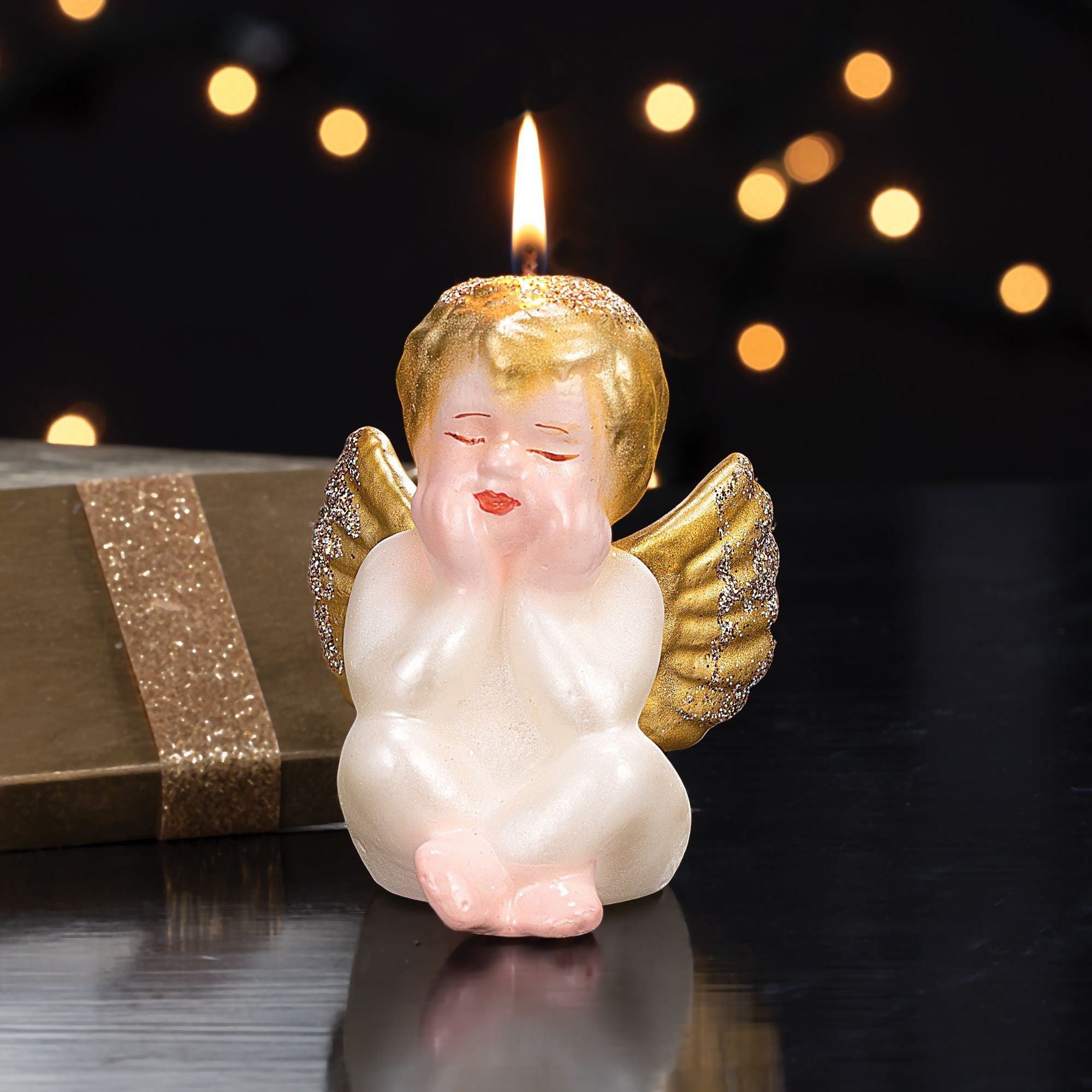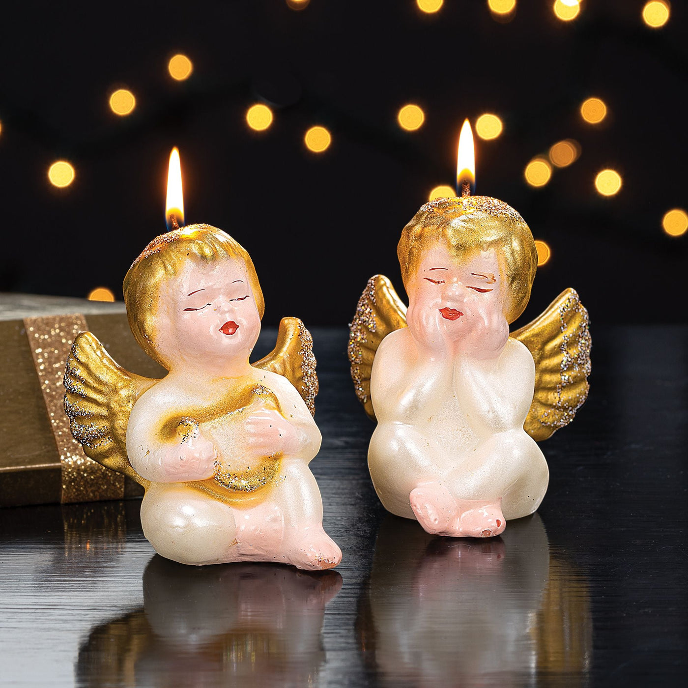 In their family's sixth-generation workshop, artisan brothers Vincenzo and Rossella of Italy use original molds to handcraft each gold and white cheerful cherub candle from natural paraffin wax. Approx 4'' each. Unscented.