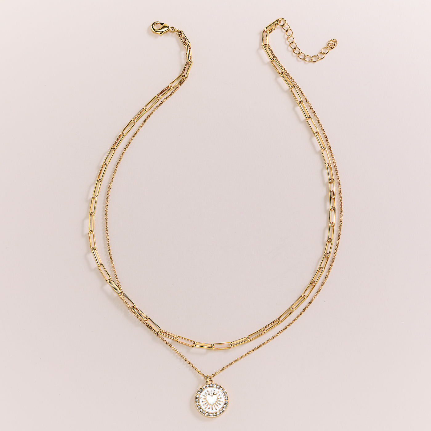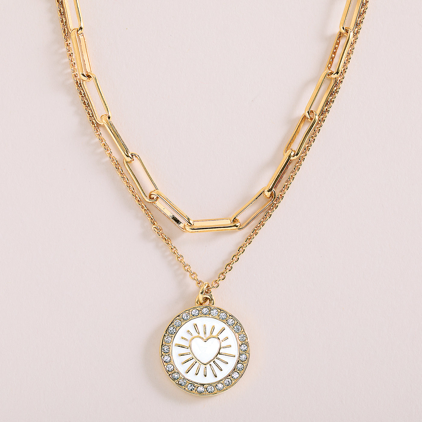 Our jeweler, Daniel Lyons Of London handcrafts this double strand necklace, one featuring an enamel and Czech crystal-encrusted heart medallion, the other in a link style strand that complements the medallion. Set in gold-plated brass. A beautiful piece that can be worn or gifted any day of the year or for any occasion. Handcrafted exclusively for Uno Alla Volta, from the hearts and hands of artisans. Approx. 17.5'' long, 2'' ext., 0.5'' dia medallion, lobster claw clasp.