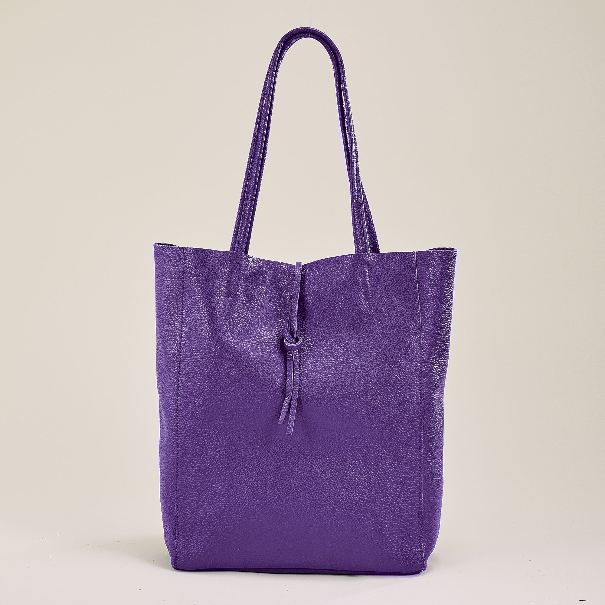 Crafted in Italy of the finest Italian leather in a rich shade of purple, this roomy tote is the perfect size and shape for every day use. Handcrafted for Uno Alla Volta, from the heart and hands of the artisan. Dimensions - 10.5'' x 4.5'' x 14.5'', 10'' handles, unlined, zipper pouch, tie closure.